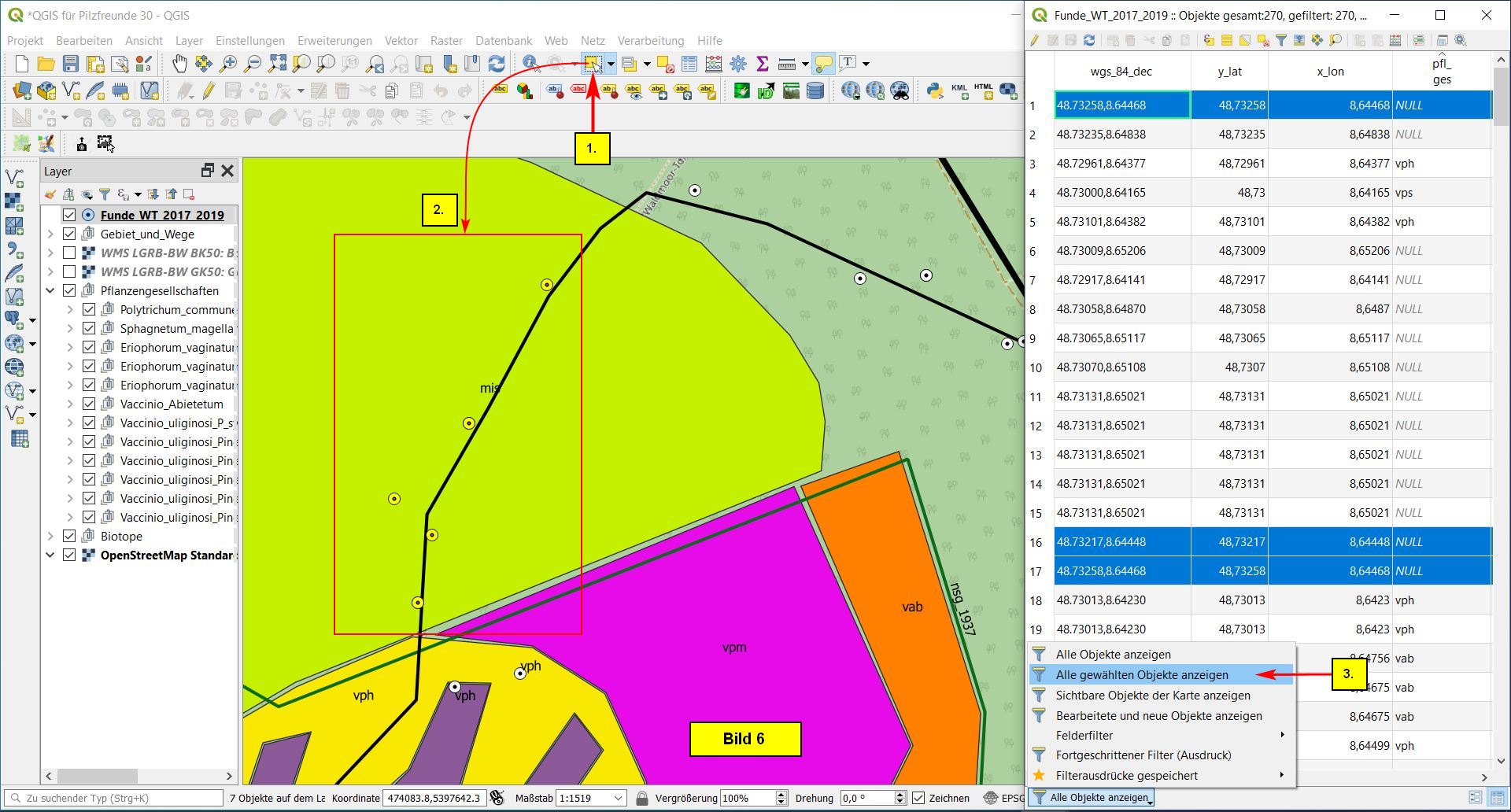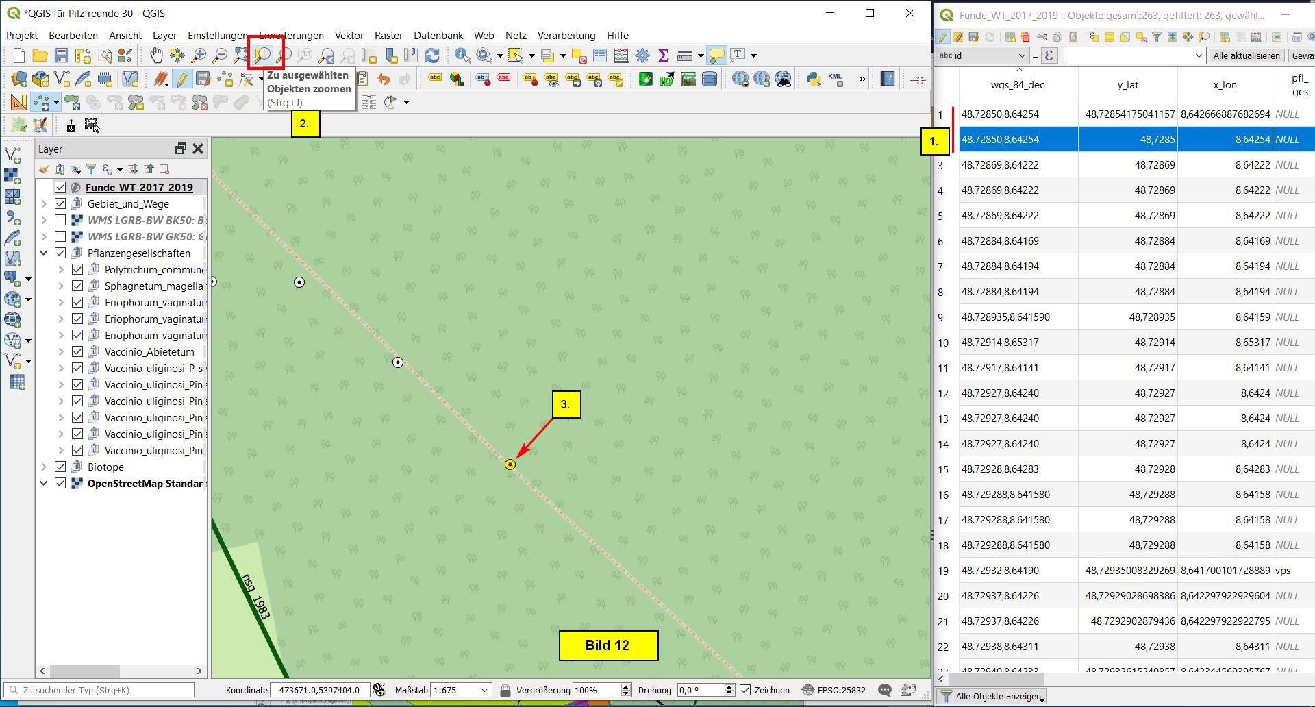 Nun in der Attributtabelle eine der beiden Zeilen selektieren (1.) des ersten Mehrfachfundes clicken. Dann das Werkzeug Zu ausgewählten Objekten zoomen (2.) clicken. Daraufhin wird dieser Fund ins Bild gerückt (3.). Wir können jetzt den Editiermodus aktivieren: