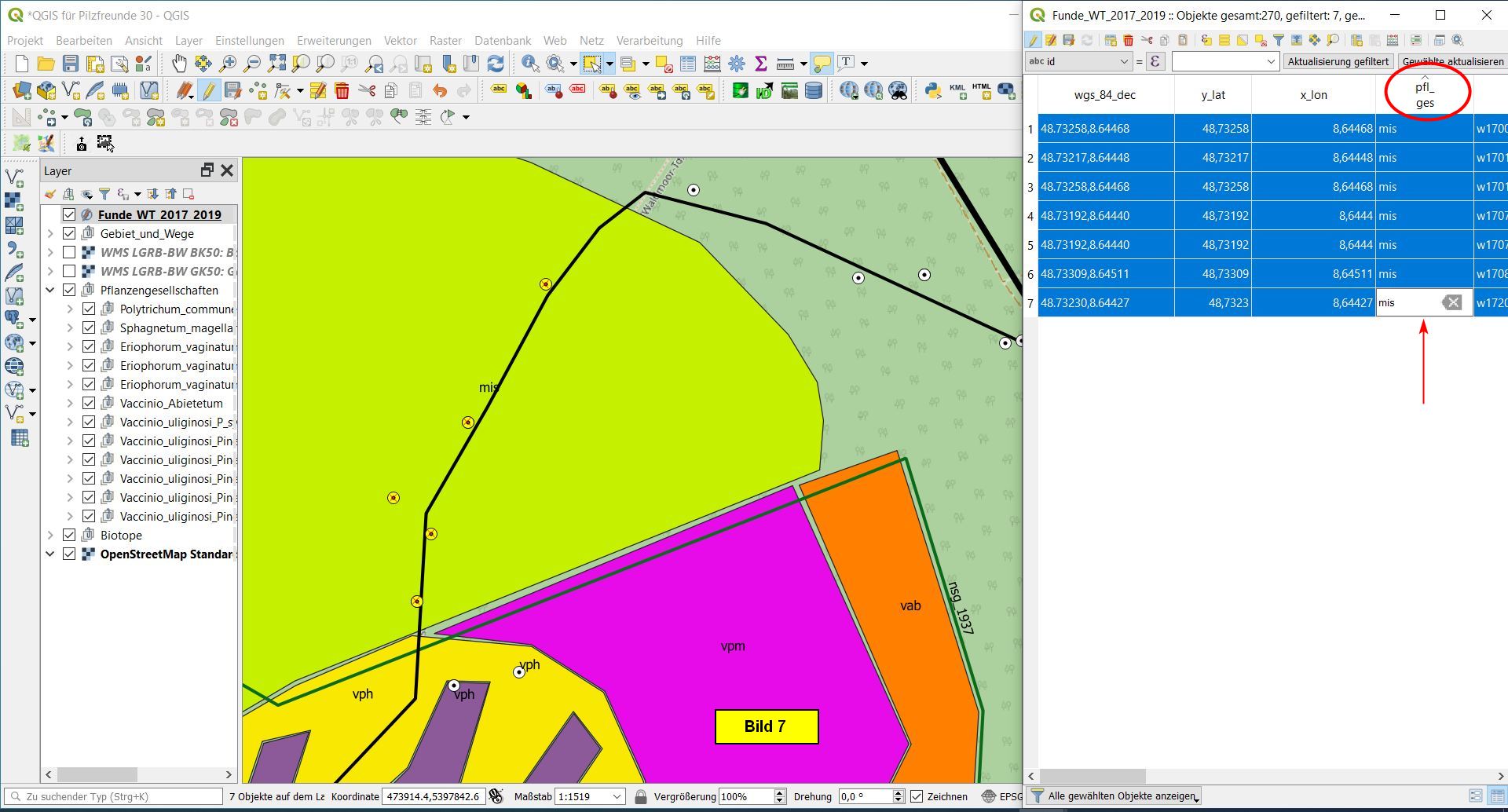 Wenn man bei der Kartierung vor Ort vergisst, einem Fund seine Pflanzengesellschaft zuzuordnen oder wenn man eine falsche PflGes zuordnet, kann man dies hier nachträglich korrigieren. Im folgenden Beispiel werde ich einige "vergessene" Pflges nachtragen.
