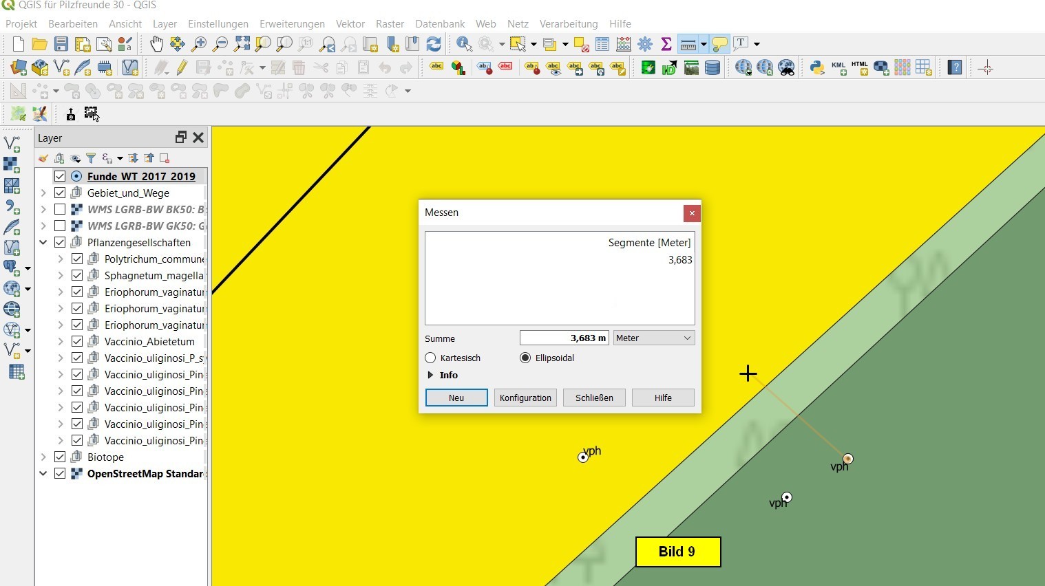 Durch die GPS-Unschärfe von bis zu plusminus 15 Metern liegen einige Fundpunkte im Kartenfenster falsch. Da vor Ort während der Fundeingabe die Pflanzengesellschaft korrekt eingegeben wurde, kann man im Kartenfenster ablesen, in welchen Bereich der Punkt eigentlich gehört. Entsprechend ist der Fund zu verschieben. Das sei an folgendem Beispiel gezeigt (Randbereich zwischen den Bereichen vph (gelb) und vps (graugrün)). Die beiden innerhalb vps liegenden Fundpunkte tragen die Bezeichnung vph und sind mithin in den gelben Bereich zu verschieben. Das Linien-Messwerkzeug zeigt, dass ihre Entfernung dorthin etwa 3,5 Meter beträgt. Es spricht also nichts dagegen, die Punkte nach Gelb zu verschieben:
