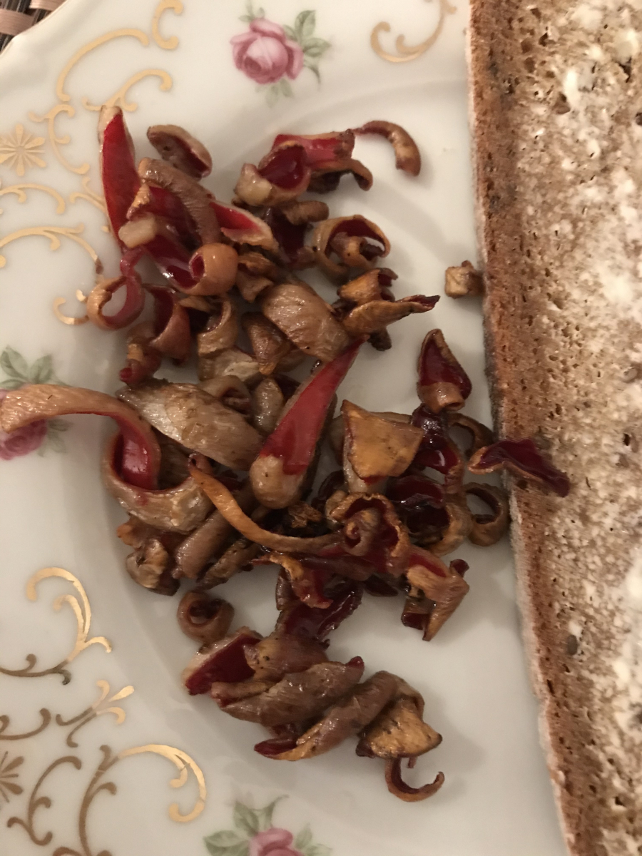 Am Ende haben wir ein paar wenige Exemplare entnommen und zu Hause verkostet, zwecks Feststellung des Speisewertes. Von dem Geschmack waren wir sehr überrascht. Sie haben unerwartet gut geschmeckt. Feste und nach dem braten krosse Konsistenz sowie angenehm pilzig würziger Geschmack, der ein bisschen an rauchblättrige Schwefelköpfe erinnert. Meine Schwester fand, dass sie auch als veganer Bacon durchgehen würden.