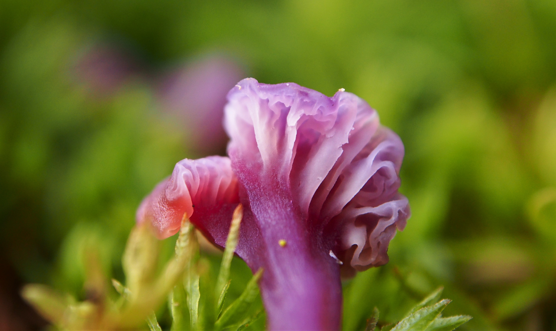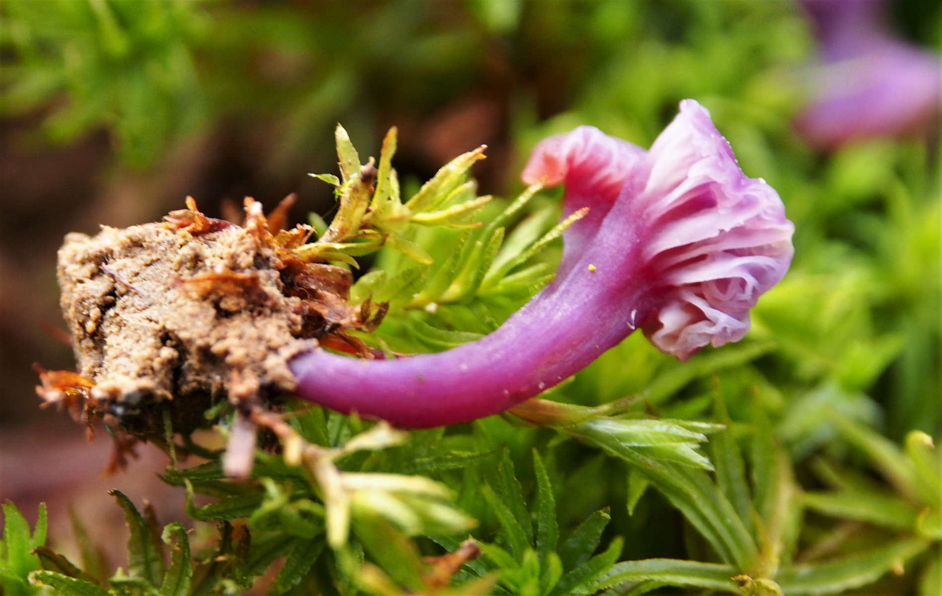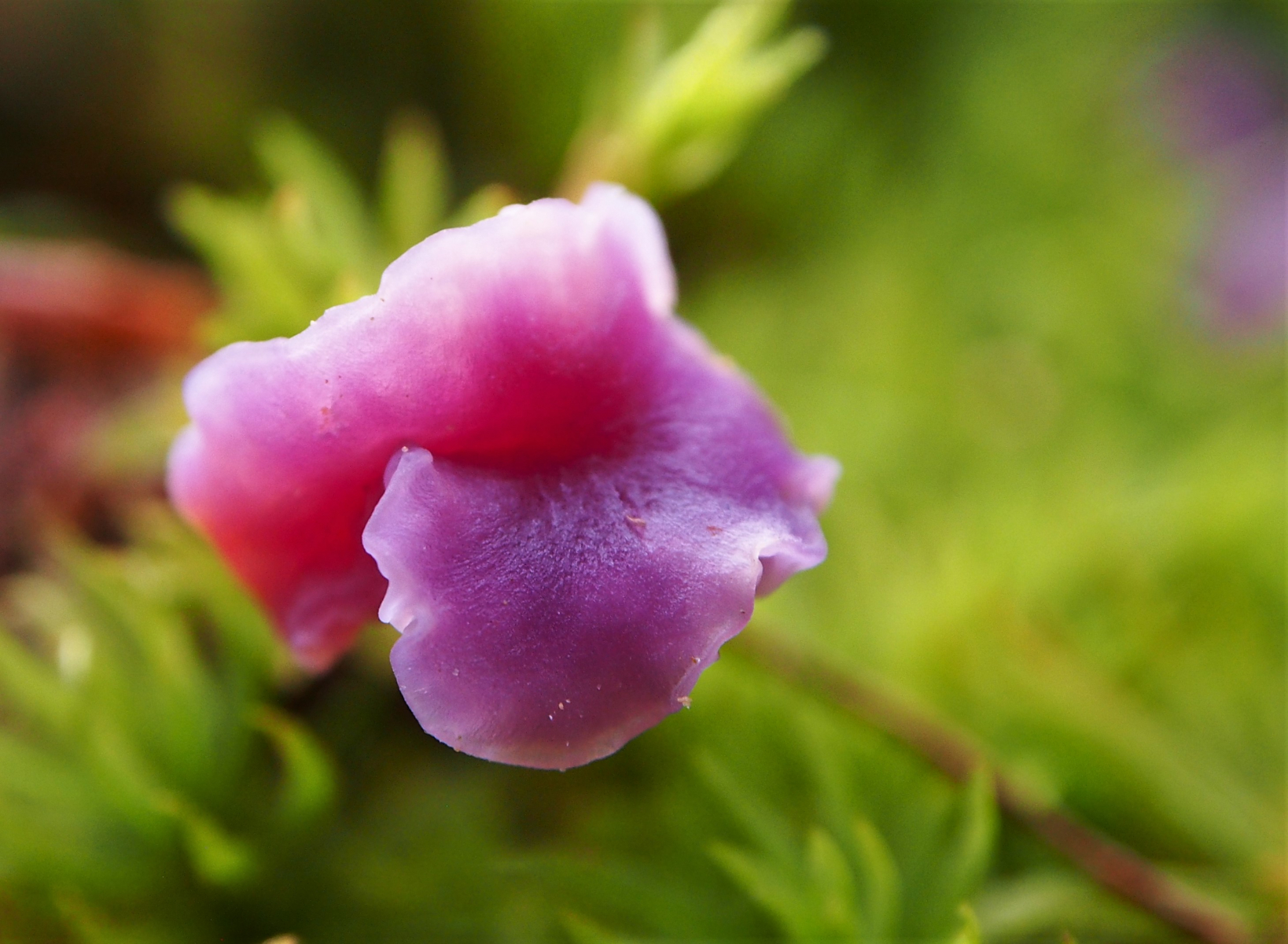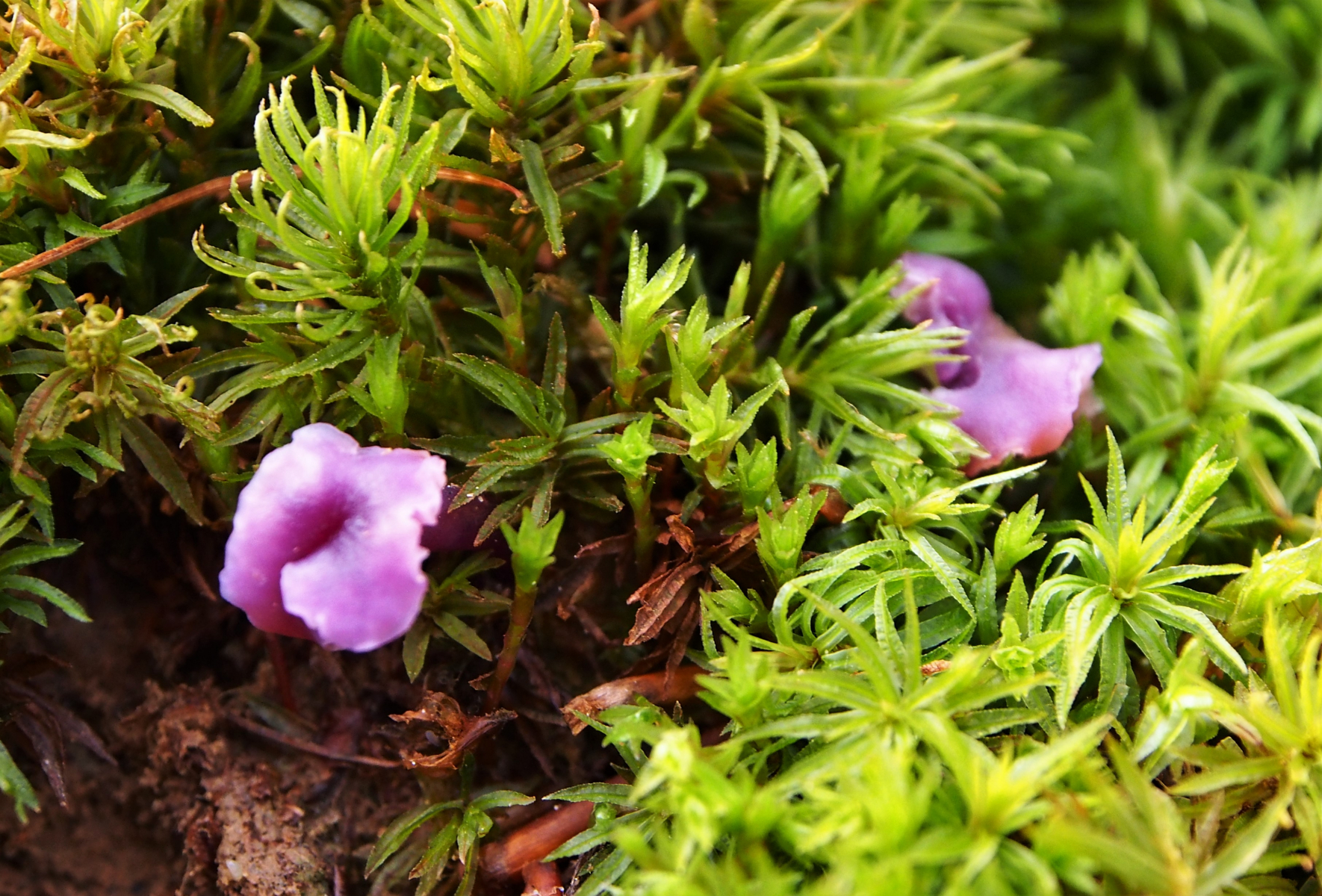 Mitten in einem Büschel Moos leuchteten mir zwei kleine lila Fleckchen entgegen. Der Boden ist dort sandig, meist sehr trocken, gerade aber gut durchfeuchtet, da es viel geregnet hat, kalkhaltig, Waldrand, relativ frei (vor Jahren abgeholzt), in der näheren Umgebung stehen Buchen, Hainbuchen, aber auch verzeinzelt Kiefer und Fichte.