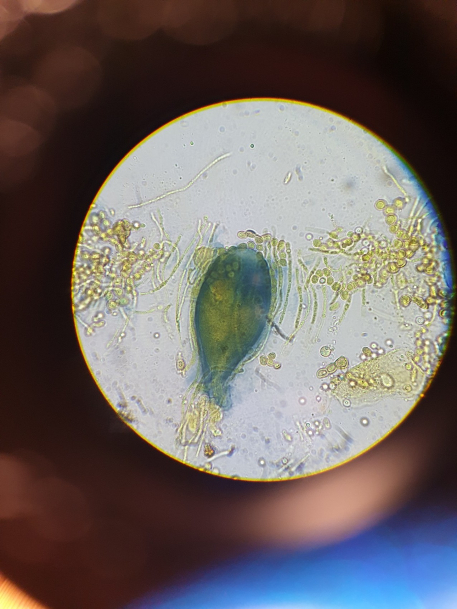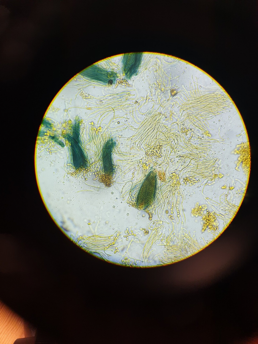 - Claussenomyces olivaceus ist ein kleines intensiv grünes Becherchen an Harz, das hatte ich dieses Jahr auch schon, hat in den Asci viele kleine rundliche Konidien und sieht daher oberflächlich ähnlich wie Sarea unterm Mikroskop aus, aber eben Farbe ganz anders, Asci sehr viel länger und nicht amyloid
