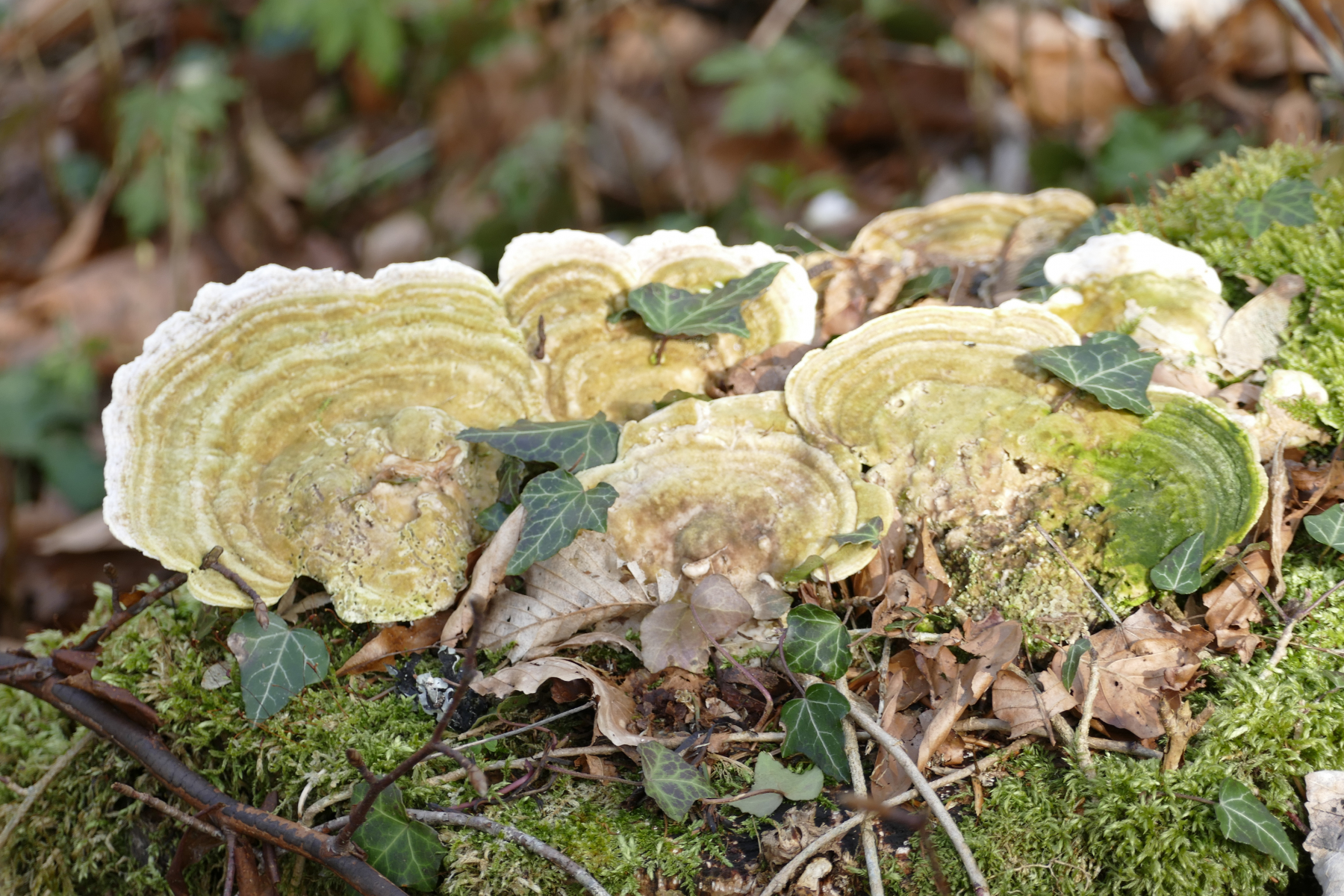 Die striegeligen Trameten über dem Windröschen sind Schmetterlinge mit sehr kleiner Option auf Ockertrameten.