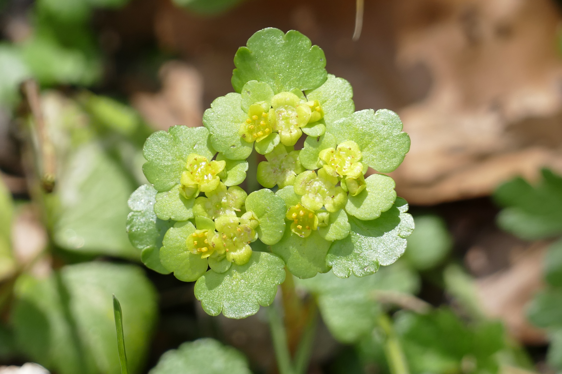 das Blümchen mit den unscheinbaren Blüten ist ein Milzkraut. Da gibt's eines mit gegenständigen Blättern und eins mit wechselständigen. Ich hab bisher immer nur die mit den wechselständigen gesehen.