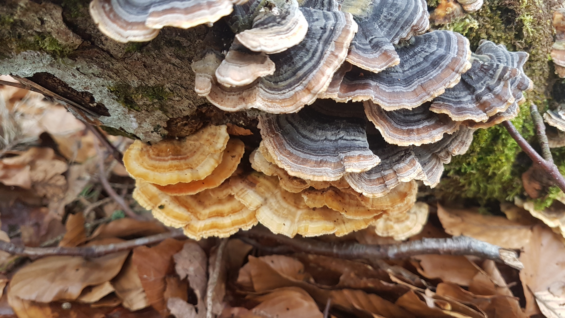 Nr 7: Ist dies die Schmetterlings-Tramete? Oder gibt es hier Verwechslungsmöglichkeiten mit einer großen blauschwarzen und samtigen Zone plus einer weißen bis gelblichen Unterseite?