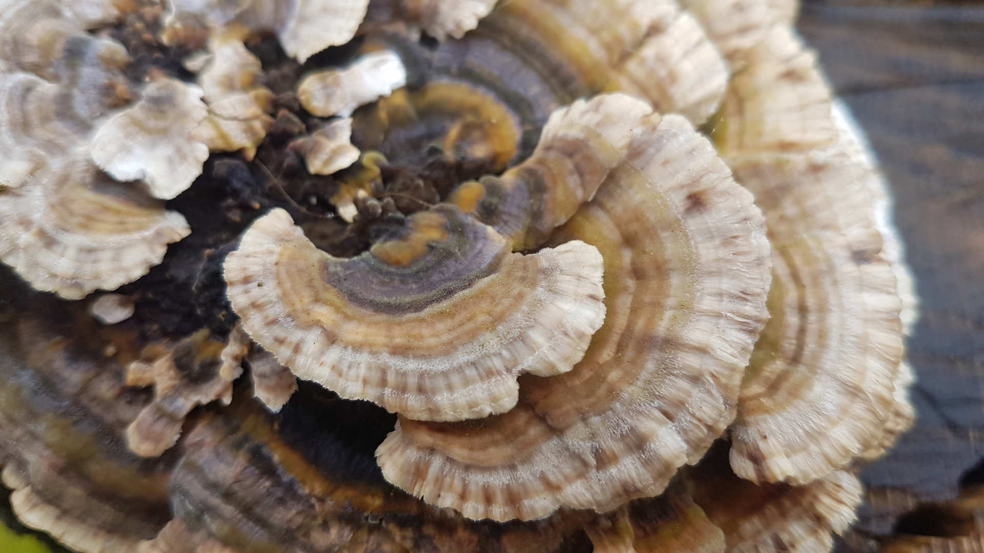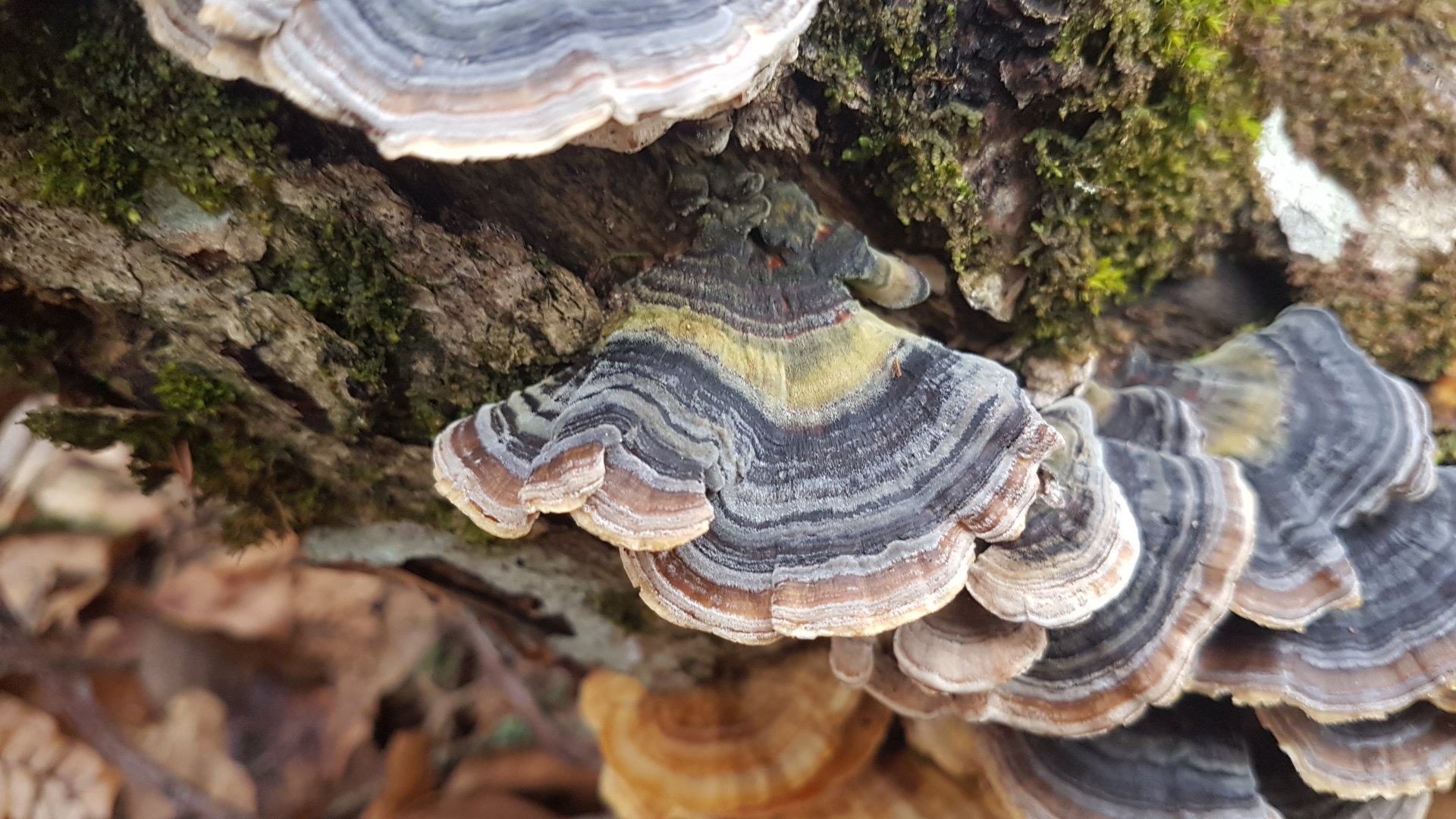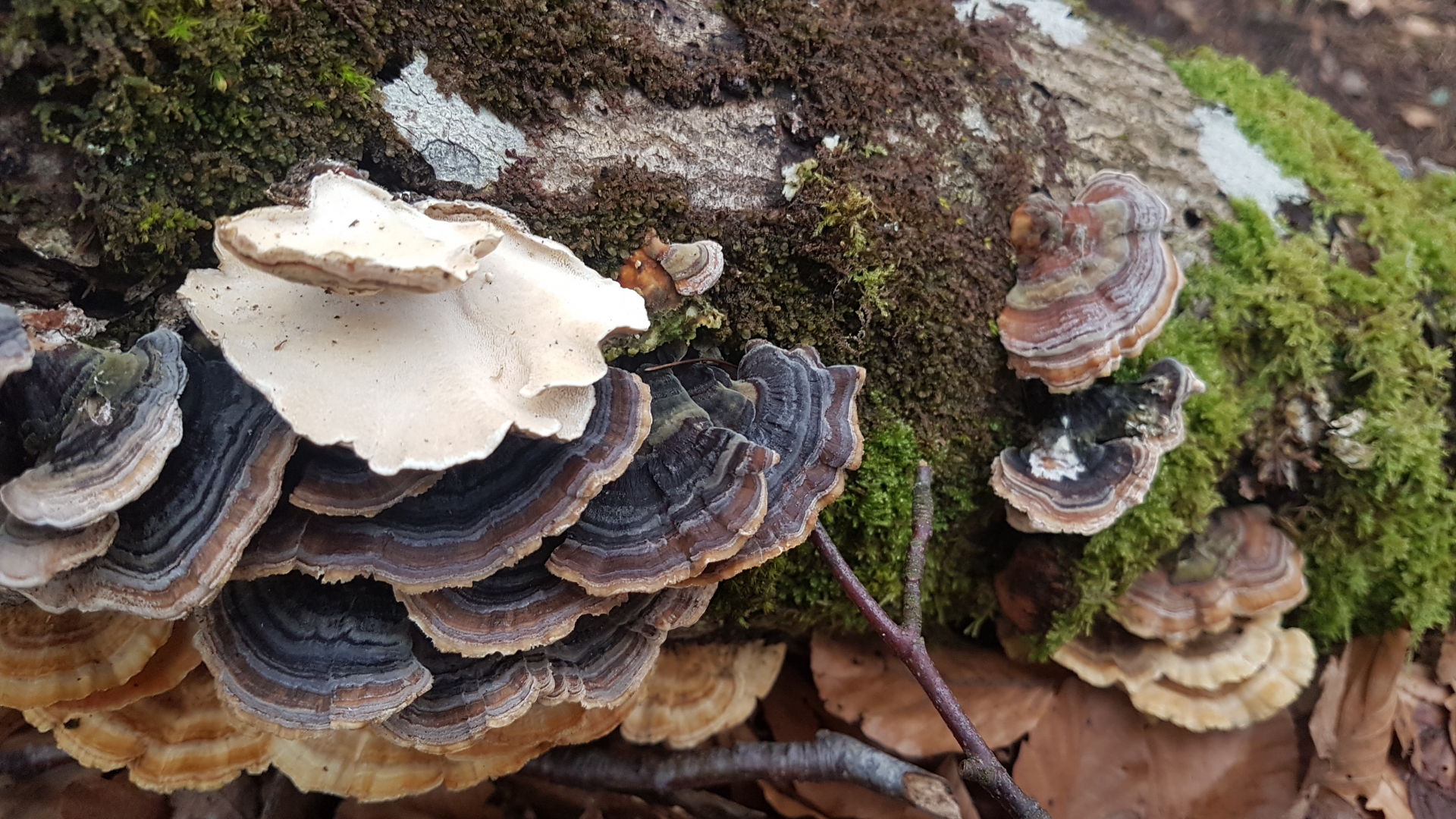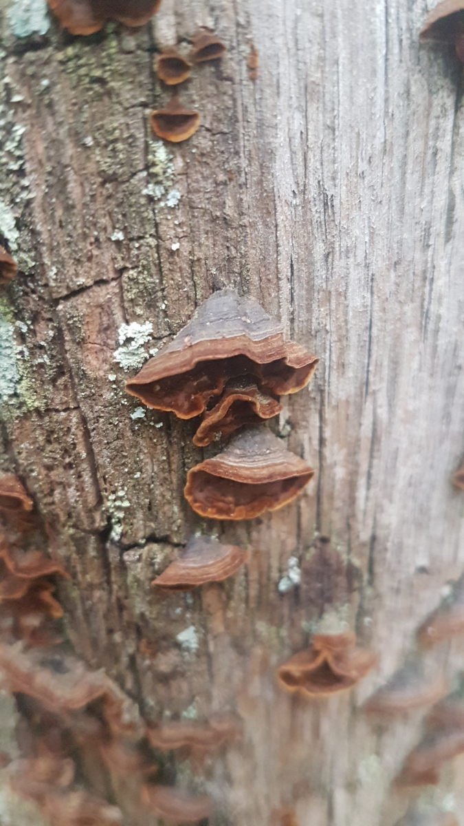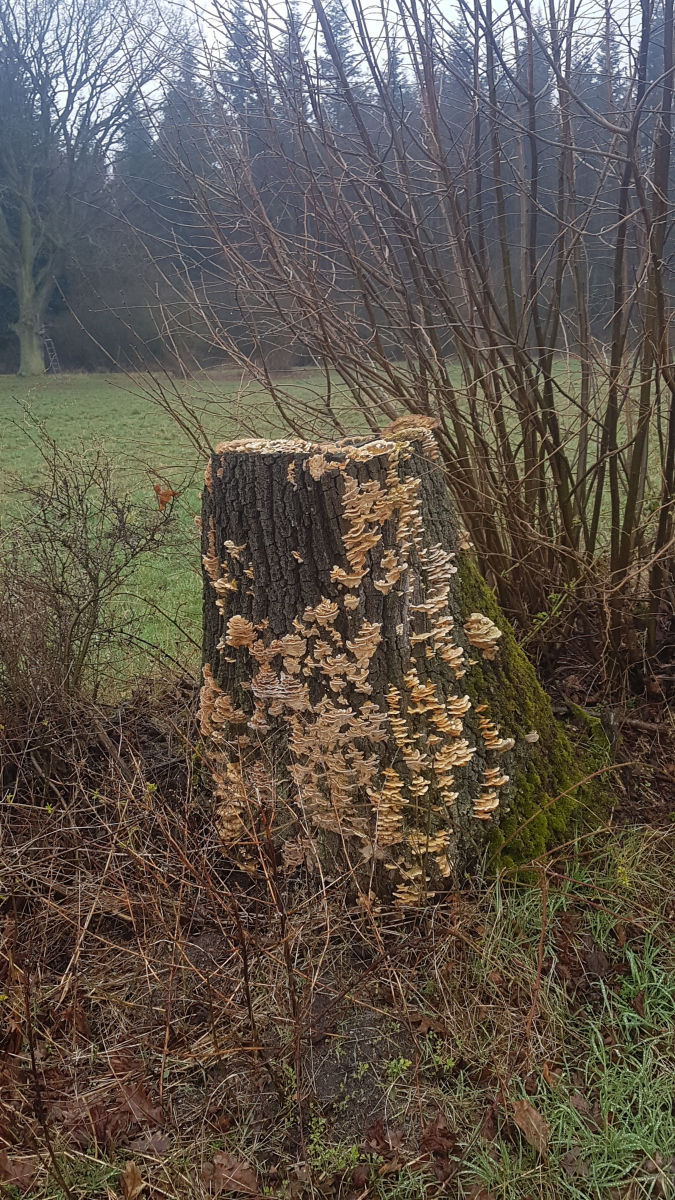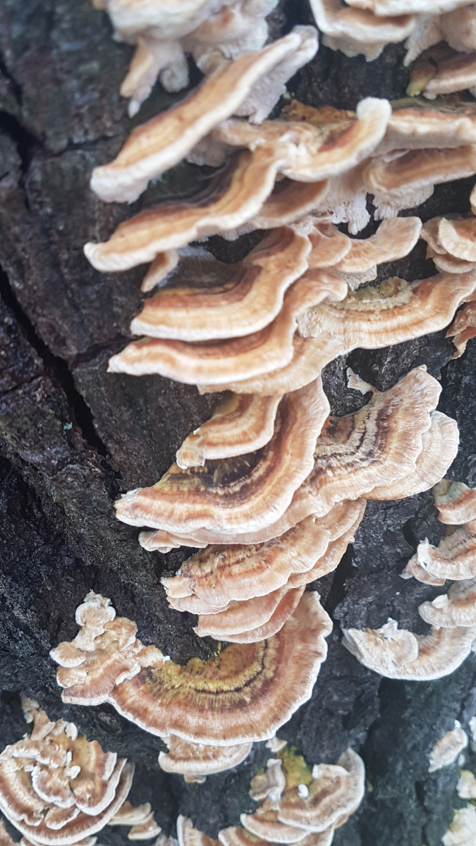 Nr 9: Trameten? Nur welche Art? Bin mir unsicher, ob alle Bilder dieselbe Art zeigen, sie wuchsen auf zwei nebeneinanderliegenden Stümpfen, vermutlich Eiche.