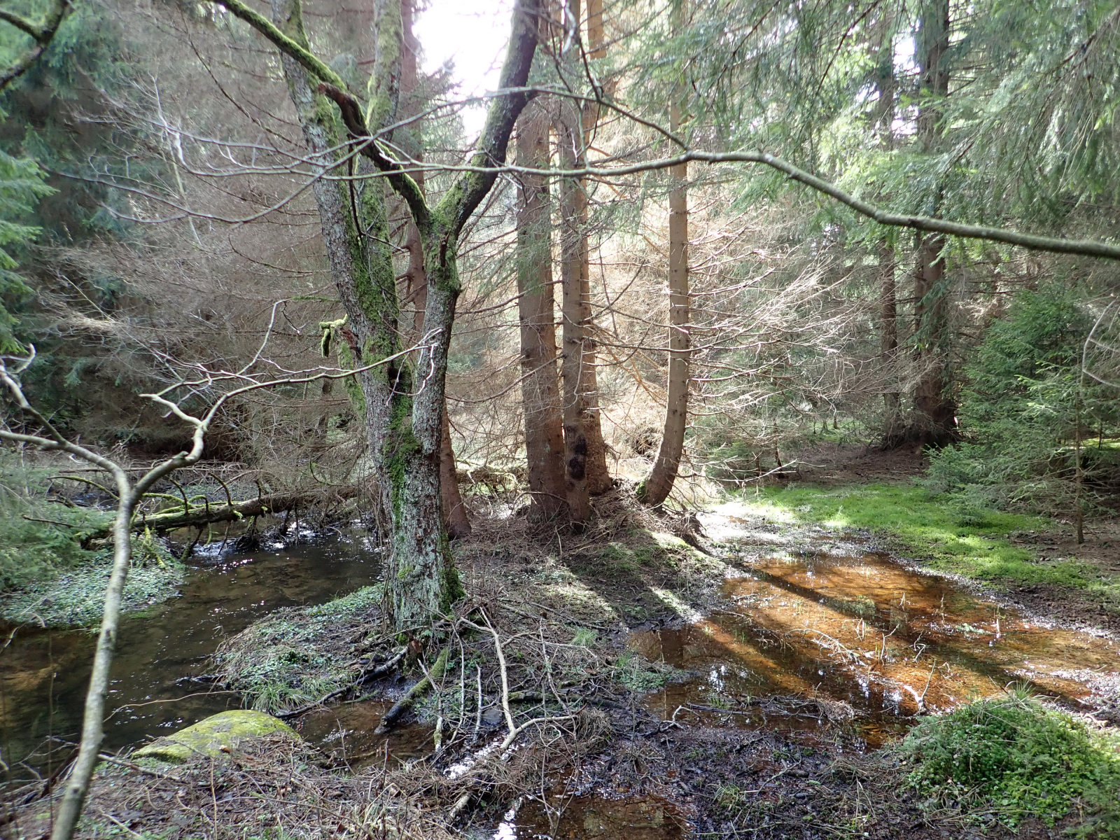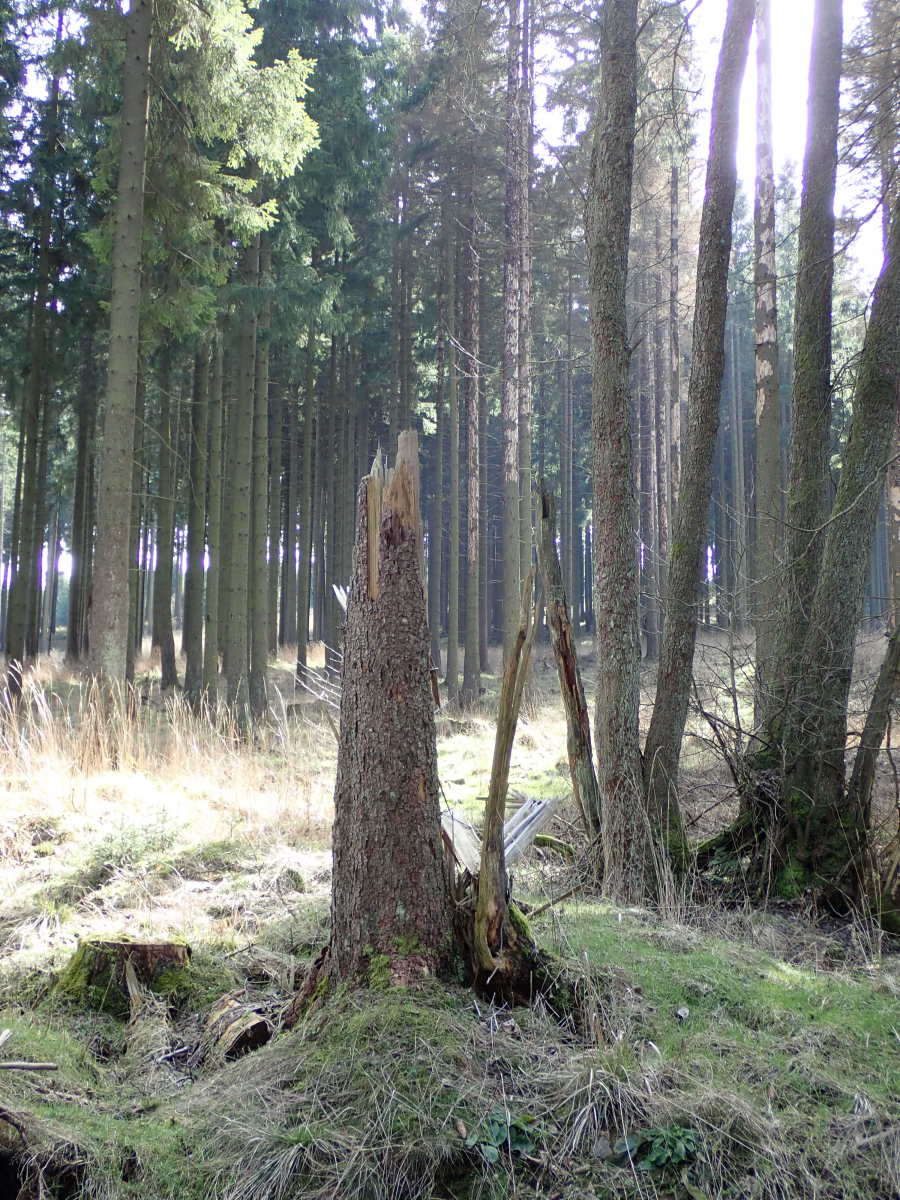 Die Fichten in dieser Gegend sind noch nicht so geschädigt wie z.B. im Oberharz, obwohl sie eben alle auch diese Harzausflüsse haben, die auf Schädigungen hinweisen.