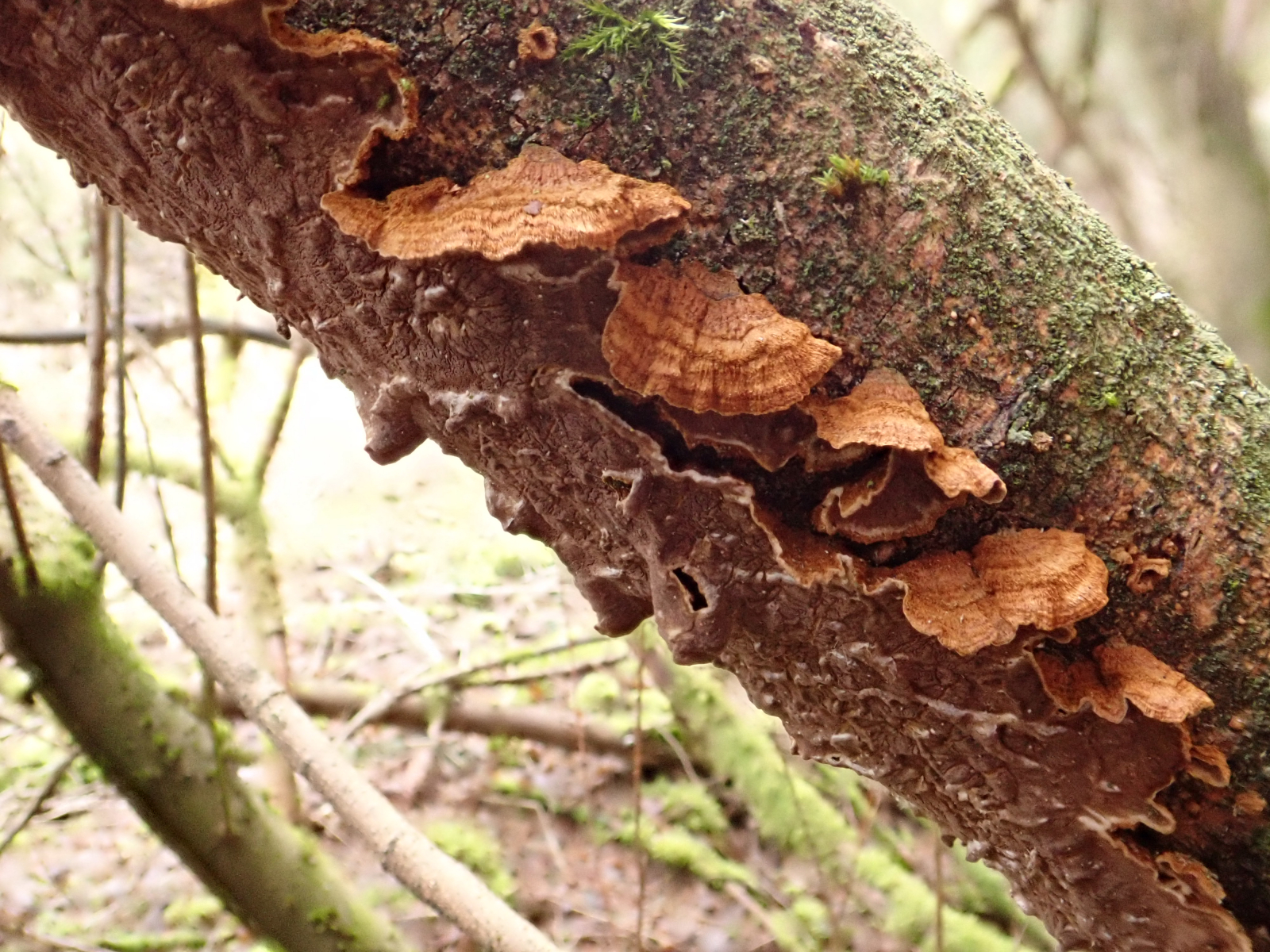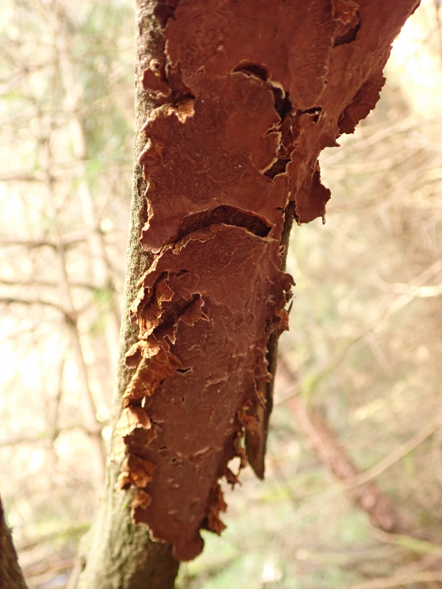 An einem kleinen Bachlauf standen einige Weidengebüsche wo ein paar stark besetzt waren mit der Tabakbraunen Borstenscheibe - Hymenochaete tabacina.