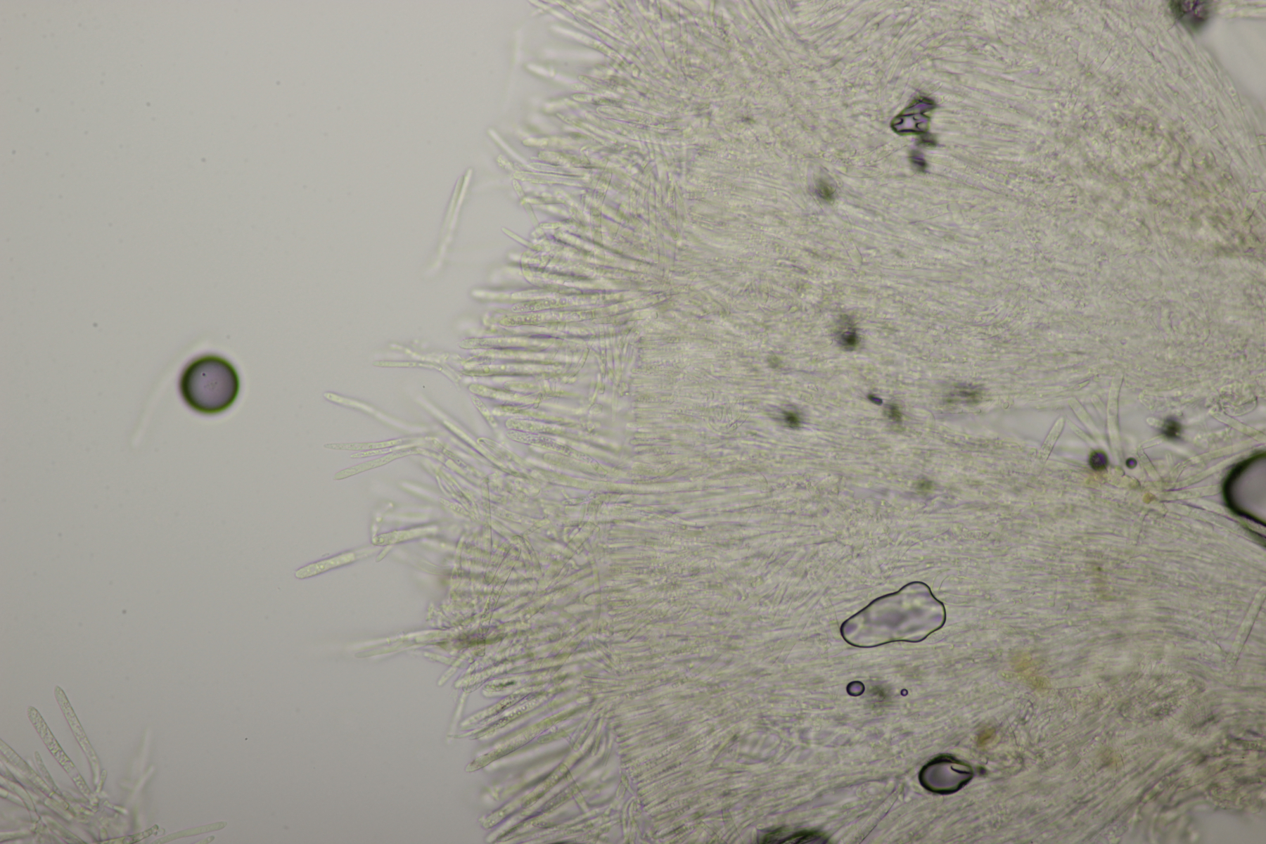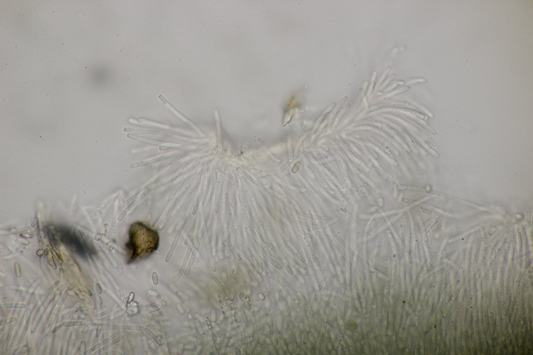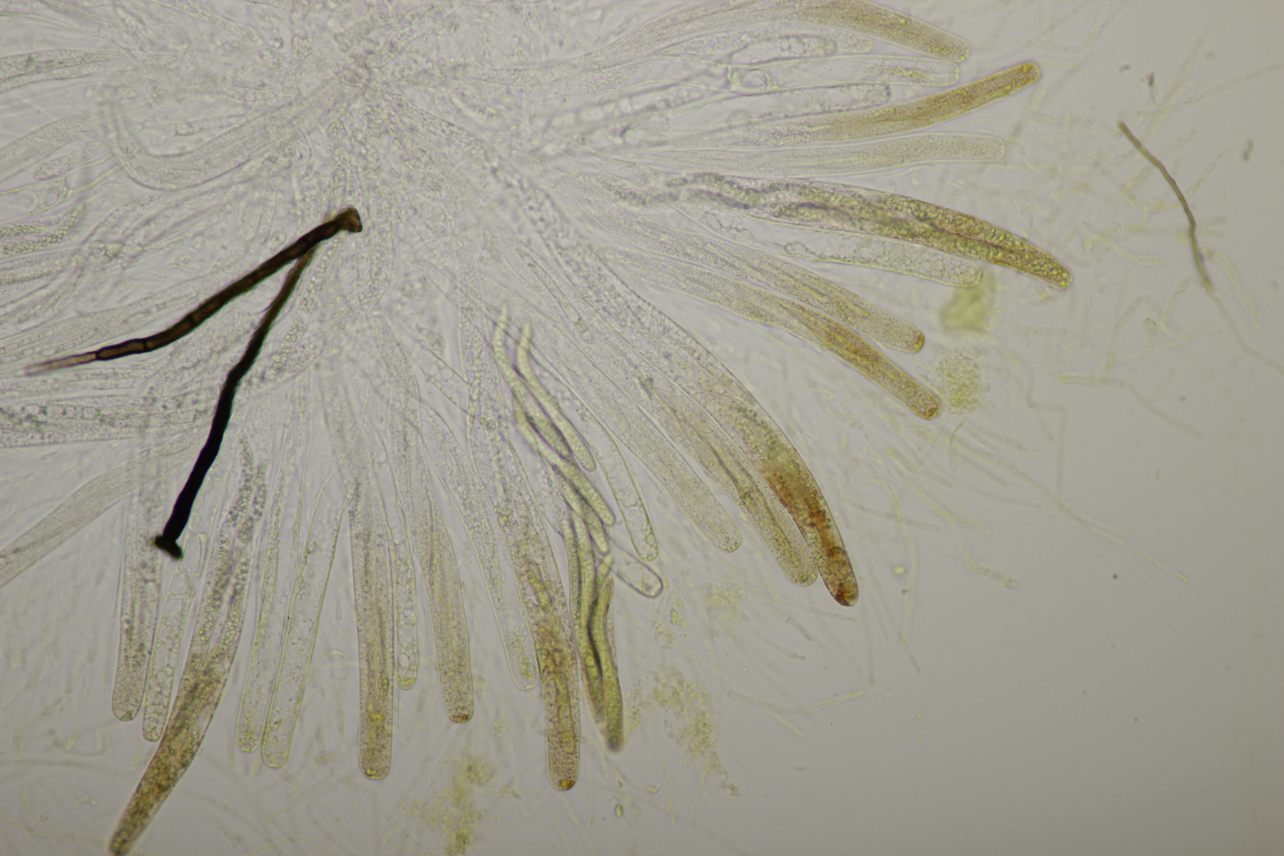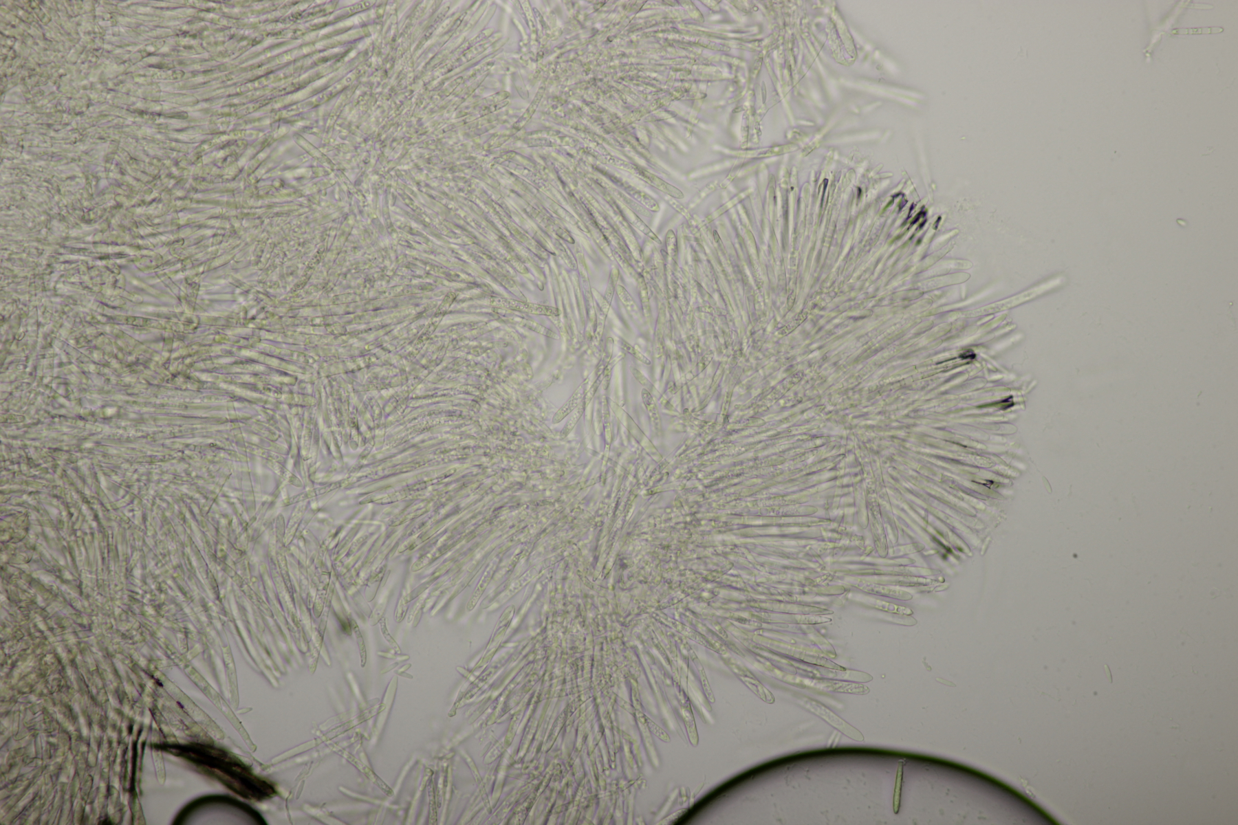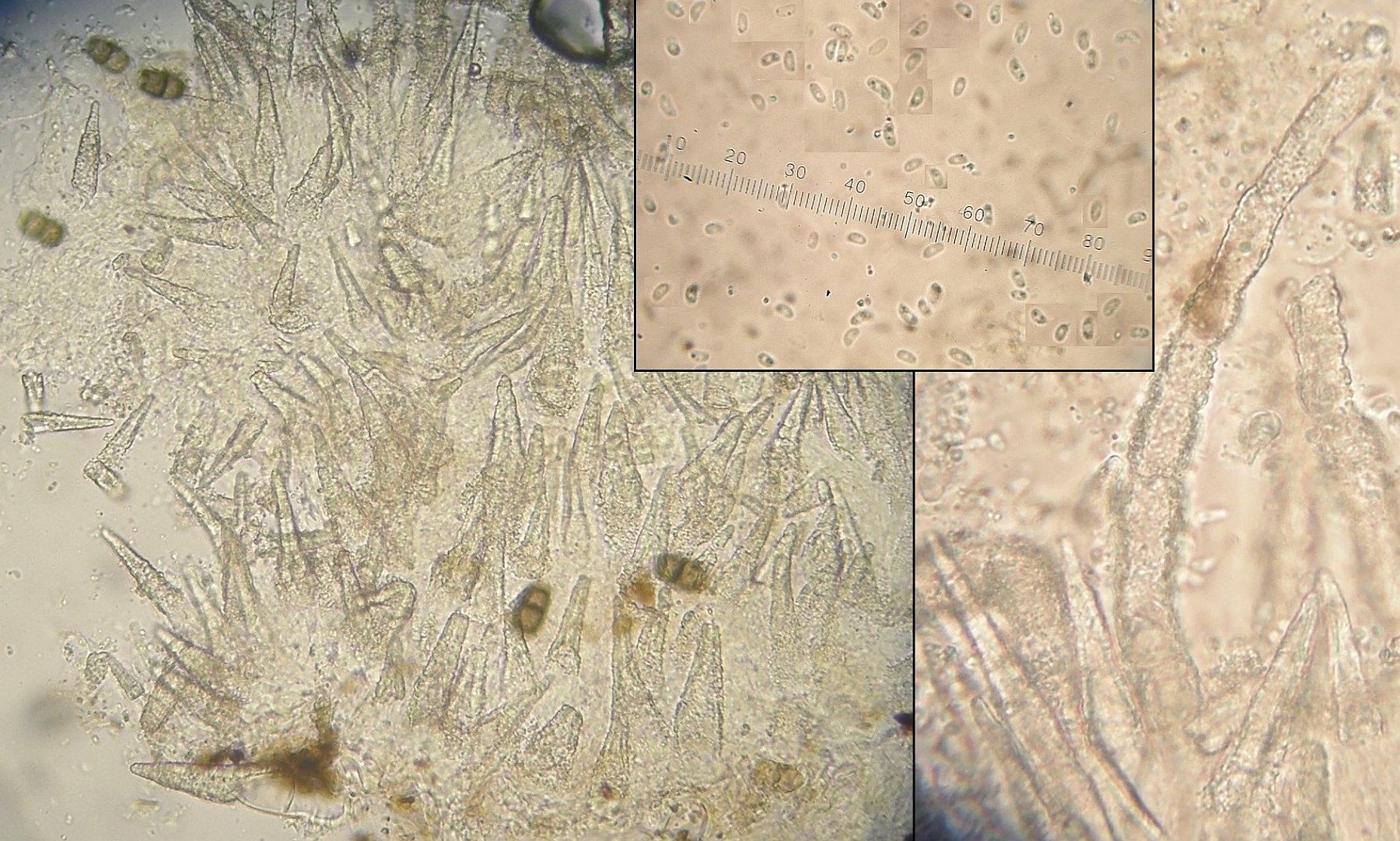 5. Auf Buche. Zystiden kristallbesetzt, keine Schnallen, Hyphen sehr dicht. Sporen um 4x2 µm (hatte ich auch fotografiert, das Bild ist aber offenbar noch auf der anderen Speicherkarte. Muß ich nachher mal schauen und ergänzen). Ich lande dann bei Scopuloides rimosa.