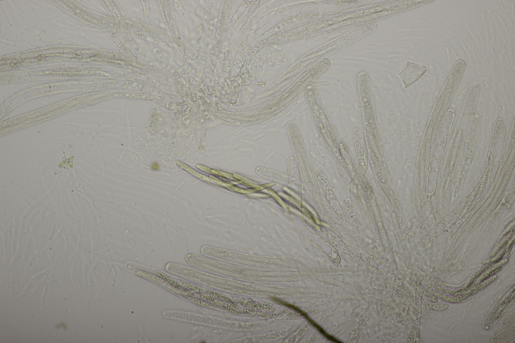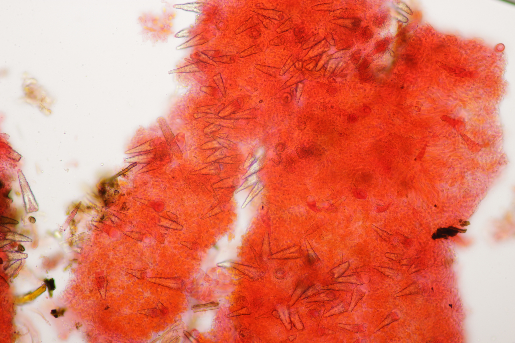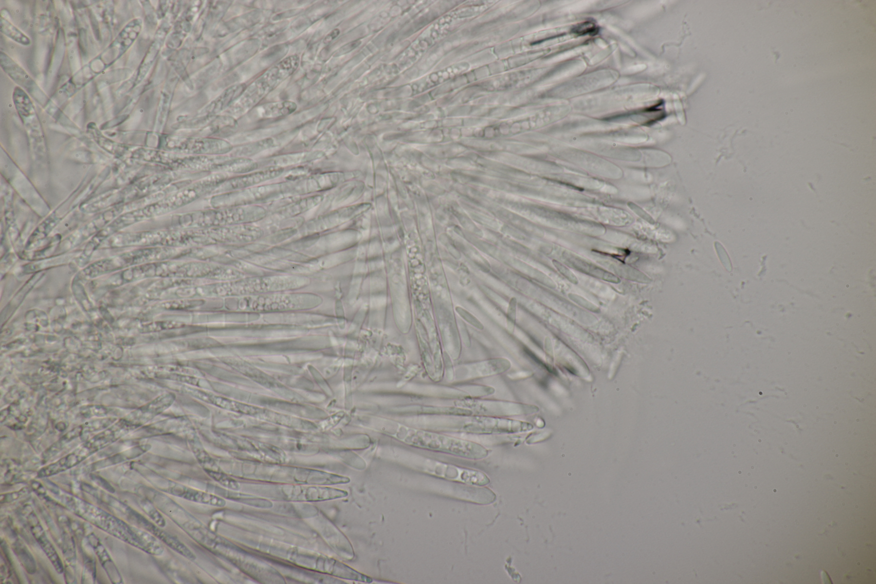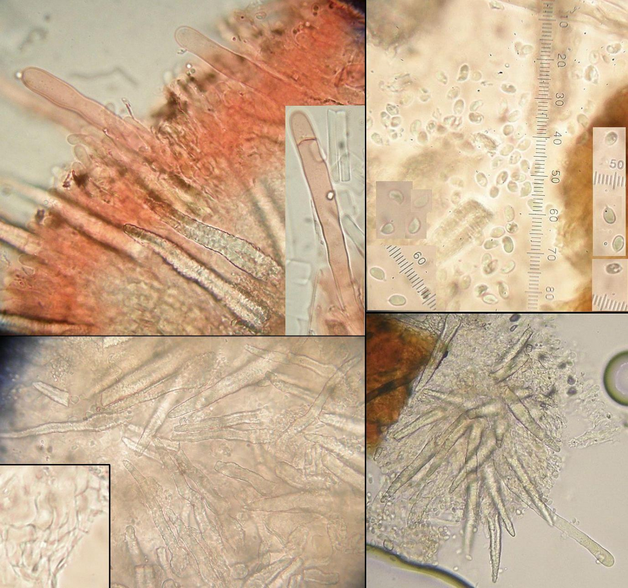 5. Auf Buche. Zystiden kristallbesetzt, keine Schnallen, Hyphen sehr dicht. Sporen um 4x2 µm (hatte ich auch fotografiert, das Bild ist aber offenbar noch auf der anderen Speicherkarte. Muß ich nachher mal schauen und ergänzen). Ich lande dann bei Scopuloides rimosa.