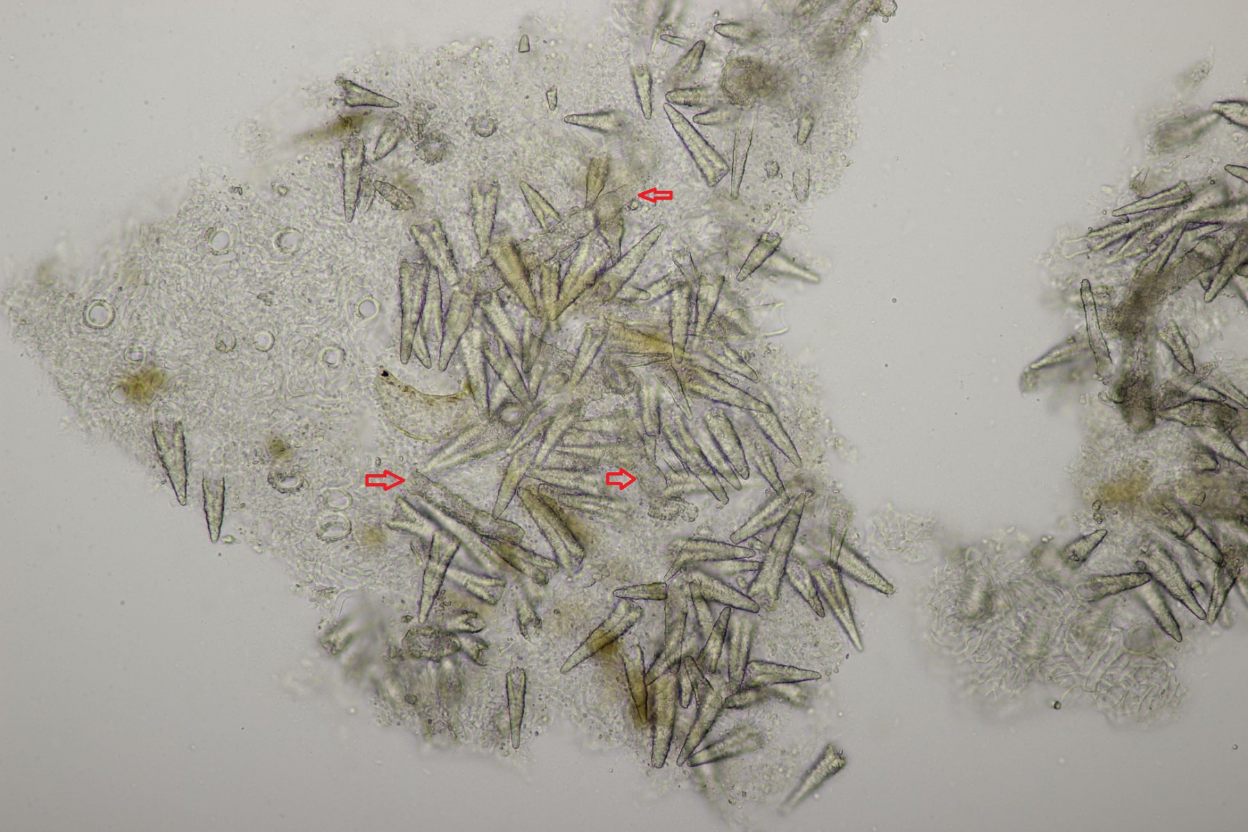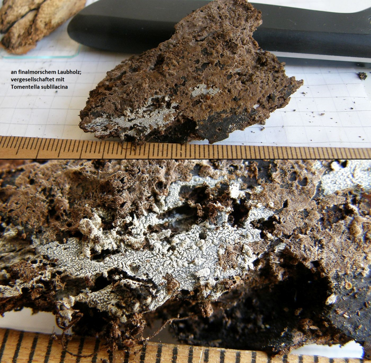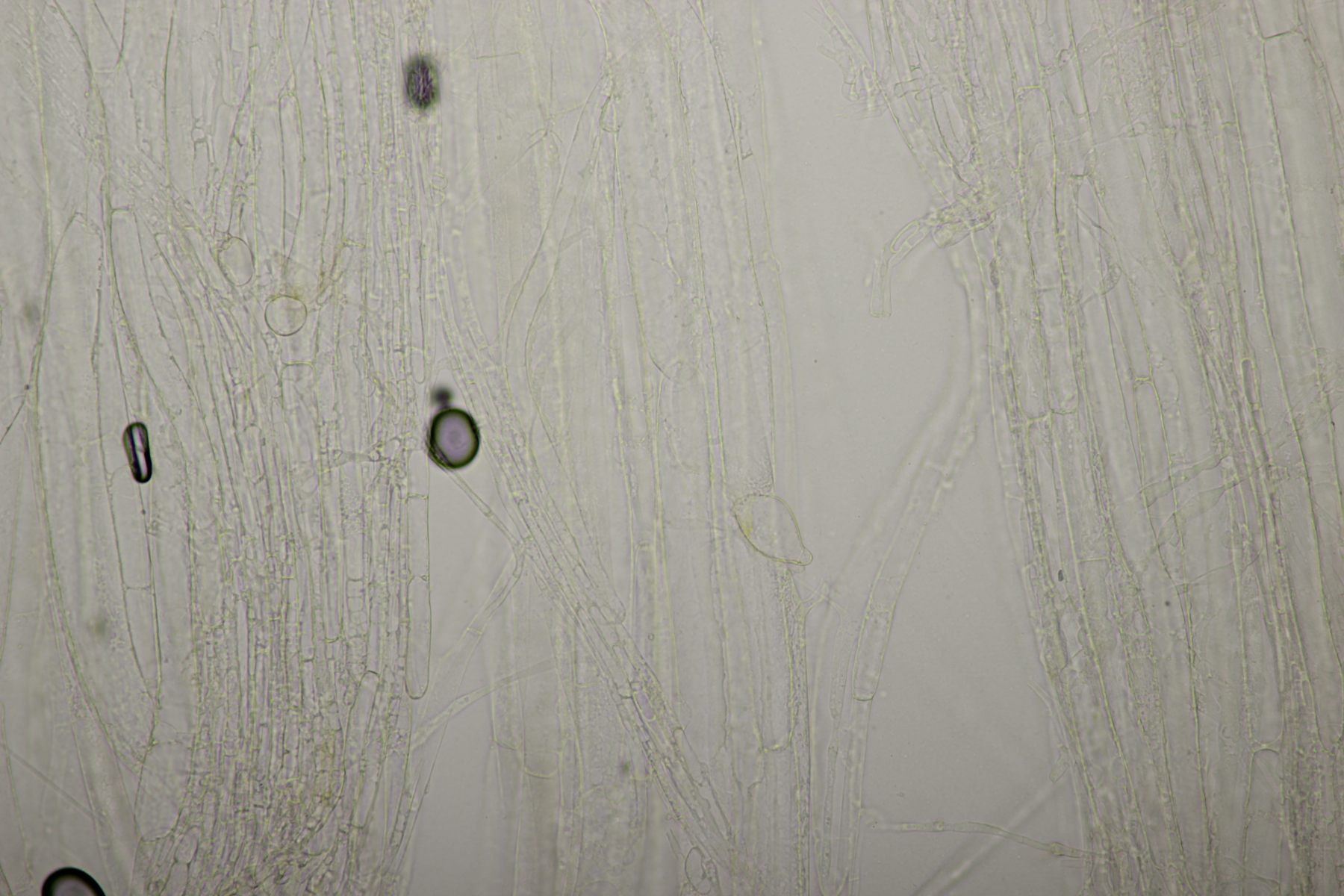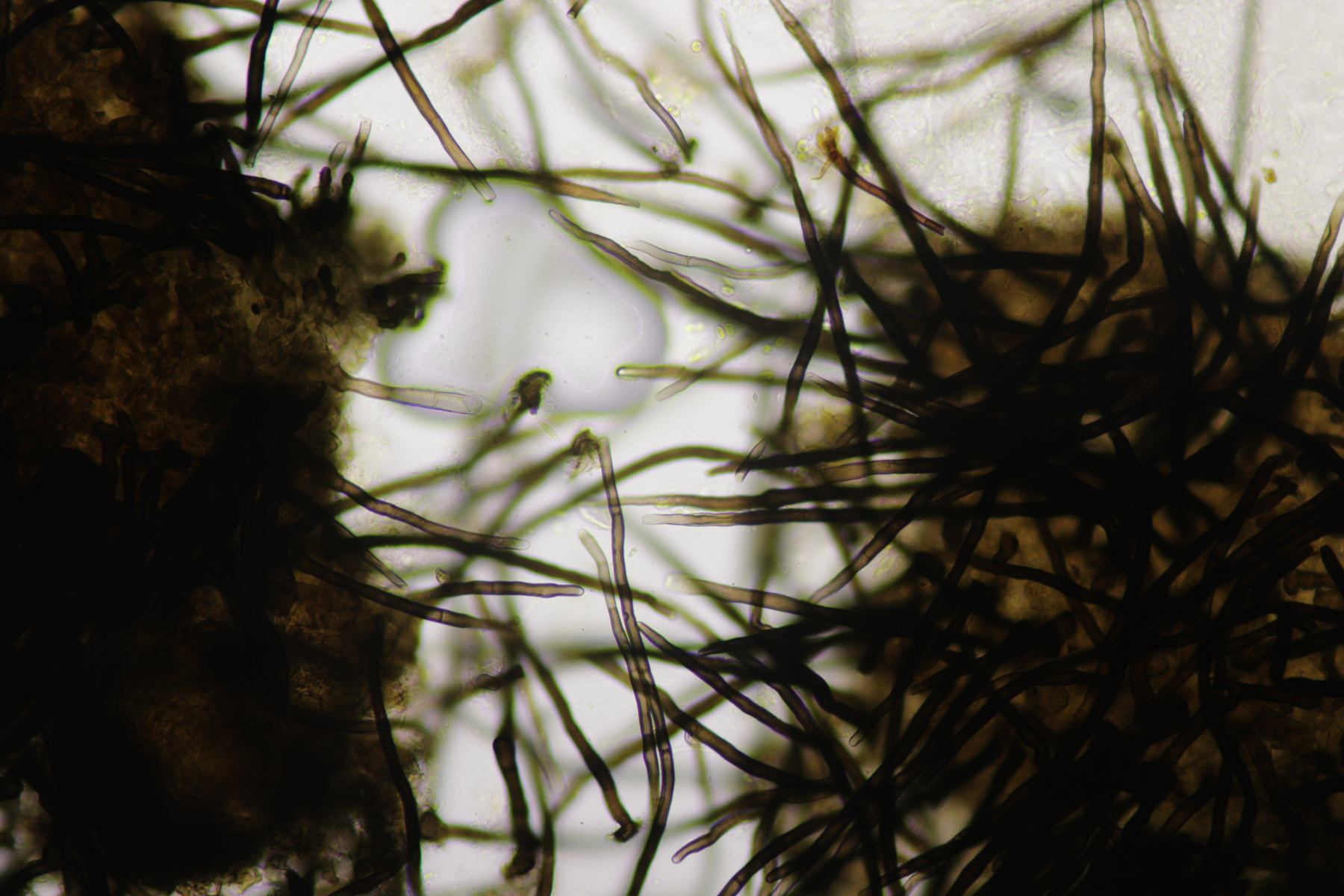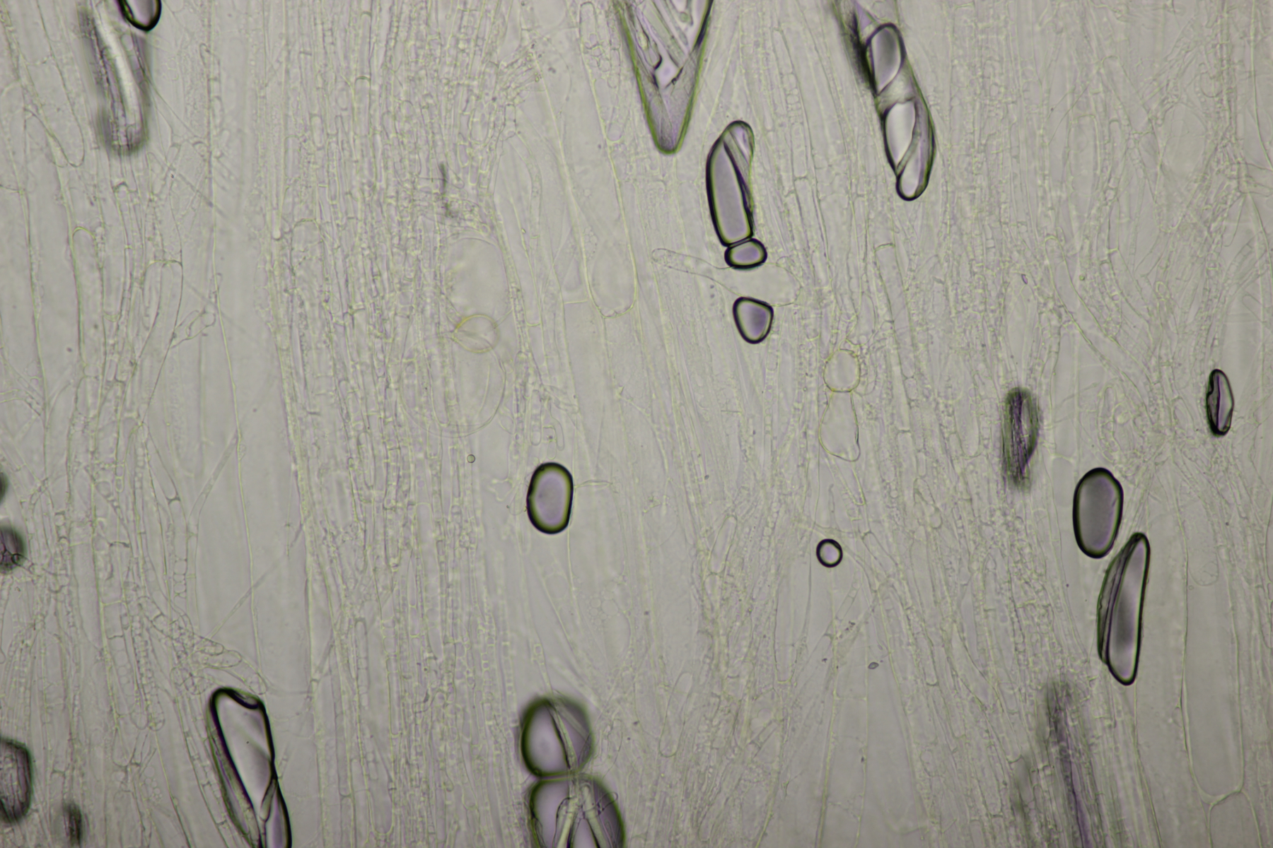 5. Auf Buche. Zystiden kristallbesetzt, keine Schnallen, Hyphen sehr dicht. Sporen um 4x2 µm (hatte ich auch fotografiert, das Bild ist aber offenbar noch auf der anderen Speicherkarte. Muß ich nachher mal schauen und ergänzen). Ich lande dann bei Scopuloides rimosa.