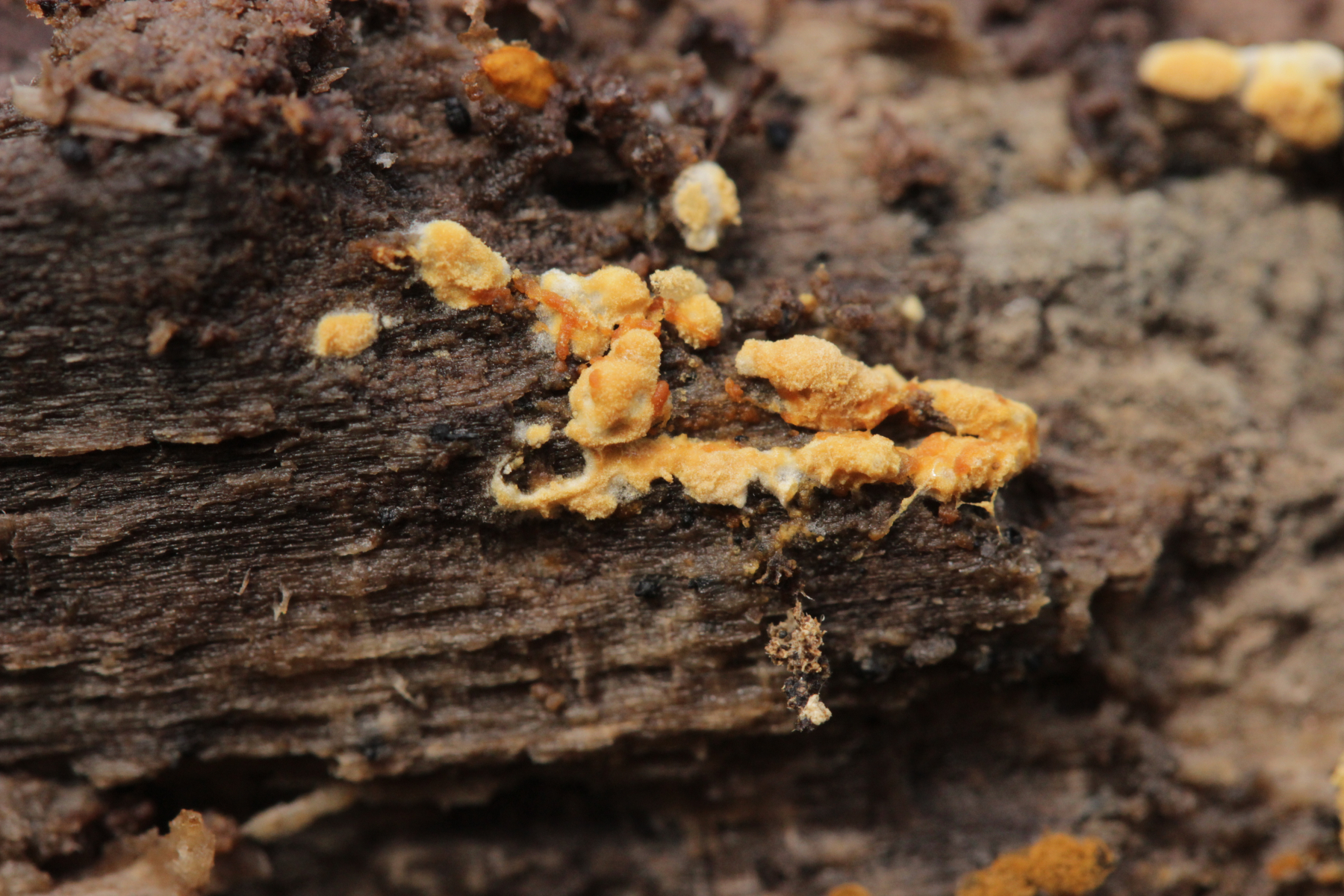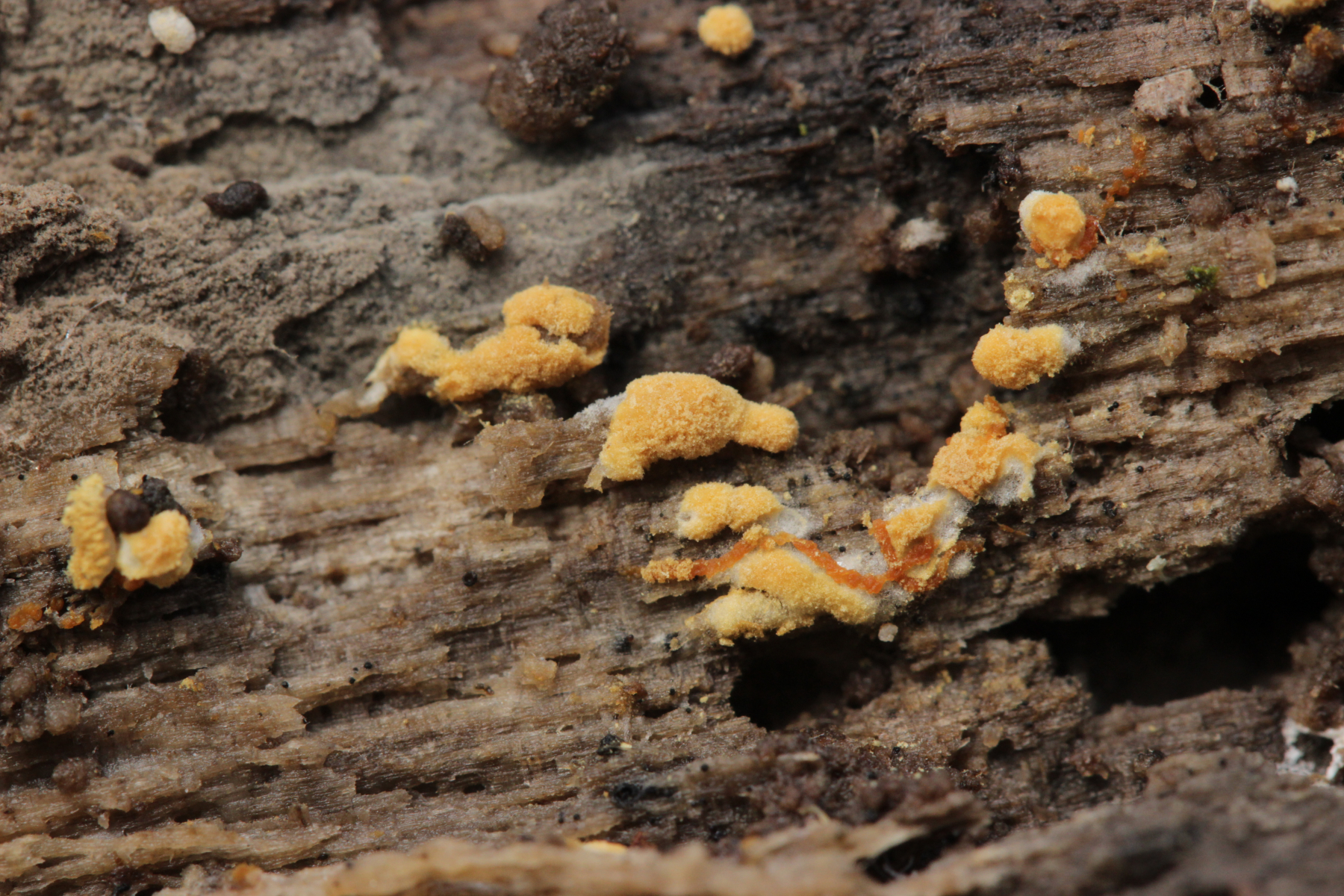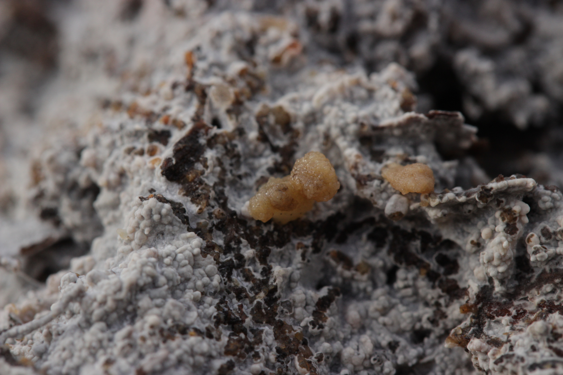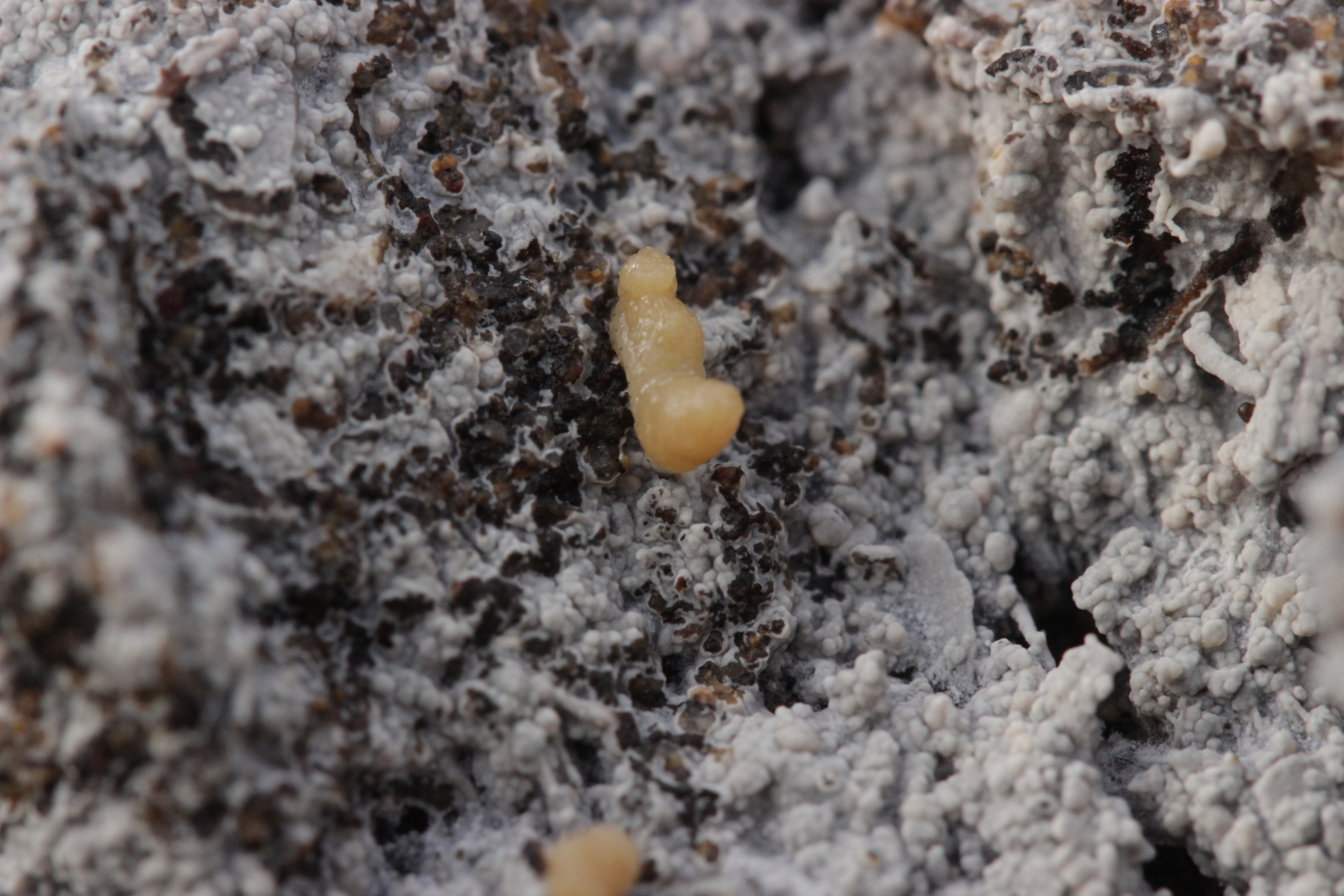 10. Hier soll mal nicht der Pilz im Vordergrund stehen sondern die geblichen Flecken. Erst dachte ich an irgendwas anamorphes. Aber als sich die kleinen Dinger dann bewegten, war klar: Das ist tierisches Leben. Hat da jemand eine Idee zu?