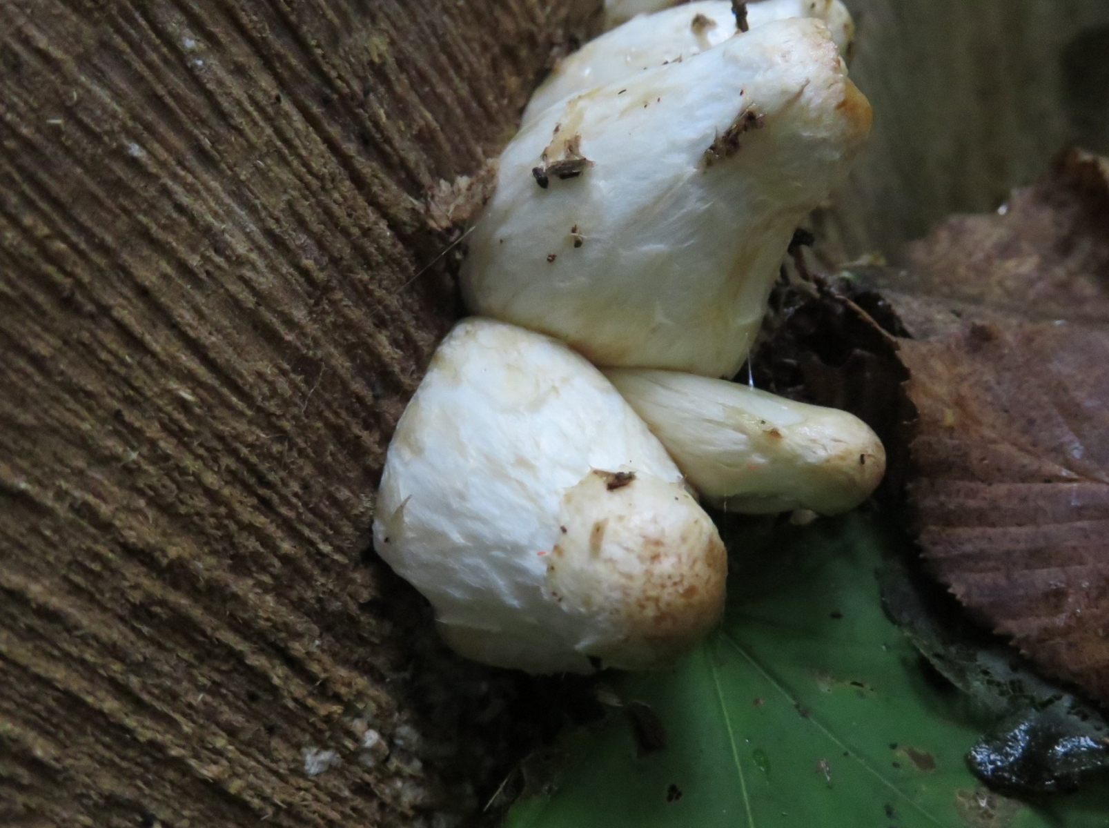 1) Ein Stummelfüsschen (Gattung Crepidotus), nicht näher bestimmt. Huthaut nicht gelatinös/elastisch/dehnbar.