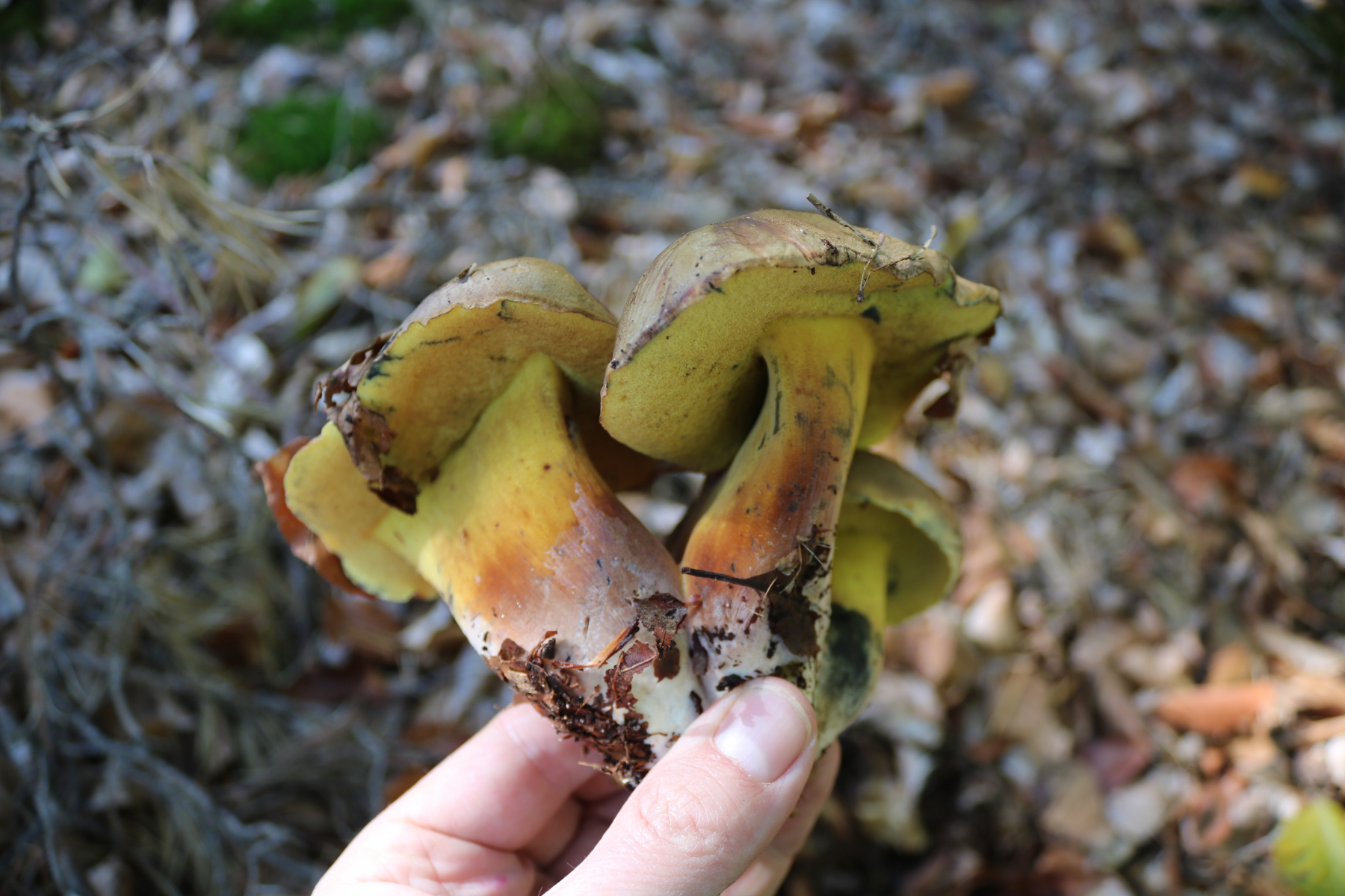 Schwarzblauende Röhrlinge (Cyanoboletus pulverulentus), büschelig verwachsen!
