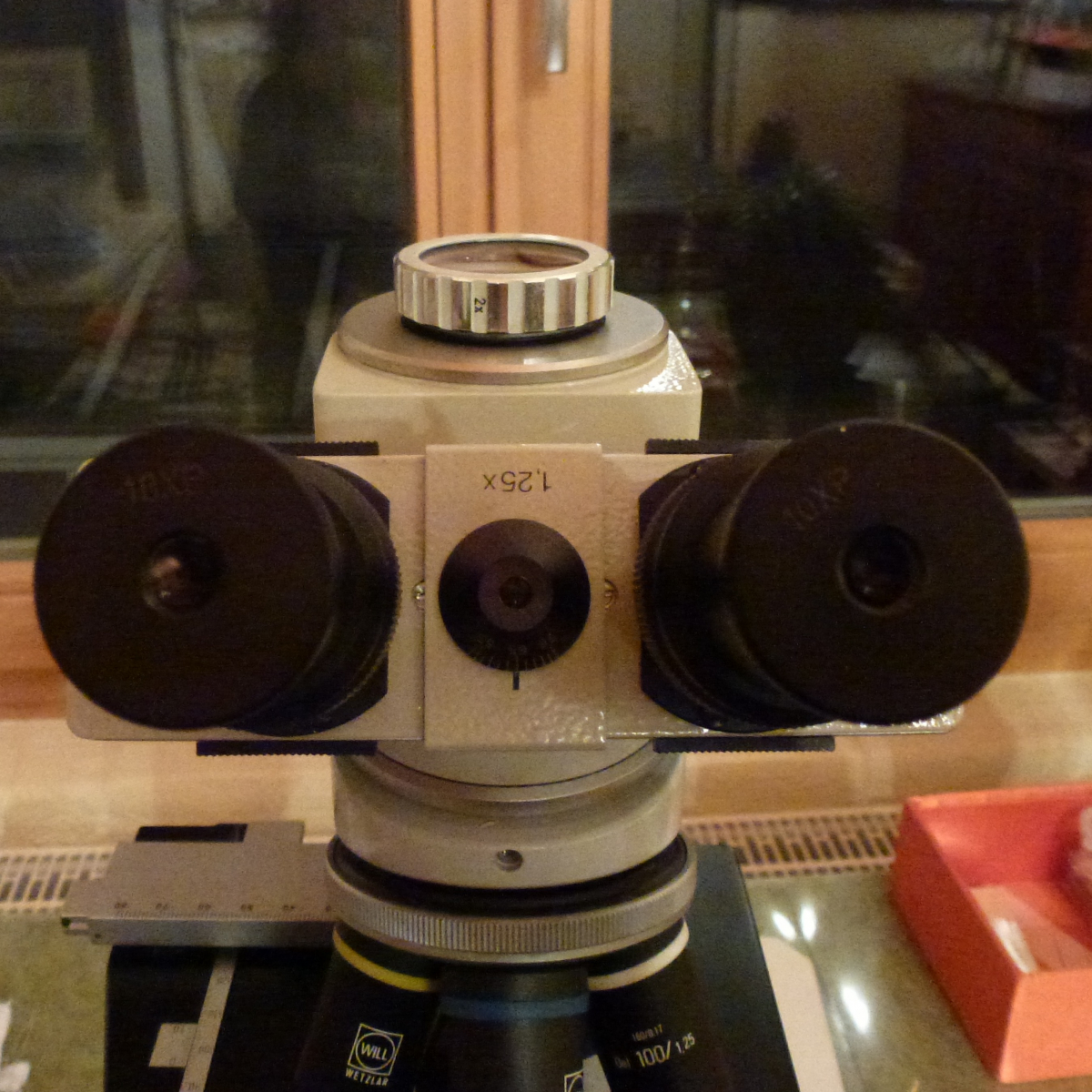 Das Mikro hat außerdem obenauf noch einen dritten Zugang, von dem ich aber überhaupt keine Ahnung habe, wie ich später mal damit Fotos erstellen kann. Meine ersten Bilder habe ich mit Handykamera durch eines der Okulare geschossen. ![]()