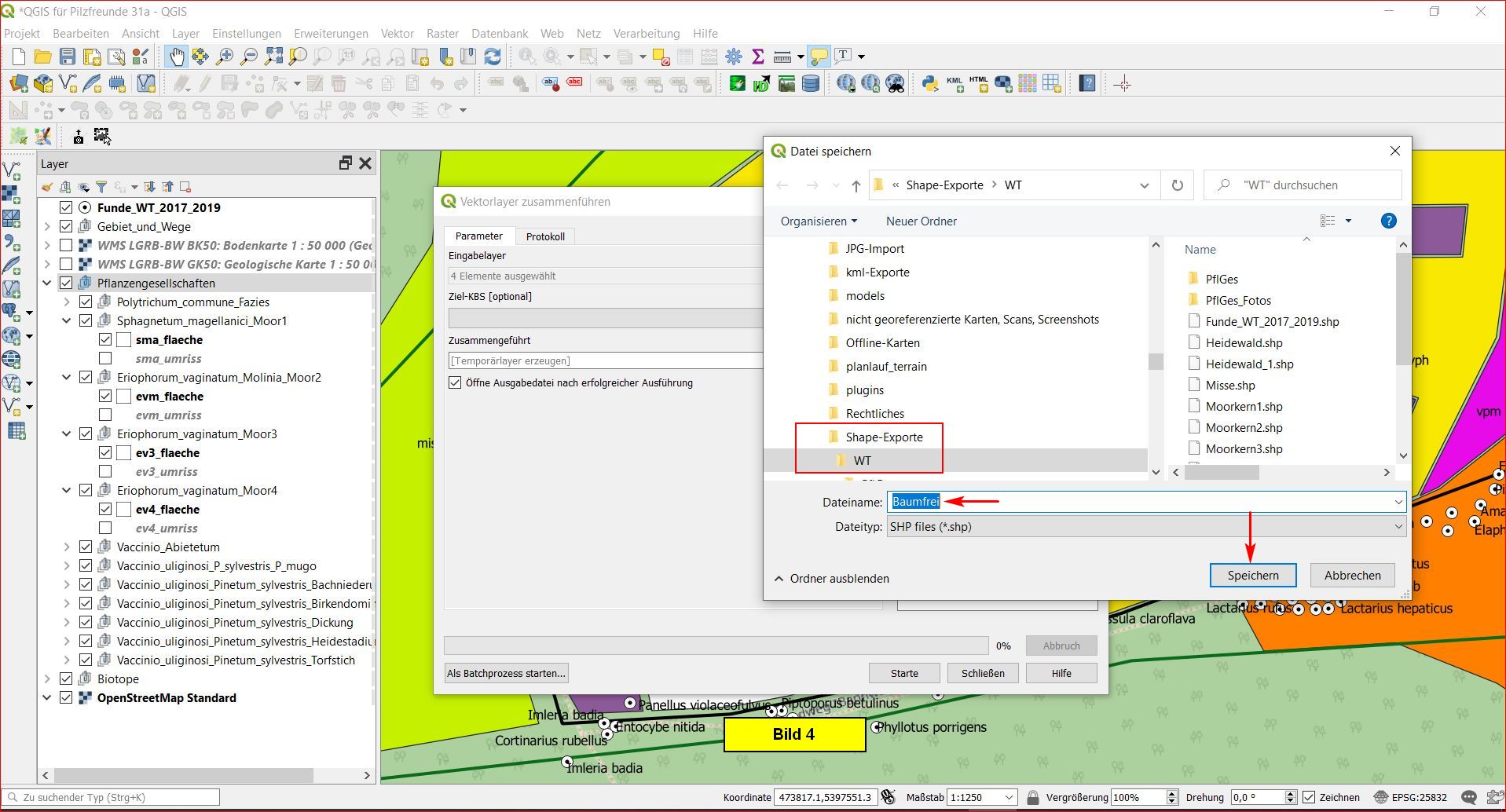 Im erscheinenden Datei speichern-Menü manövrieren wir zu Shape-Exporte \ WT und tragen einen passenden Dateinamen ein, z.B. Funde_baumfrei.