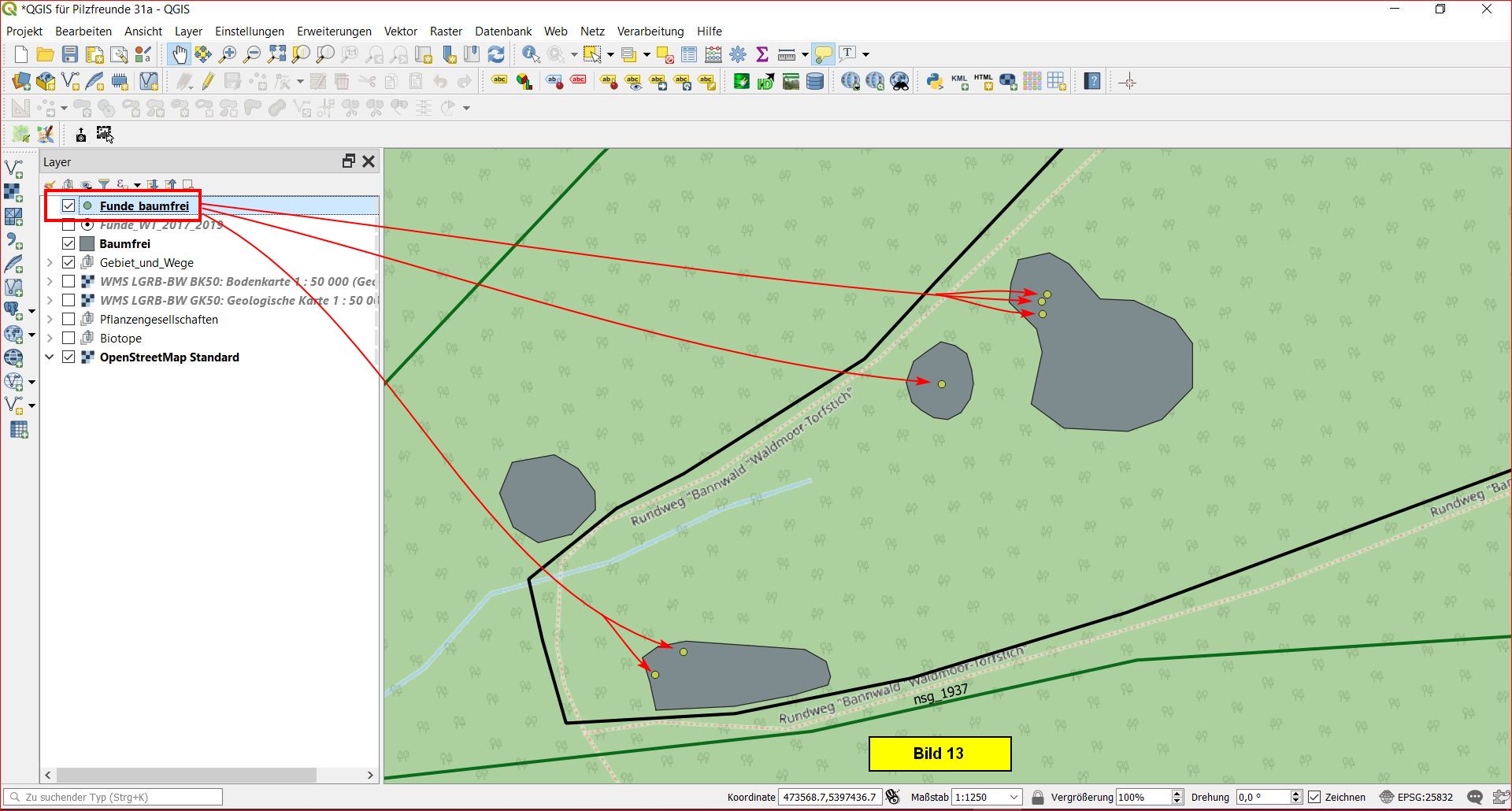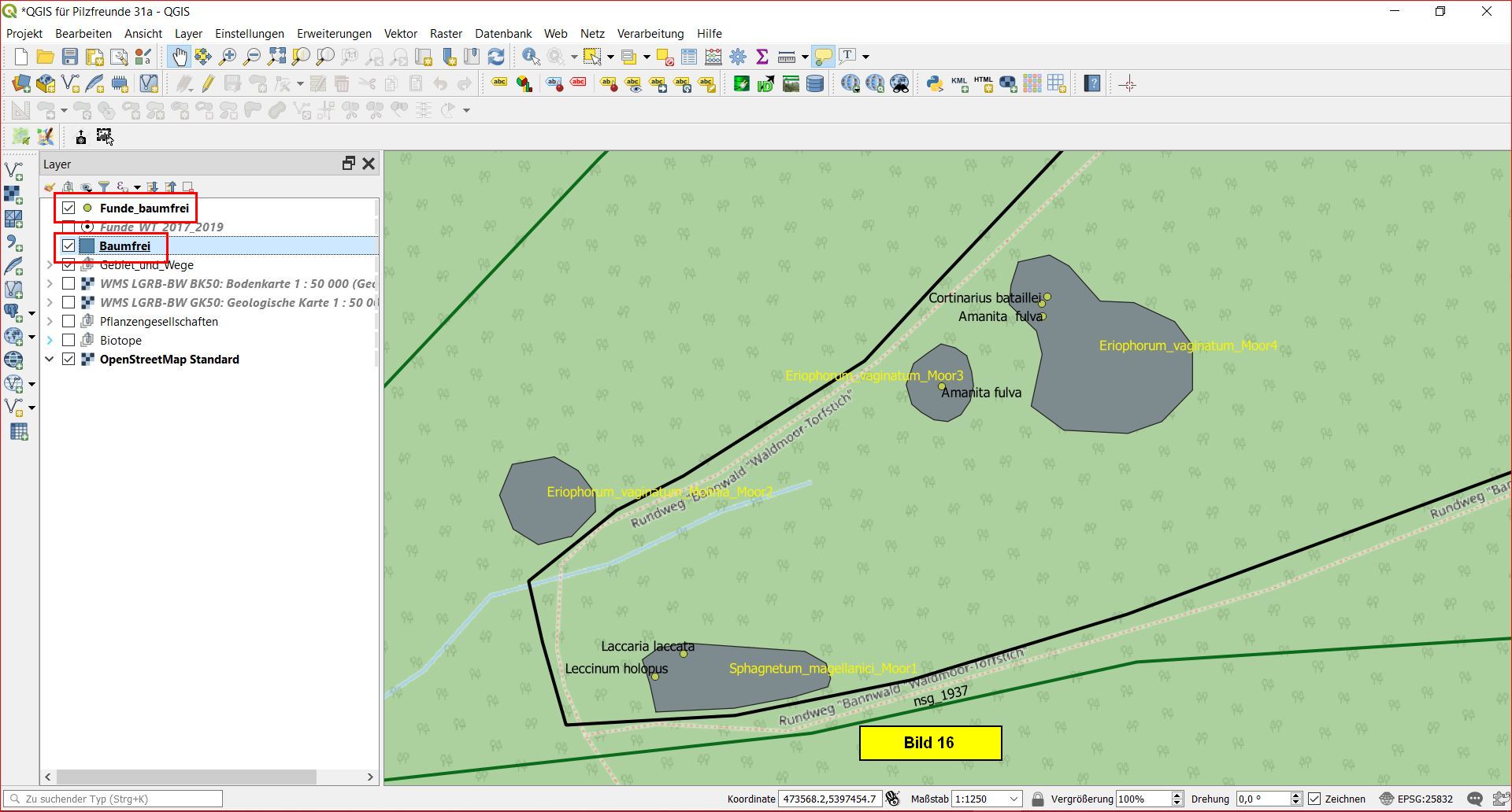 Für weitere Aufgabenstellungen möchte ich die Bodenkarte, den Bereich der Polytrichum-Bulte sowie den Alten Bannwald in die Auswertungen einbeziehen. Dazu werden wir den beiden nächsten Teilen der Aufsatzreihe diese Bereiche erst einmal als Polygon-Layer (Flächen-Layer) aufbereiten.
