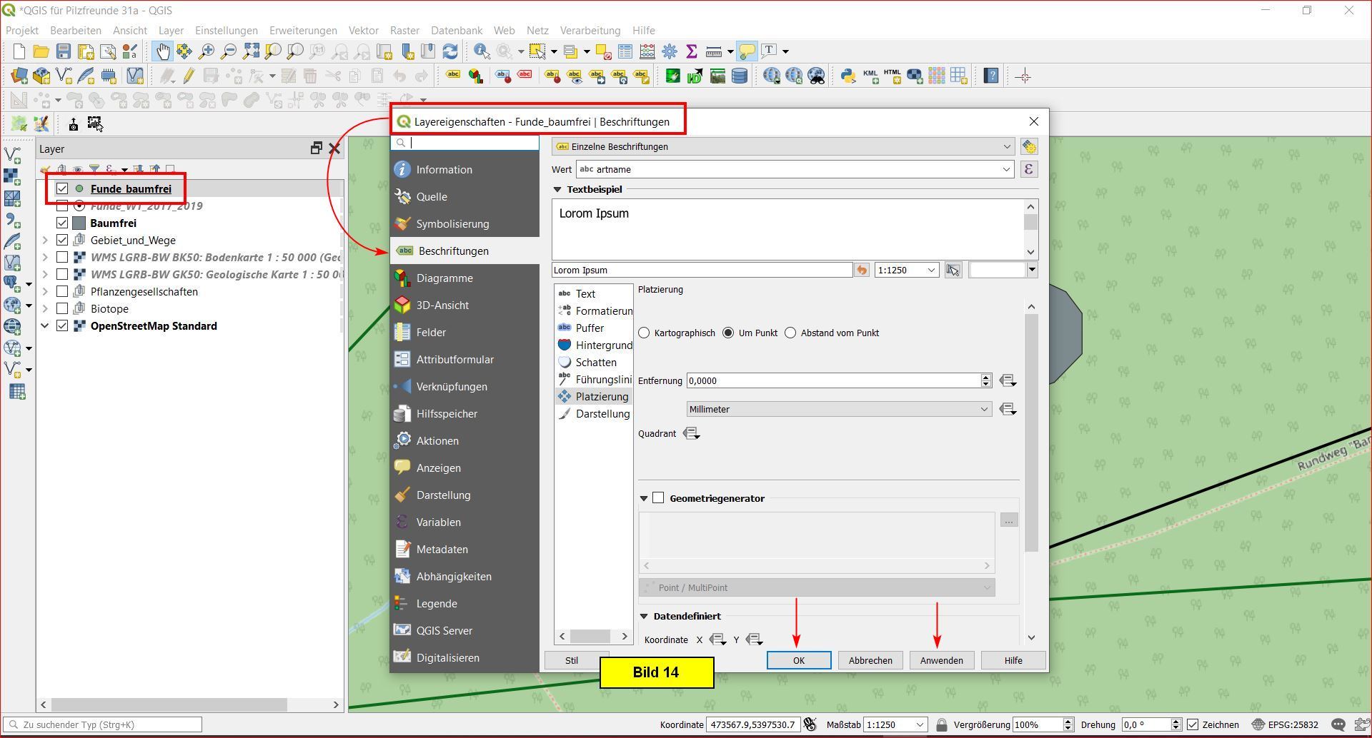 unter Layer überlagern den gewünschten, relevanten Bereich, also den Vektorlayer Baumfrei.