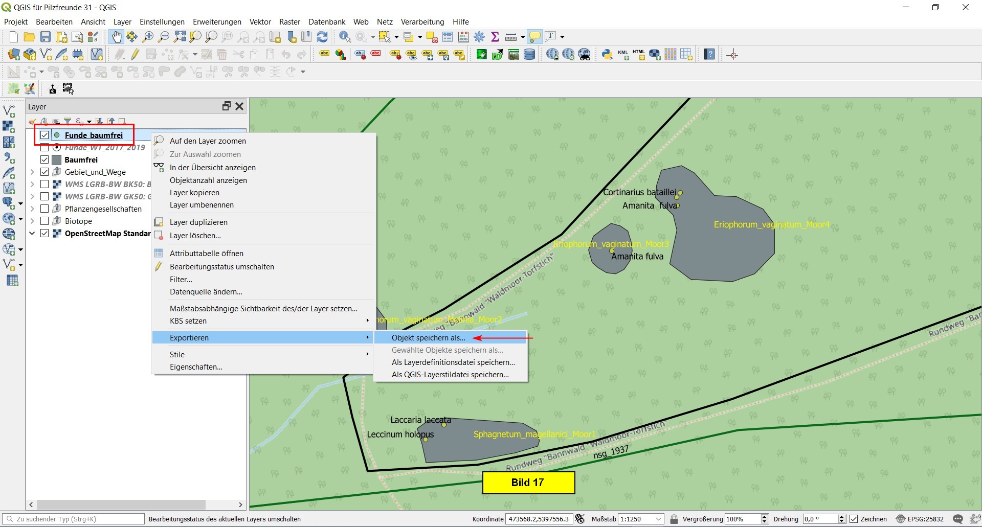 Rechtsclick im Layerfenster auf den Vektorlayer Funde_baumfrei und Selektion Objekt speichern als...: