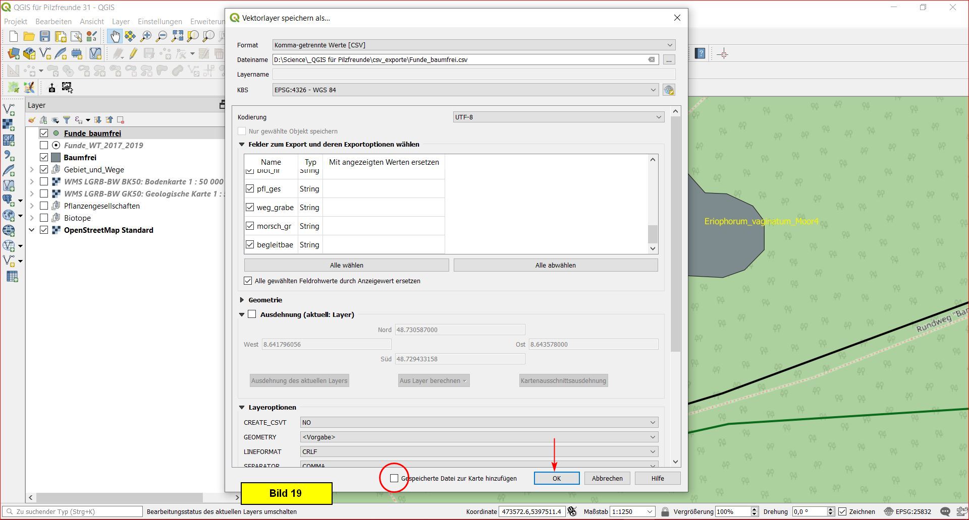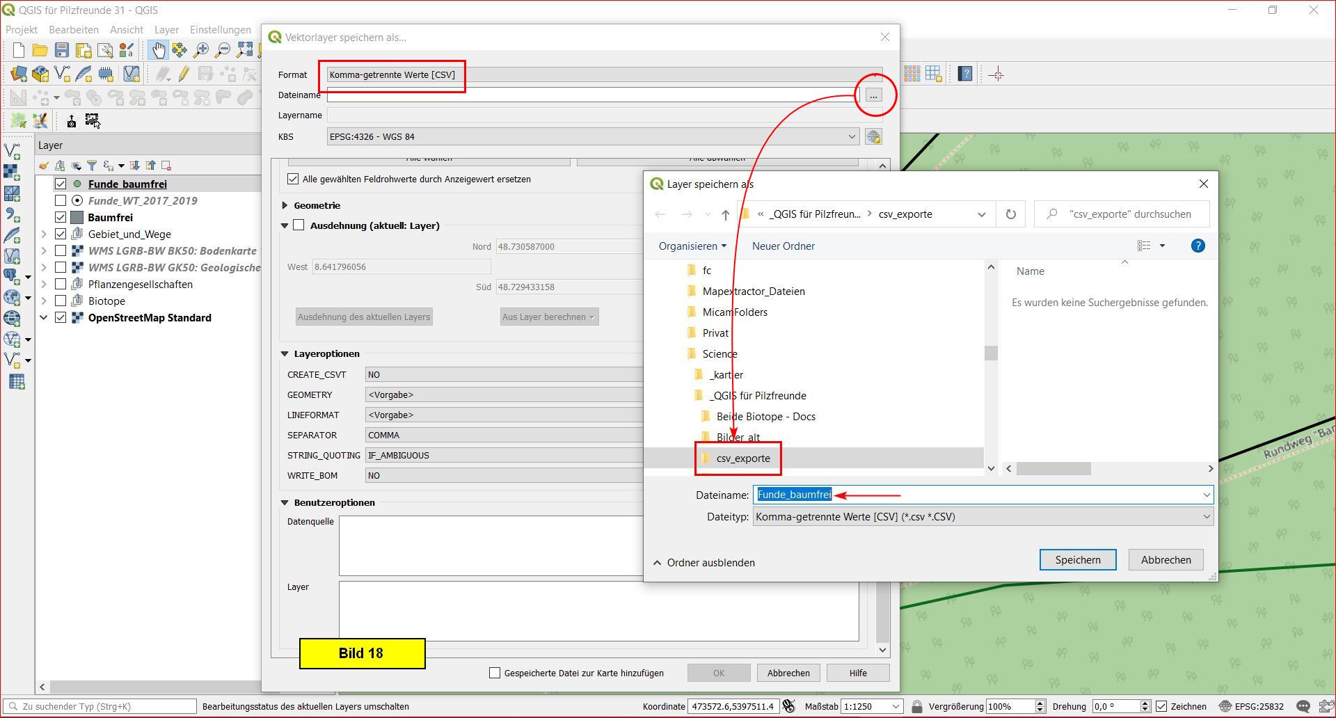 Im Layer speichern als-Menü navigieren wir zu csv-Exporte, geben einen passenden Dateinamen, beispielsweide Funde_baumfrei.csv, ein und schließen mit Speichern ab: