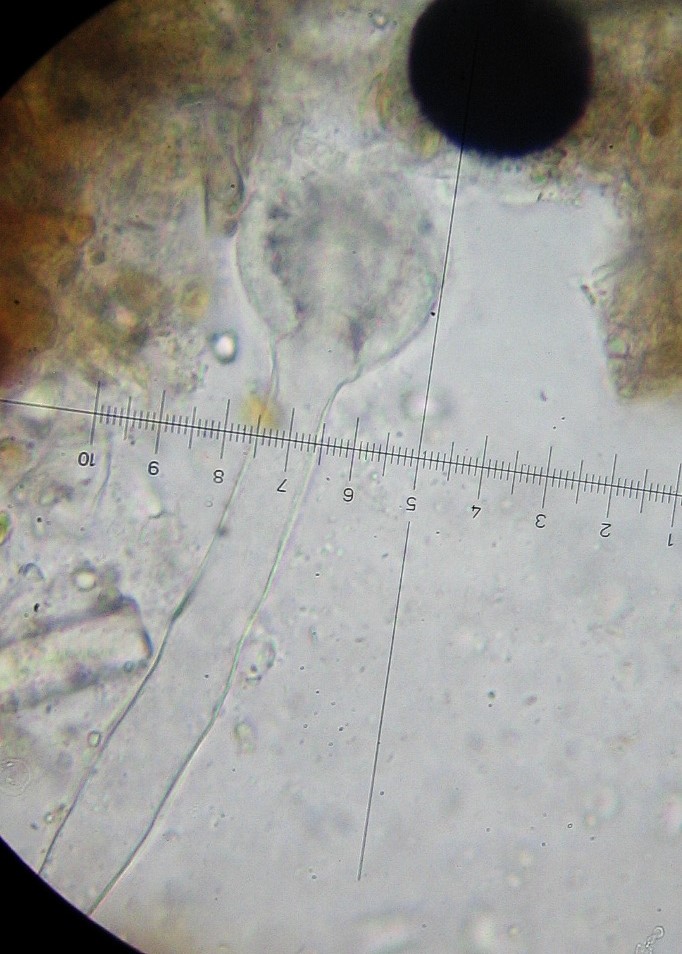 Frkp. 1000 x 35(Basis) -15µ(Spitze), kugelig mit langem, braunen, zur Spitze hin hyalinem Hals.