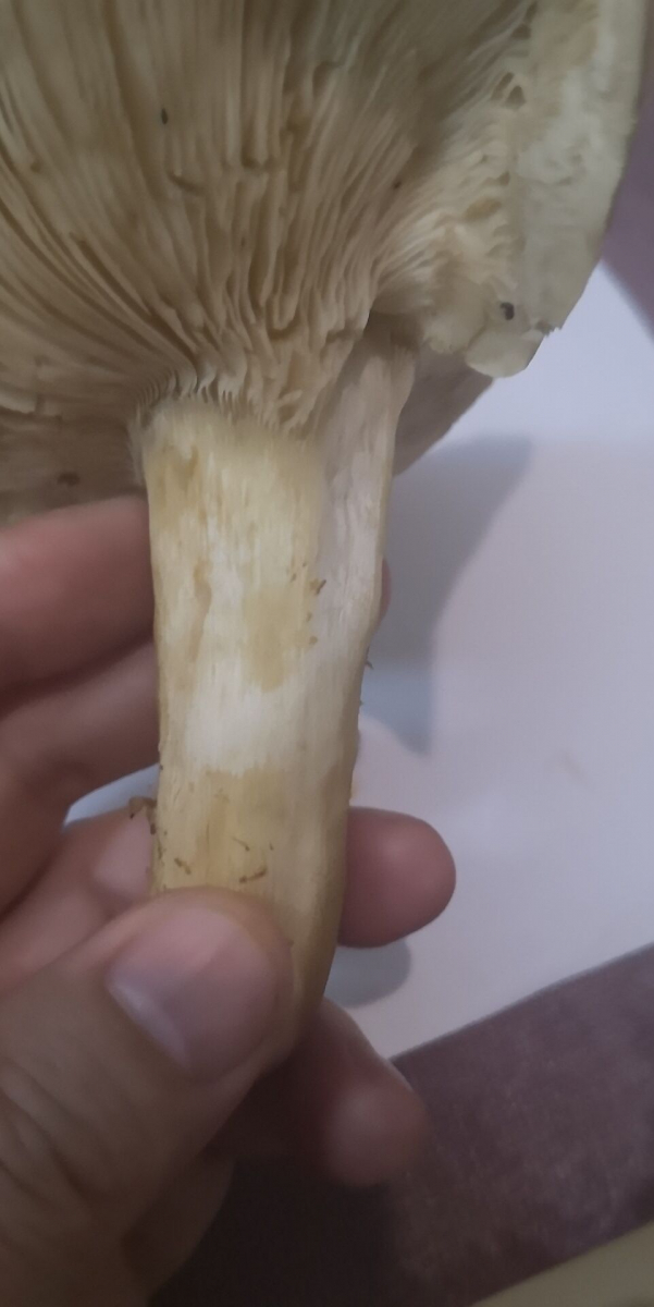 Die Gattung (Leucopaxillus) wäre trotzdem möglich - dazu könnte man einen Sporenabwurf machen, und auf den ein Tröpfchen Melzer geben... Ich fürchte, das ist in diesem Fall nicht möglich, oder?