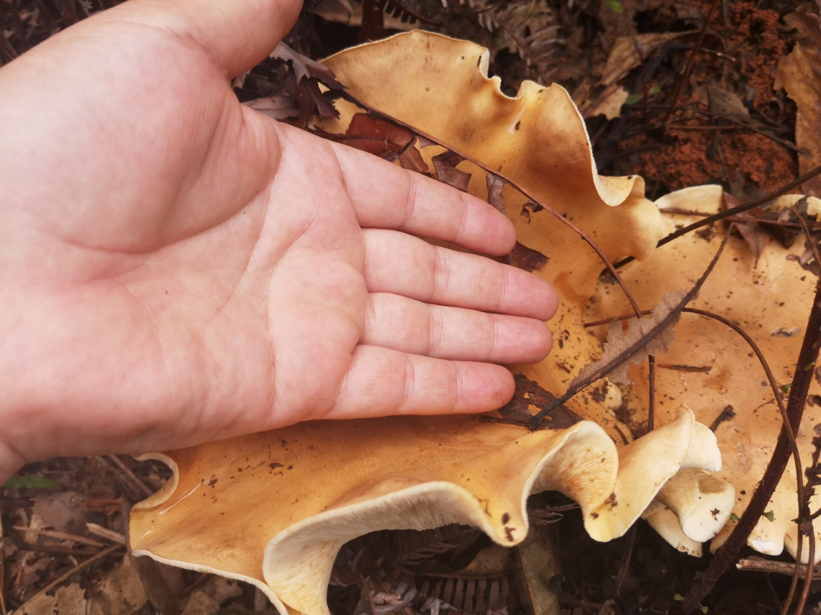 Rhodocollybia: Also zumindest den Gefleckten Rübling (Rhodocollybia maculata) kann ich mir so riesig eigentlich nicht vorstellen. Aber sowohl in der Gattung Leucopaxillus als auch bei Rhodocollybia könnte es eben weitere Arten geben, vor allem wenn das ein mediterraner oder gar außereuropäischer Fund wäre.