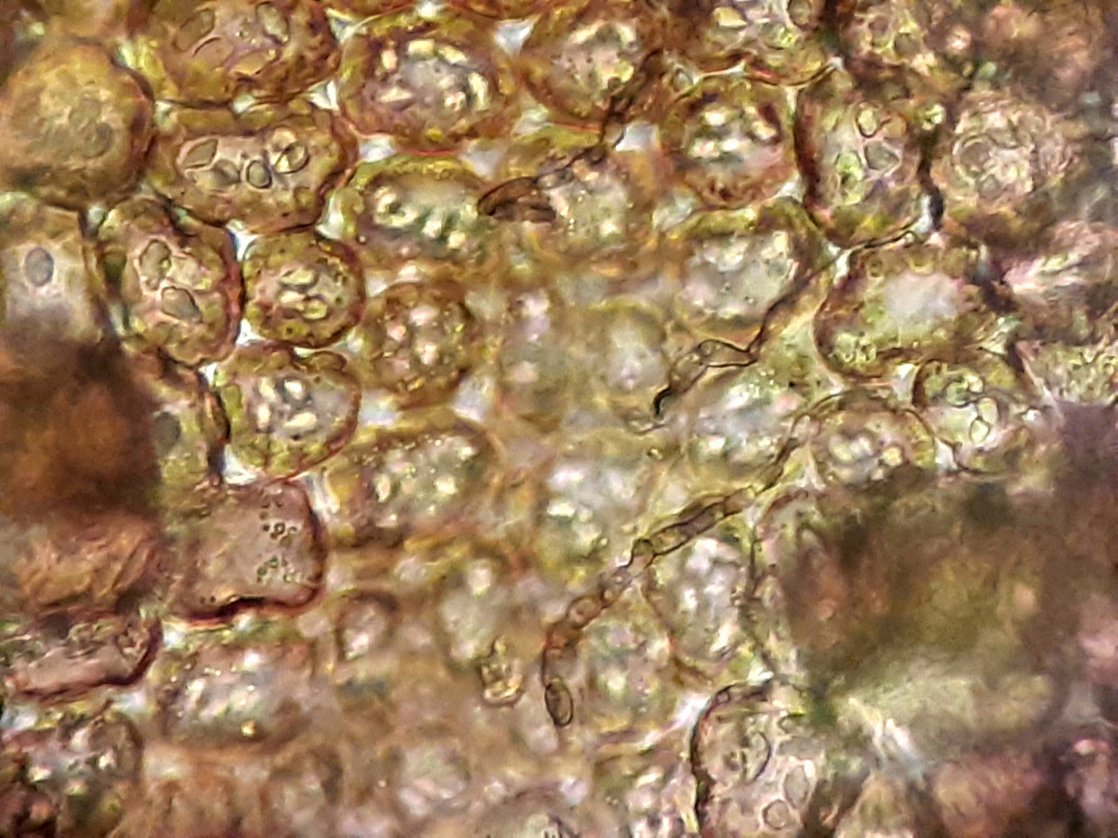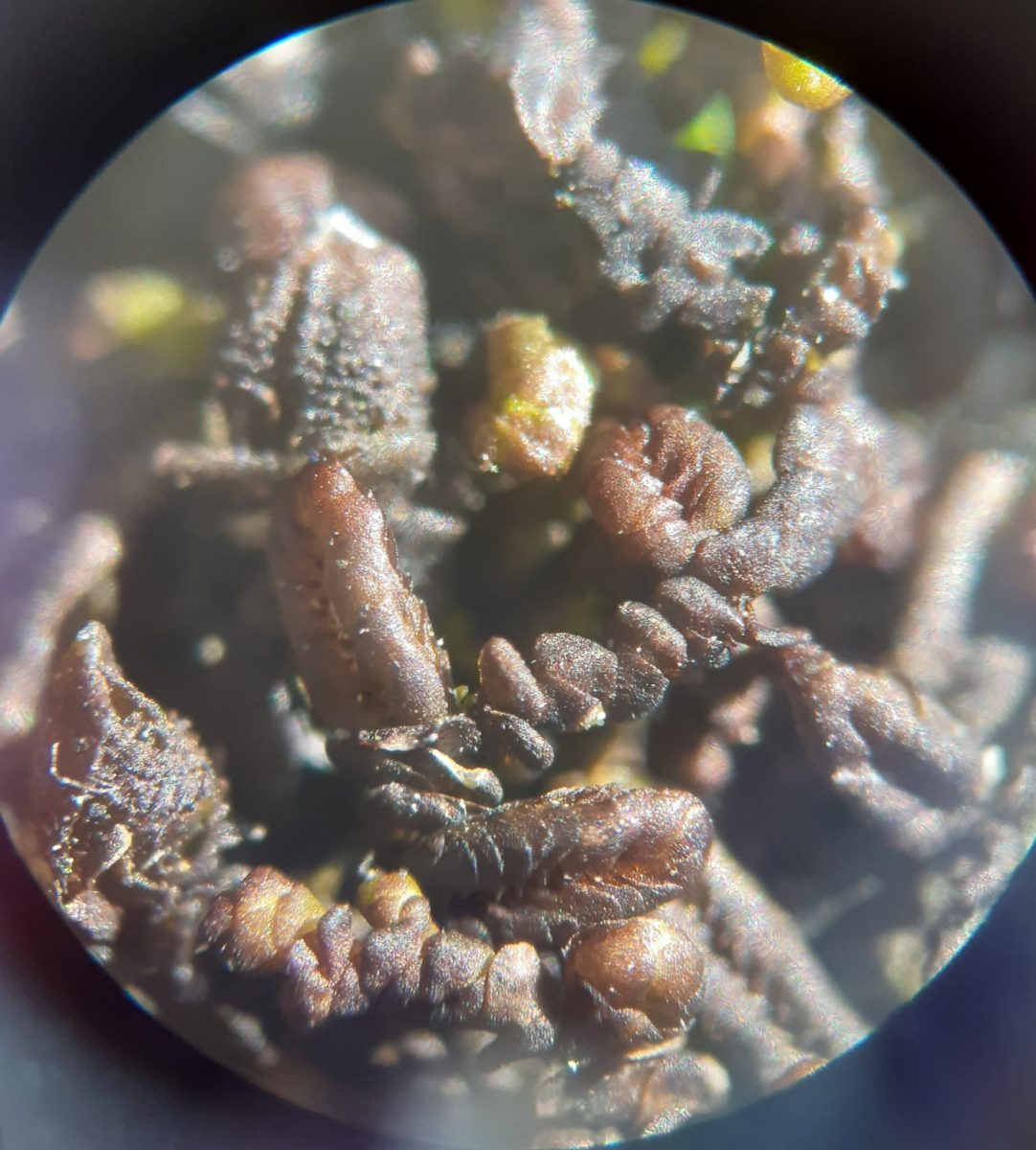 Schönen Nachmittag; die Aufnahmen sind von letztem Freitag, 13.3.20. Murauen, Südsteiermark, ca 5 km SE von Bad Radkersburg; in einem Holzstoß, auf einem Stamm ein Lebermoos (Jungermanniales, nicht bestimmt). Das Moos ist schwarz, verformt, einige Enden sind noch grün. Im Mikroskop sind Zellwände + Inhalt dunkelbraun, auf manchen Blättchen sind Pilzfäden zu sehen. Auf etlichen Enden ein keulenartiges Gebilde, ca 0,3 mm, mit dunklen Pusteln. Keine Sporen oder Asci oder dgl. Zwischen einigen Blättchen sind Pilzfäden (?) zu sehen. Sicher hat hier wer Ideen, und ich freue mich über jede Antwort, schönen Gruß, Ivolgin