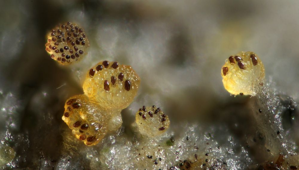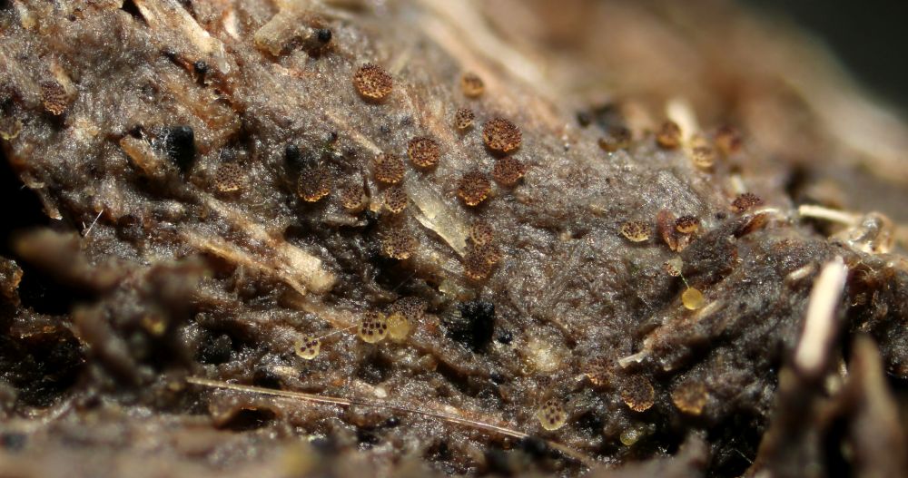 Hier im Vordergrund sind ein paar Saccobolus citrinus mit drauf. Die schwarzen Dinger sind eine 4-sporige Podospora mit Tuberkeln, die wird auch noch interessant.