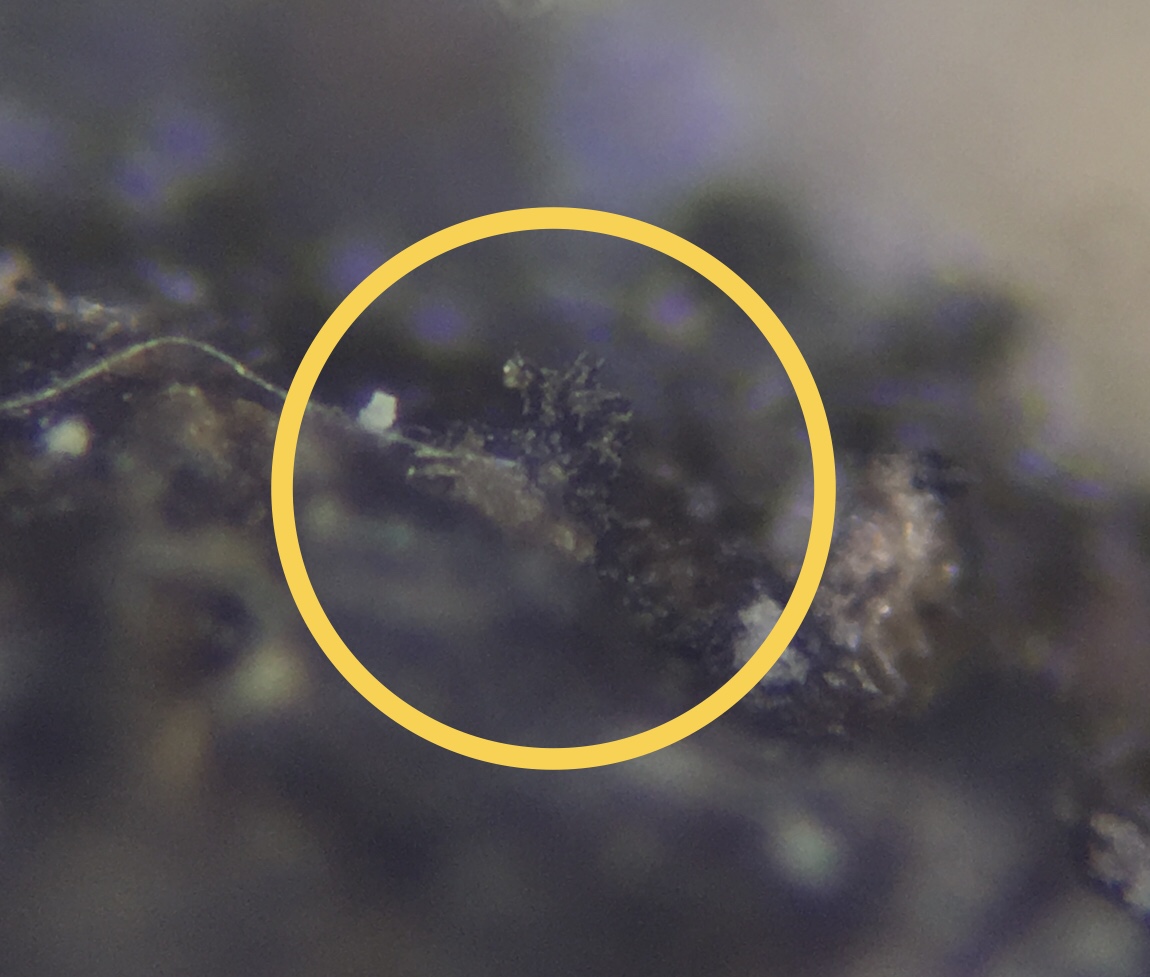 Es passt nun wirklich das meiste - Sporengröße, der Keimschlitz, daß Zellen so schnell auseinanderbrechen. Und es sieht ja auch wie weiße Haare um den Pseudothecienhals (unten noch einmal ein Bild). Das einzige was nicht passt, ist daß ich keine Haare unterm Mikroskop sehe, und ich habe es mehrfach versucht sie zu finden. Angetrocknete Asci wären da eine bessere Erklärung.