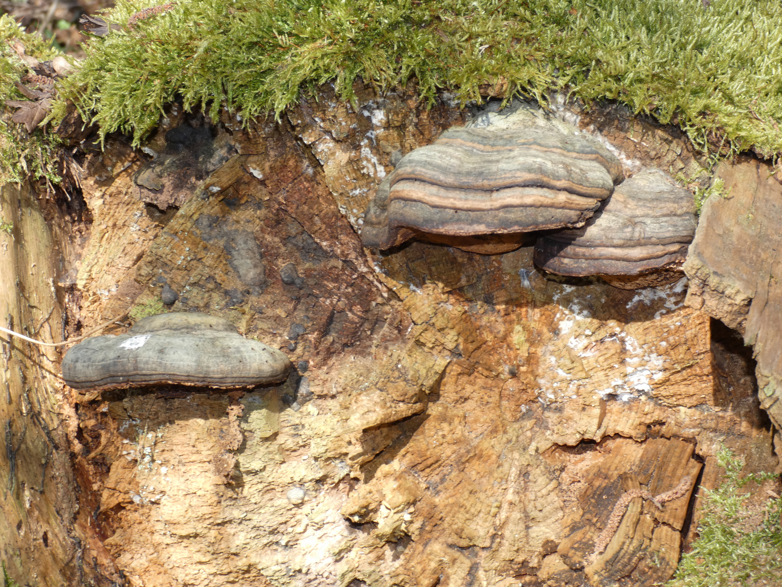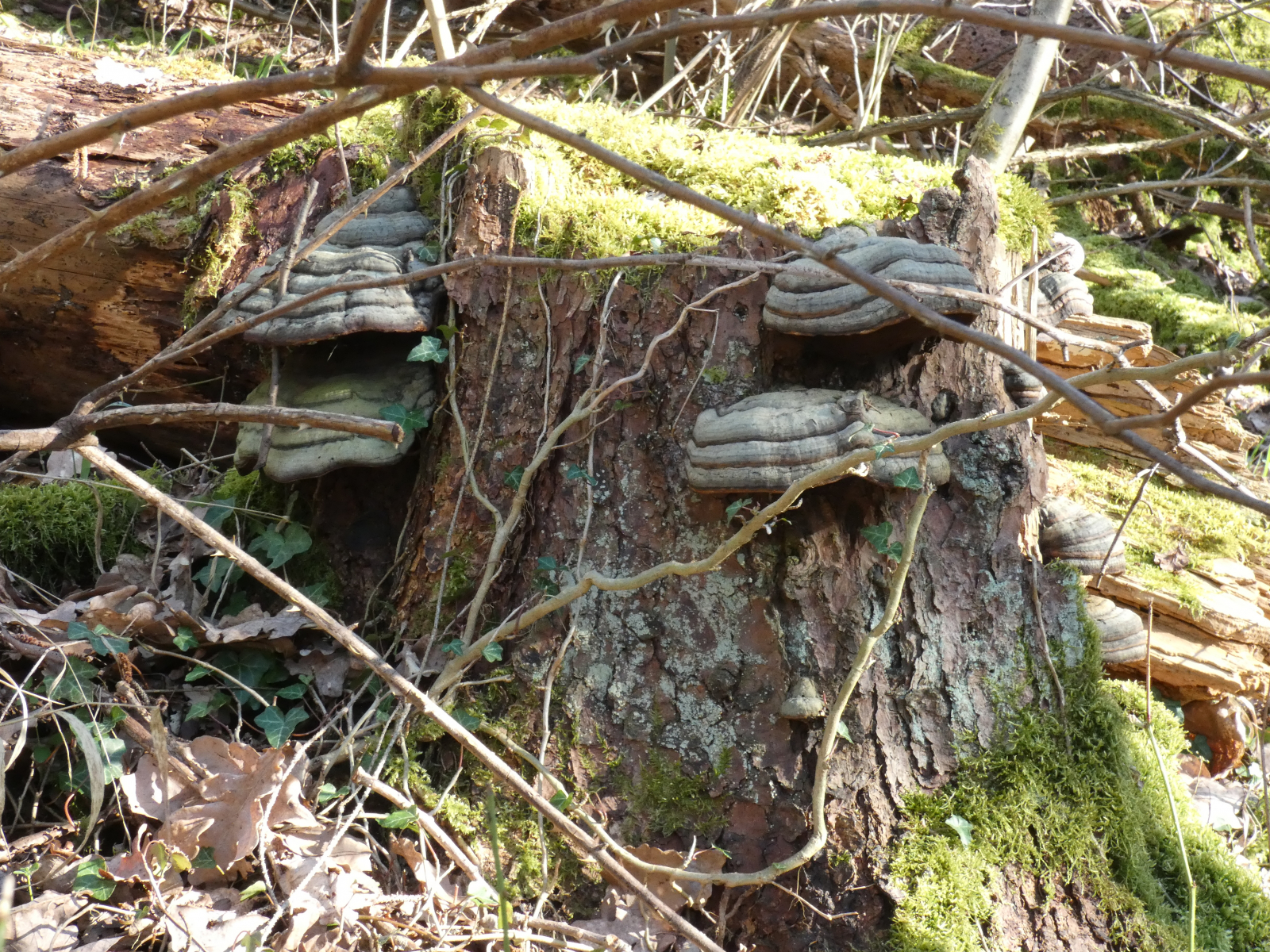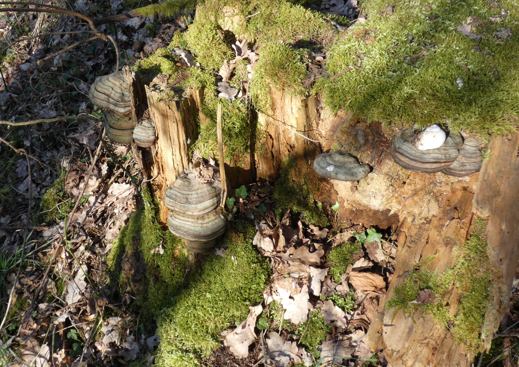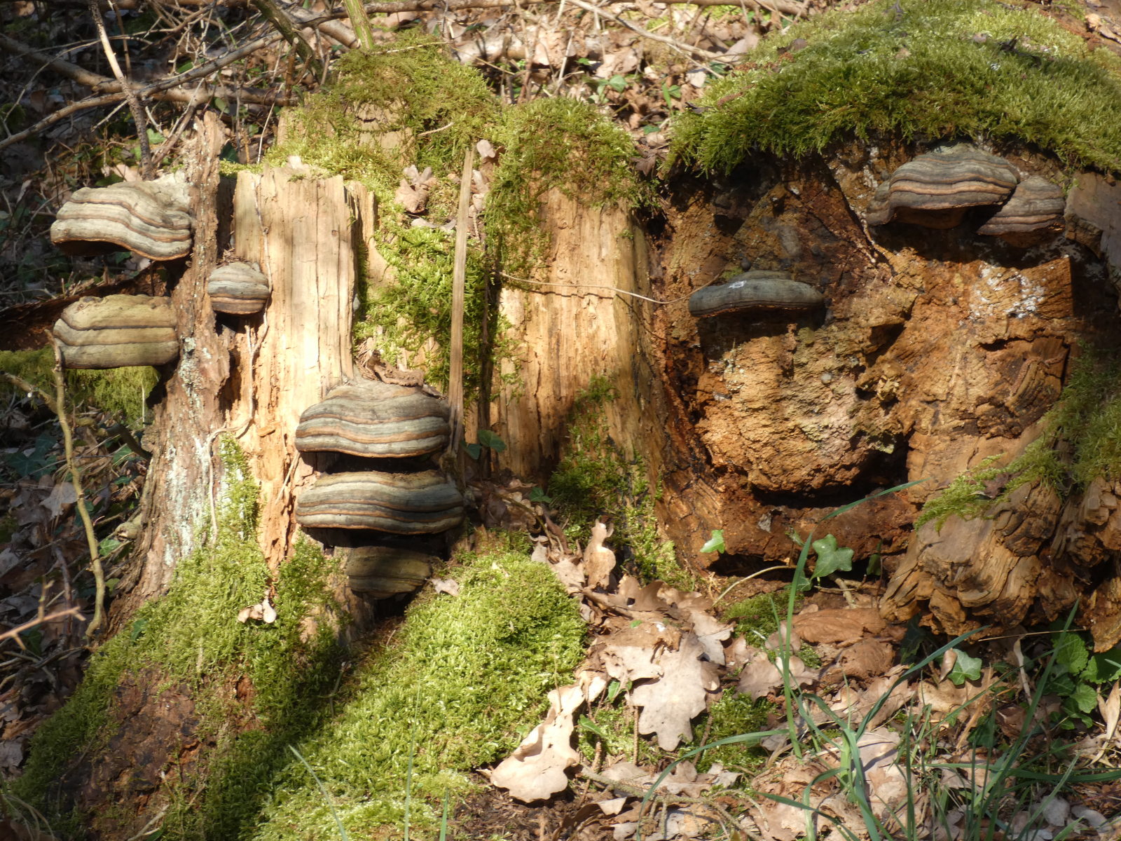 Gestern, im schönsten Sonnenschein in einem Wald in unserer NĂ€he, machte ich zwei schöne Funde: zuerst einen gefallenen Baumstamm und dessen Stumpf, wundervoll besetzt mit - ich glaube - ZunderschwĂ€mmen. Korrigiert mich bitte, wenn ich falsch liege! Diese Fotos machte Mr. Kagi fĂŒr mich.