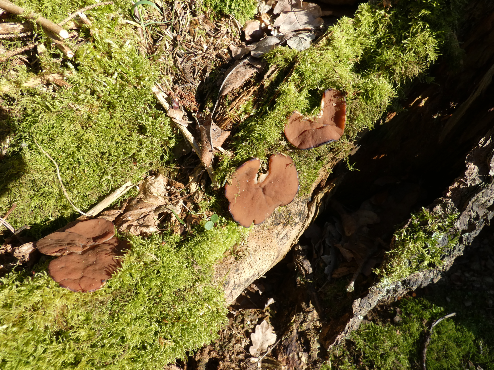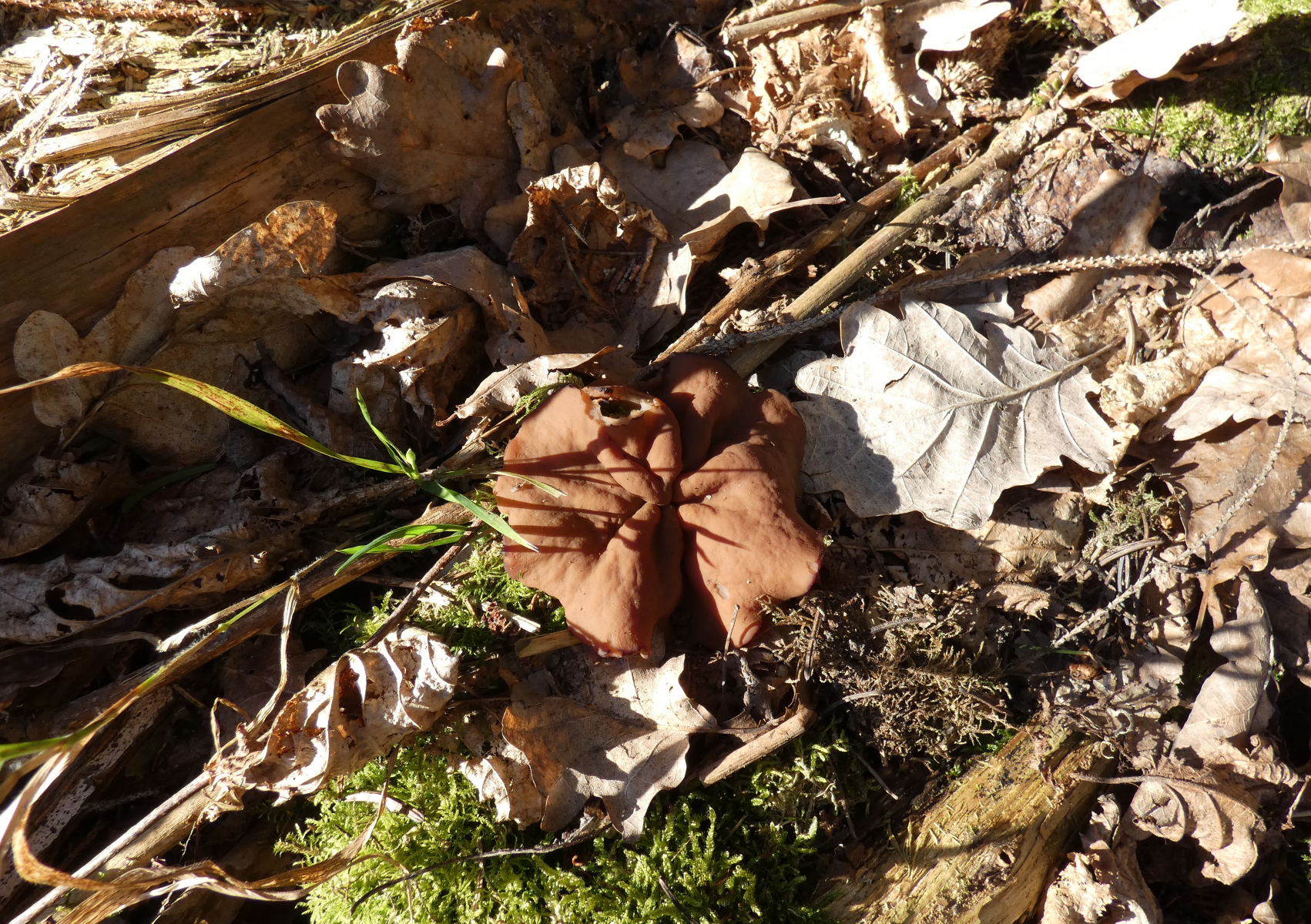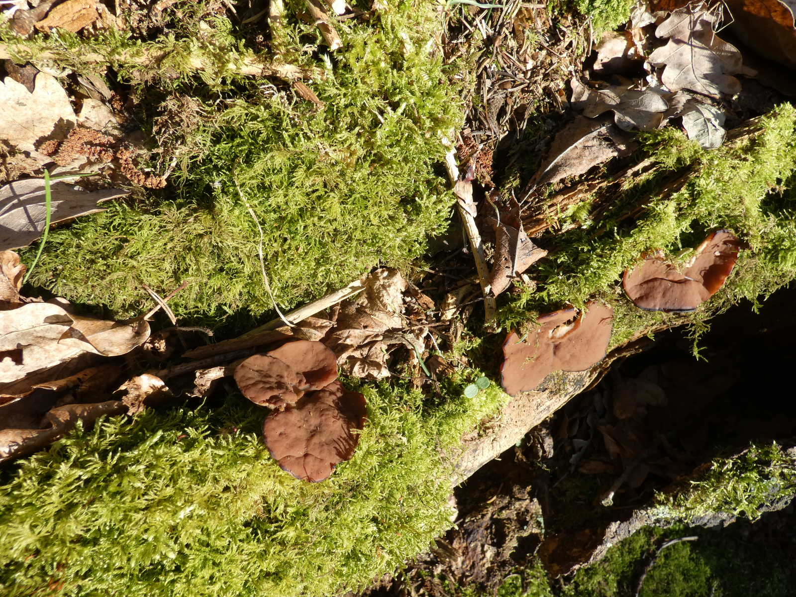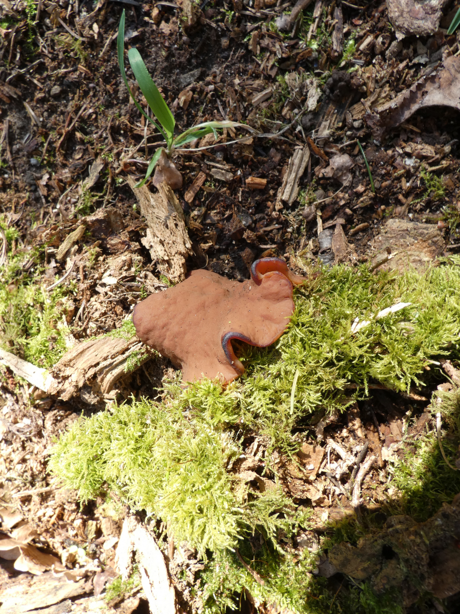 Vom Weg aus erspĂ€hte ich ein paar Meter den Berg hoch "verdĂ€chtige" rotbraune, verkrumpelte Scheibchen...könnten das Scheibenlorcheln sein? Gleich bin ich mit der Kamera den Berg raufgekraxelt und habe Fotos gemacht; die Pilzchen hielten vorbildlich still, und es war schön hell, also gelangen mir ausnahmsweise mal einigermaĂen scharfe Fotos!
