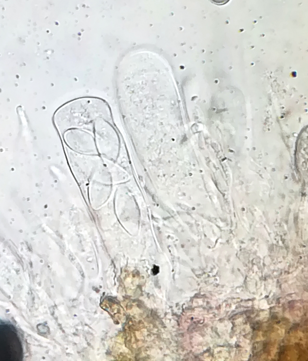 - Ich konnte keine verklebten Hyphen feststellen, fand allerdings hohle, dreieckige Elemente an den Basen der Apothecien, wobei ich nicht genau weiß, ob die dazu gehören oder aus dem Substrat stammen