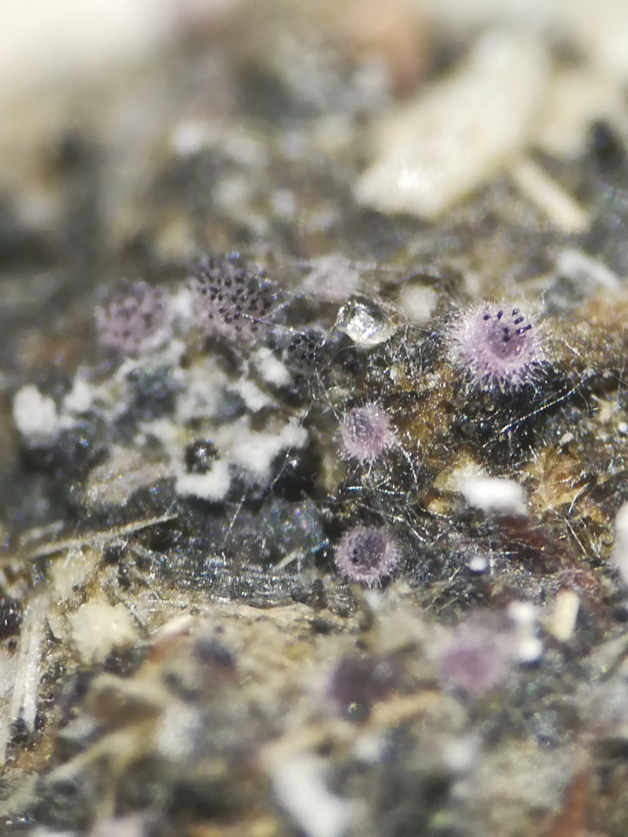 - Apothecien von jung bis alt lila gefärbt und von Hyphenkränzen umgeben