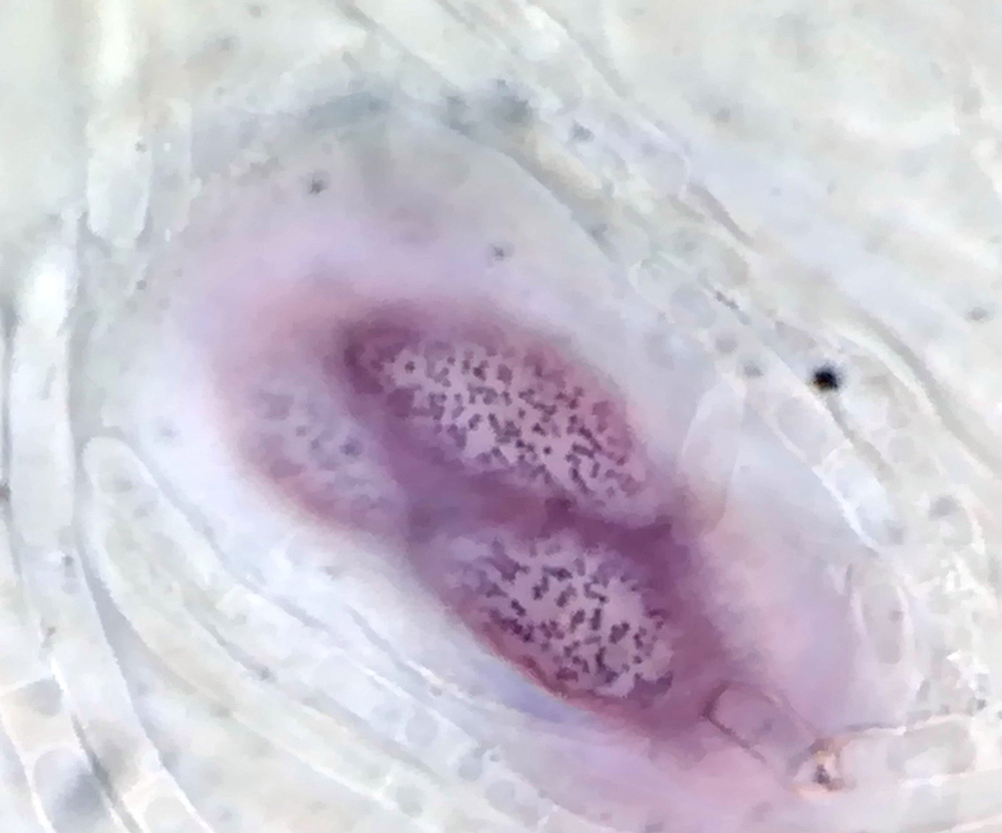 - Die Sporen sind fein punktiert bis leicht gratig ornamentiert. Das Sporenornament ist mit meinem Mikroskop allerdings vor allem bei den jungen, blasslila gefärbten Sporen zu erkennen, bei den alten dunklen ist es vorhanden, allerdings schwer zu sehen und für mich fast unmöglich zu fotografieren. Die Sporen messen 16 - 17,5 x 7 - 8 µm