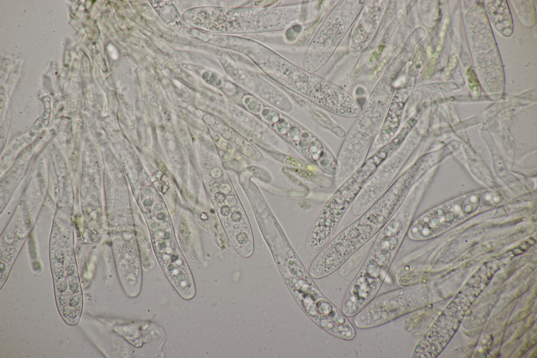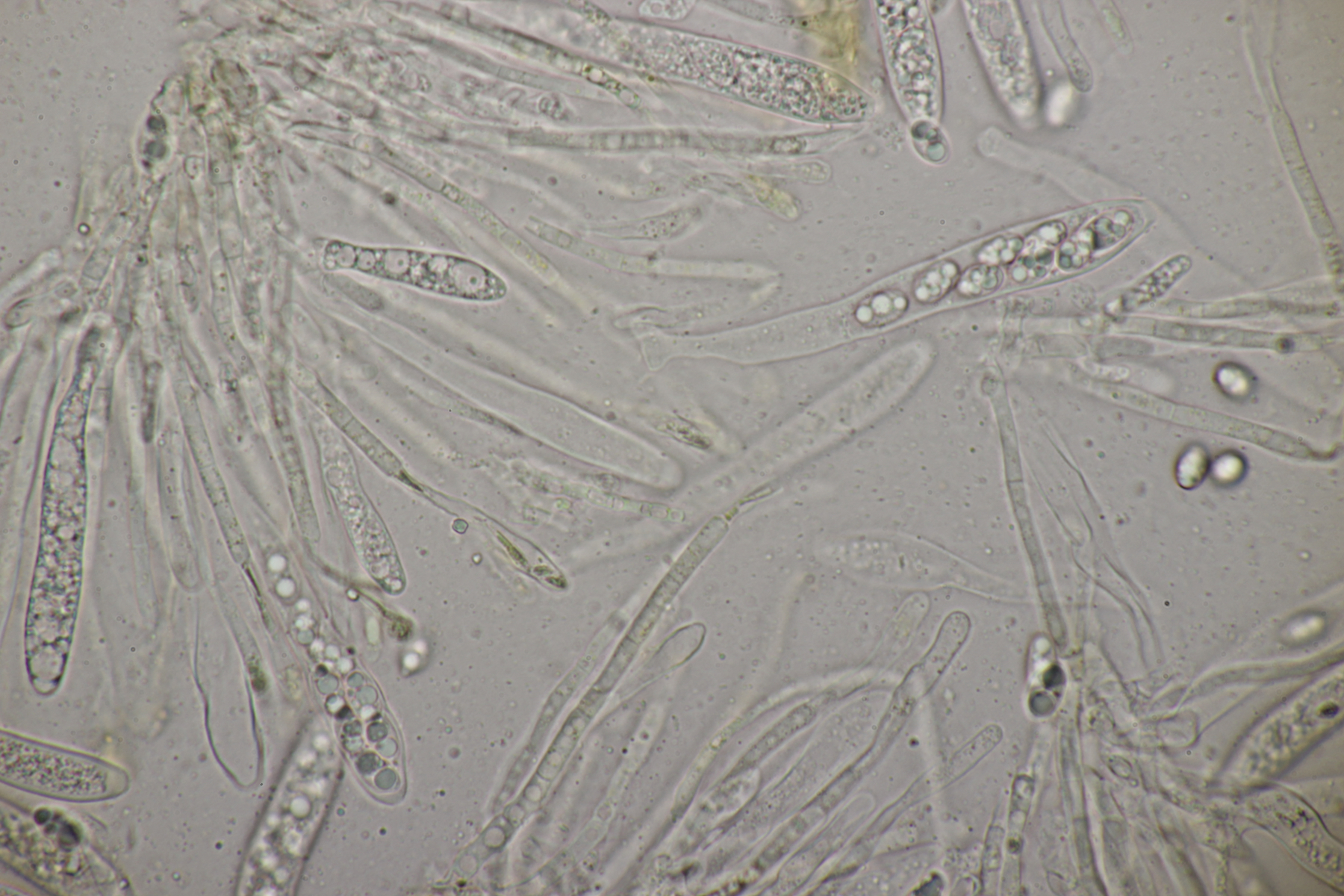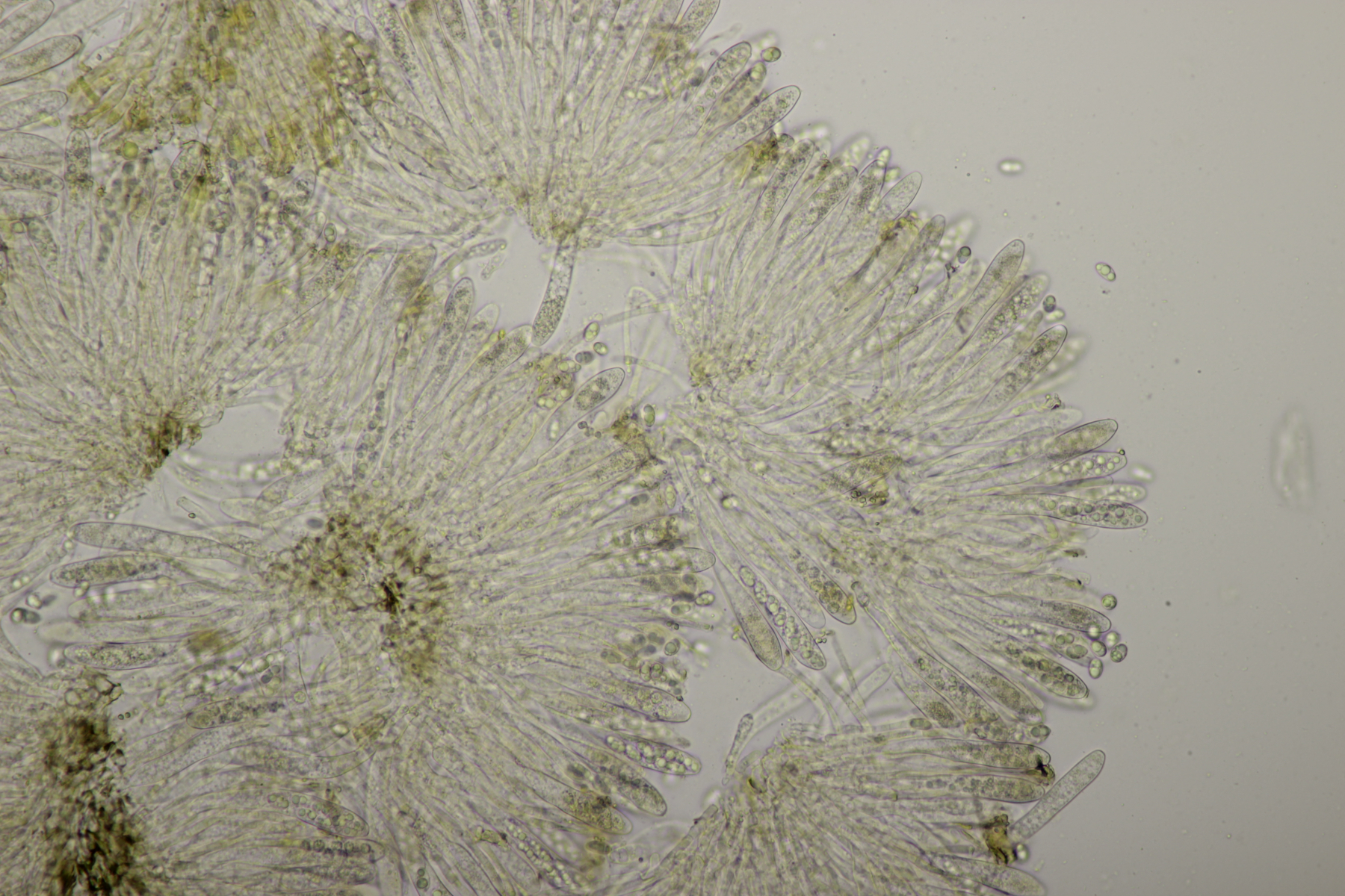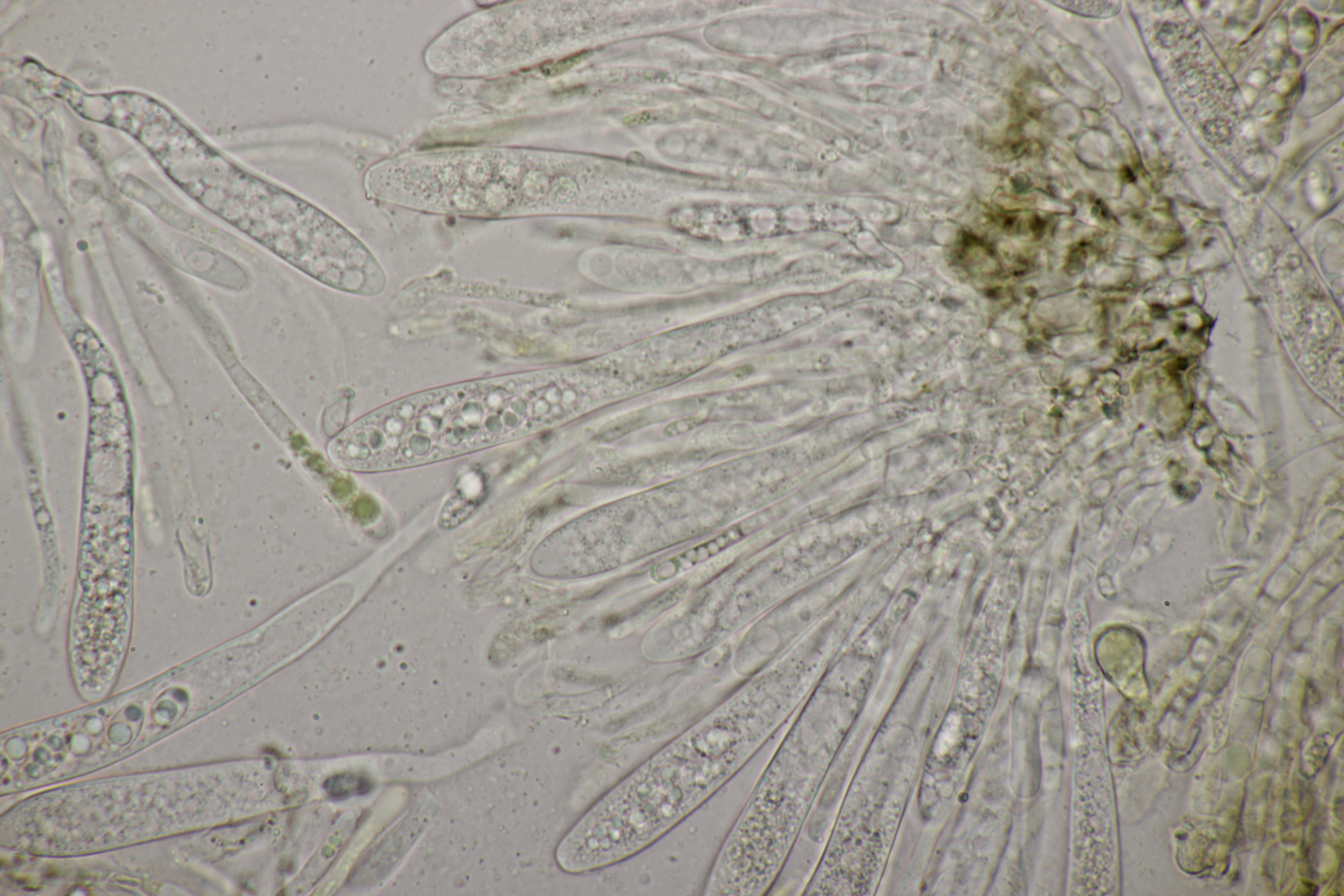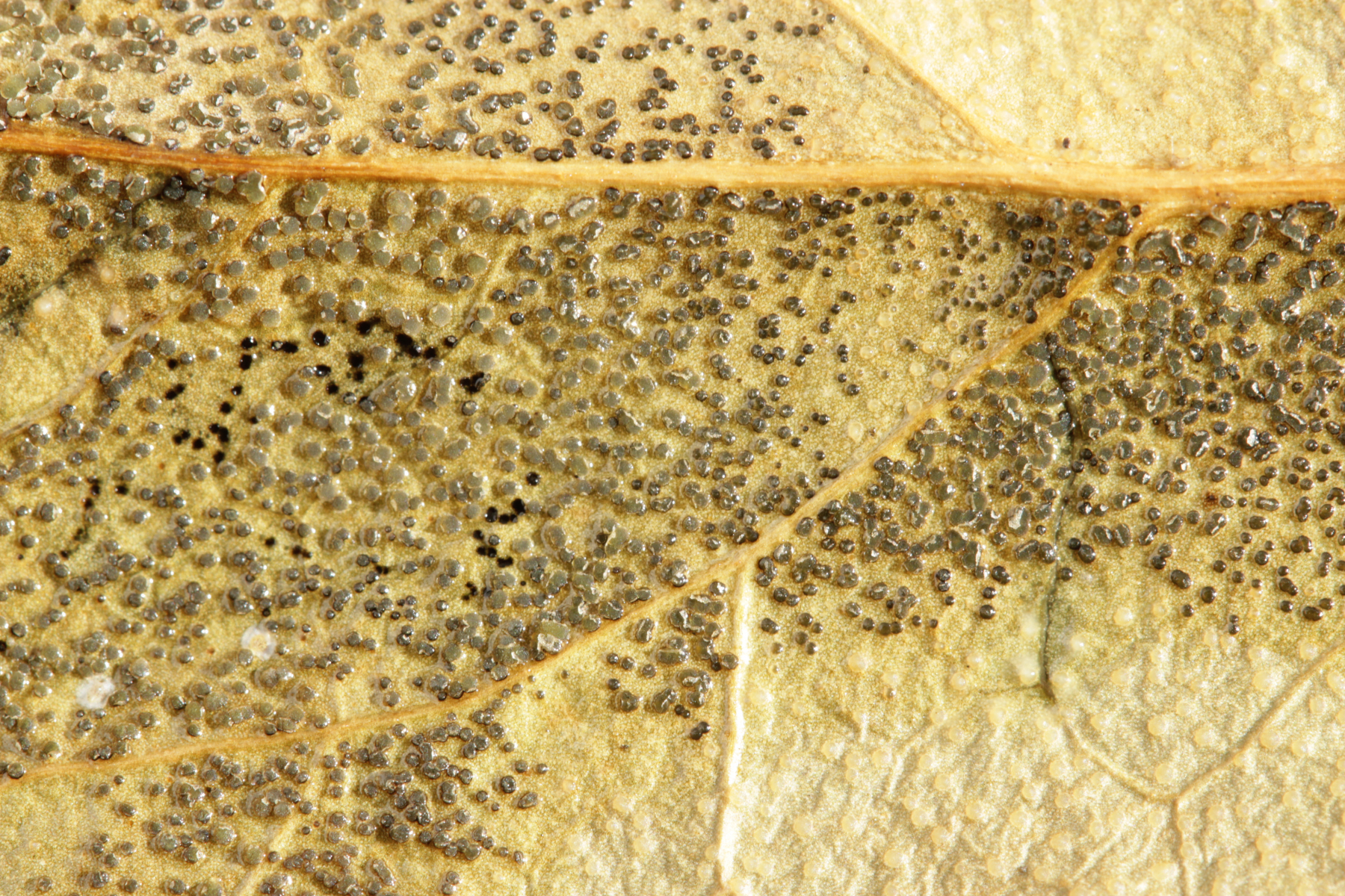 6. Trochila craterium ex Hedera helix, sowohl Teleomorphe (dunkle Punkte) als auch Anamorphe (helle Punkte, früher auch als Cryptocline paradoxa bekannt)