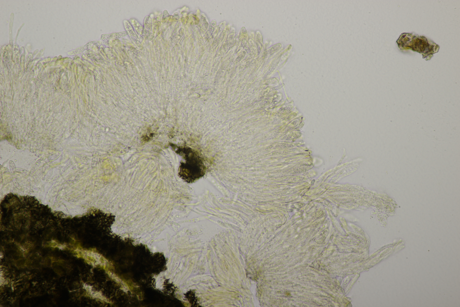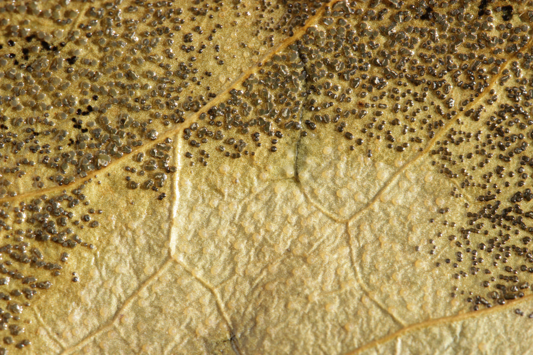 6. Trochila craterium ex Hedera helix, sowohl Teleomorphe (dunkle Punkte) als auch Anamorphe (helle Punkte, früher auch als Cryptocline paradoxa bekannt)