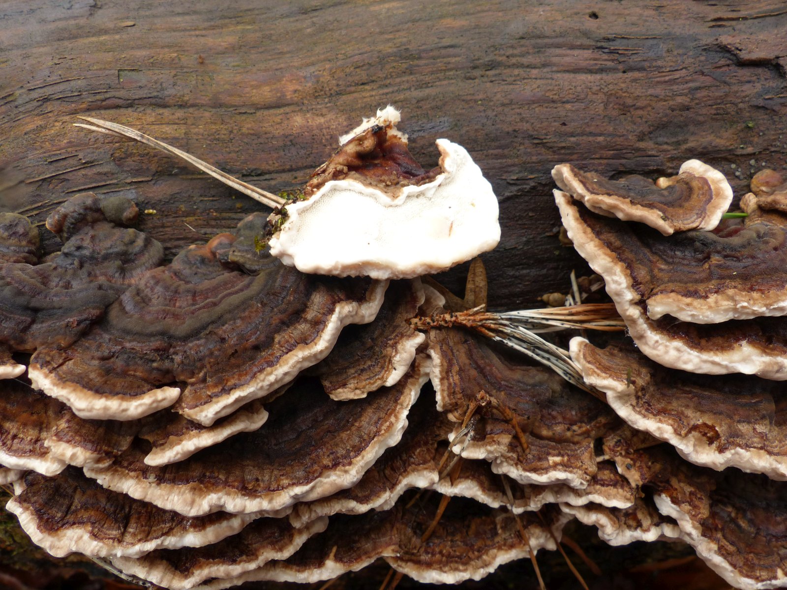 Frisch recht "fleischig" (0,3 cm) und sehr dunkel. Aber eigentlich zu dick für Schmetterlingstramete. Erinnert mich farblich eher an einen Wurzelschwamm.