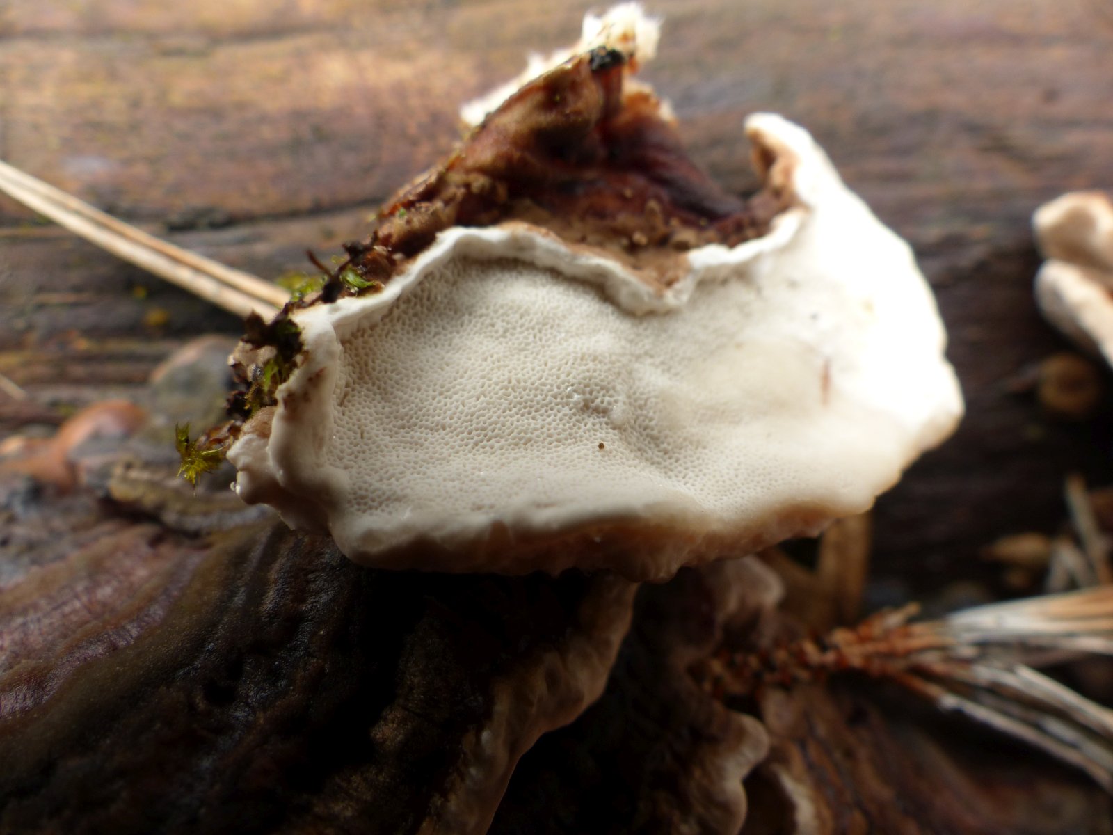 Hier habe ich ein Exemplar, welches stark striegelig ist. Die Anwachstelle ist 1cm dick und die Sporen sind eigentlich für die Striegelige Tramete zu dick.