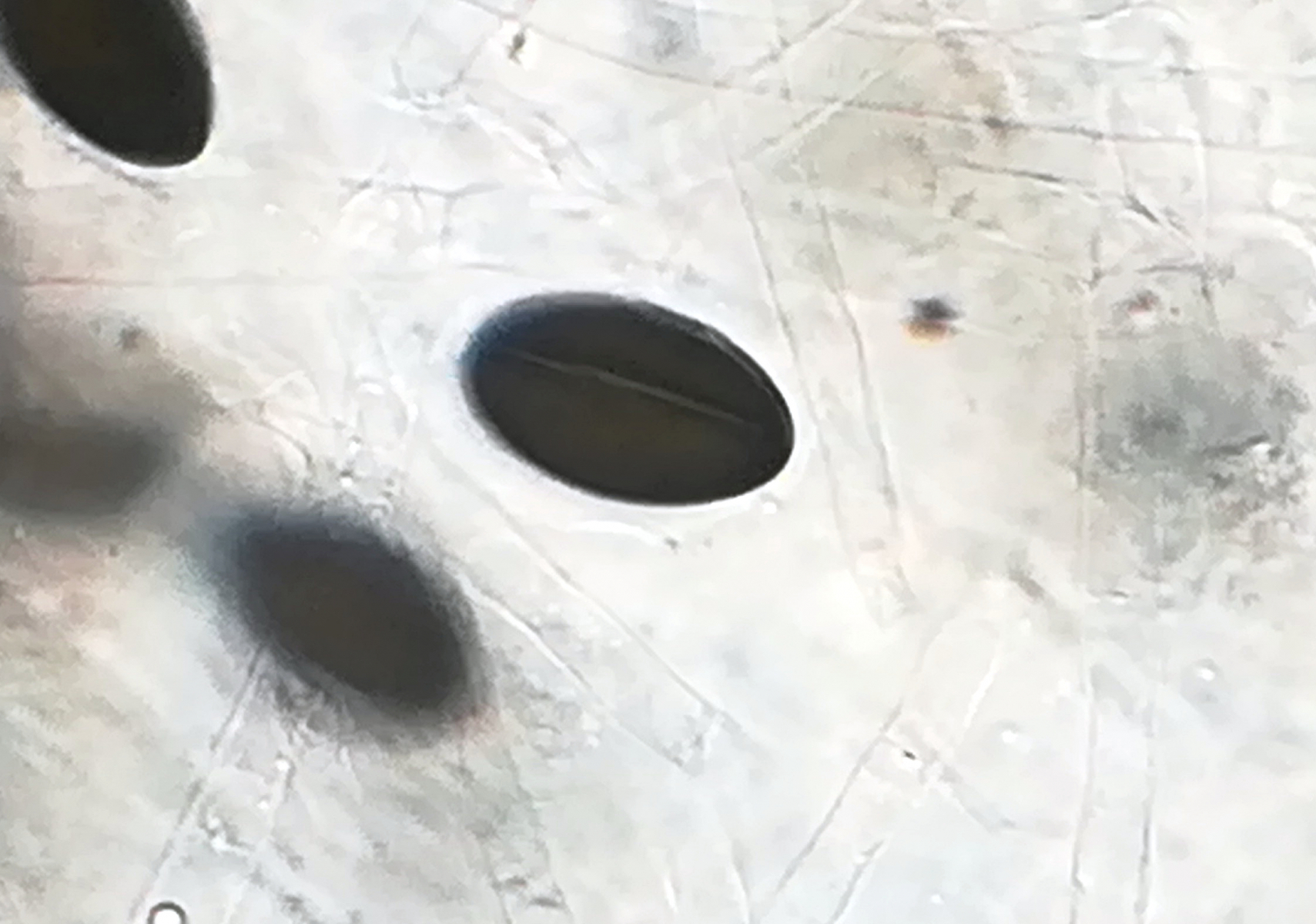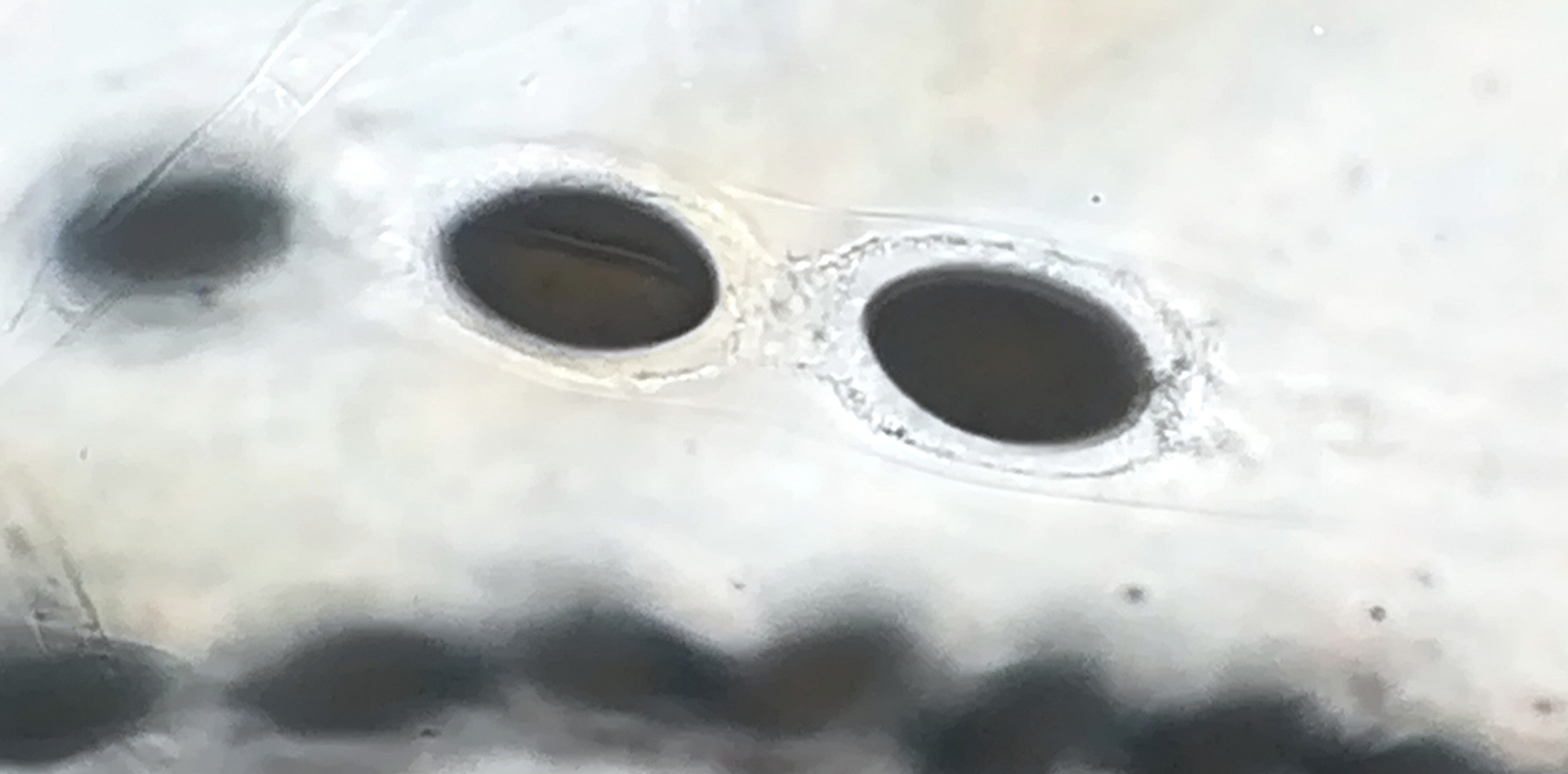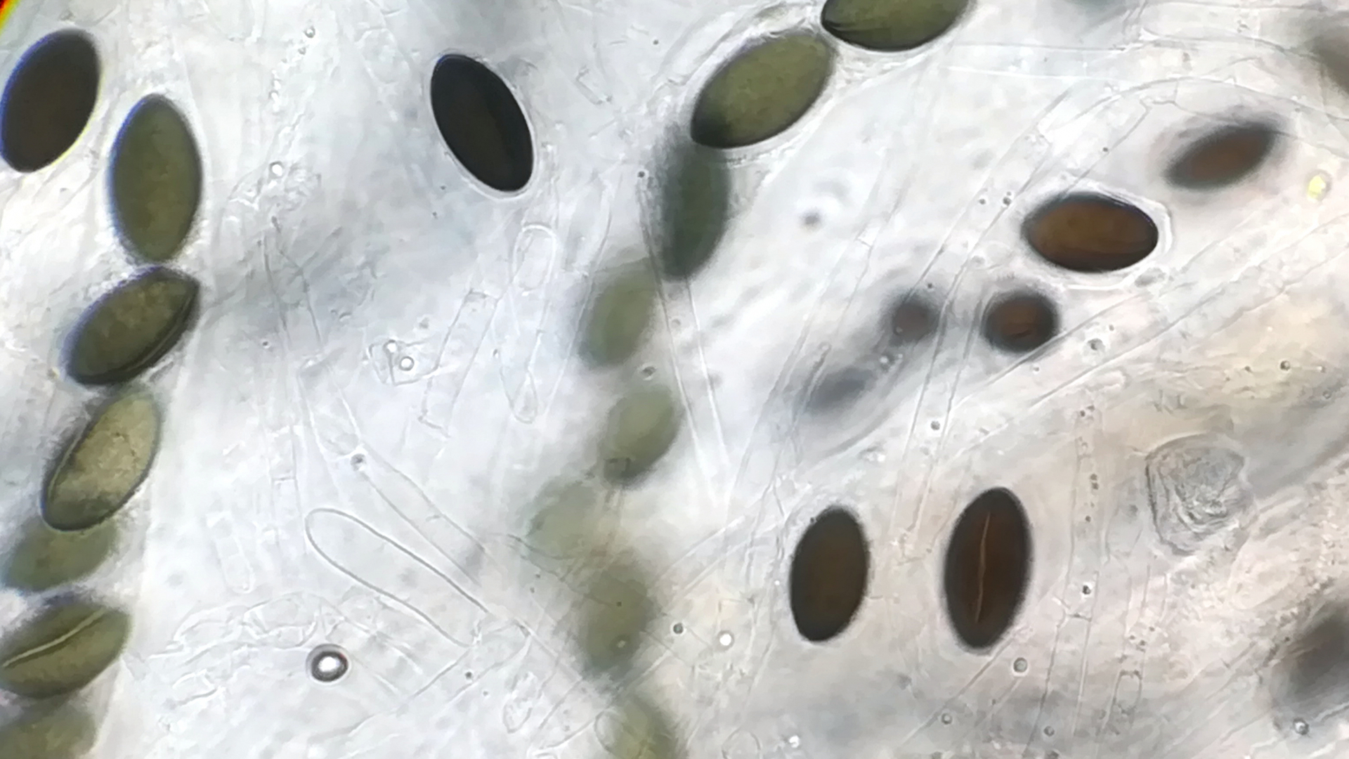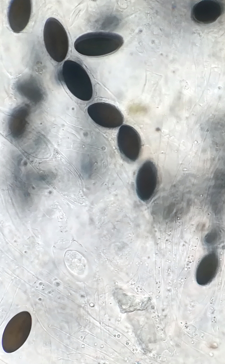 auf Kaninchen aus dem Tietlinger Wacholderhain zeigte sich auf einer Probe neben Delitschia didyma ein großes Perithecium einer Art, die sich unter dem Mikroskop als Hypocopra herausstellte. Nun lief es dann ganz blöd, nachdem die Stunde schon fortgeschritten war, hakte ich die Art vorschnell als Hypocopra brefeldii ab. Im Nachhinein kamen mir jedoch Zweifel auf, allerdings hatte ich nicht das volle Bestimmungsprogramm (Zweizelligkeit der Sporen und Reaktion der Asci auf Lugol) geprüft. Nachdem die Sporen jedoch an den Enden zugespitzt sind und die Keimspalten überwiegend über die komplette Länge der Sporen verlaufen denke ich, dass es nicht brefeldii ist und hoffe, dass jemand von euch eine gute Idee dazu hat. Zu allem Überfluss zeigte sich bisher kein weiteres Perithecium... Die Sporen messen 23,5 - 26,7 x 12,6 - 14,1 µm.
