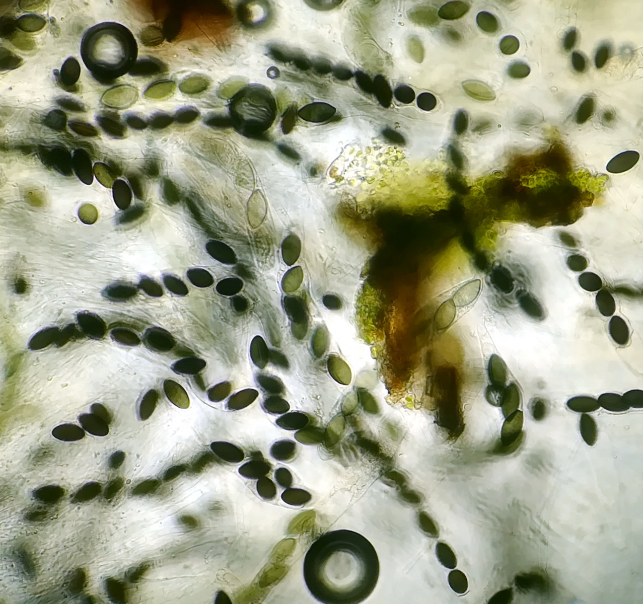 auf Kaninchen aus dem Tietlinger Wacholderhain zeigte sich auf einer Probe neben Delitschia didyma ein großes Perithecium einer Art, die sich unter dem Mikroskop als Hypocopra herausstellte. Nun lief es dann ganz blöd, nachdem die Stunde schon fortgeschritten war, hakte ich die Art vorschnell als Hypocopra brefeldii ab. Im Nachhinein kamen mir jedoch Zweifel auf, allerdings hatte ich nicht das volle Bestimmungsprogramm (Zweizelligkeit der Sporen und Reaktion der Asci auf Lugol) geprüft. Nachdem die Sporen jedoch an den Enden zugespitzt sind und die Keimspalten überwiegend über die komplette Länge der Sporen verlaufen denke ich, dass es nicht brefeldii ist und hoffe, dass jemand von euch eine gute Idee dazu hat. Zu allem Überfluss zeigte sich bisher kein weiteres Perithecium... Die Sporen messen 23,5 - 26,7 x 12,6 - 14,1 µm.