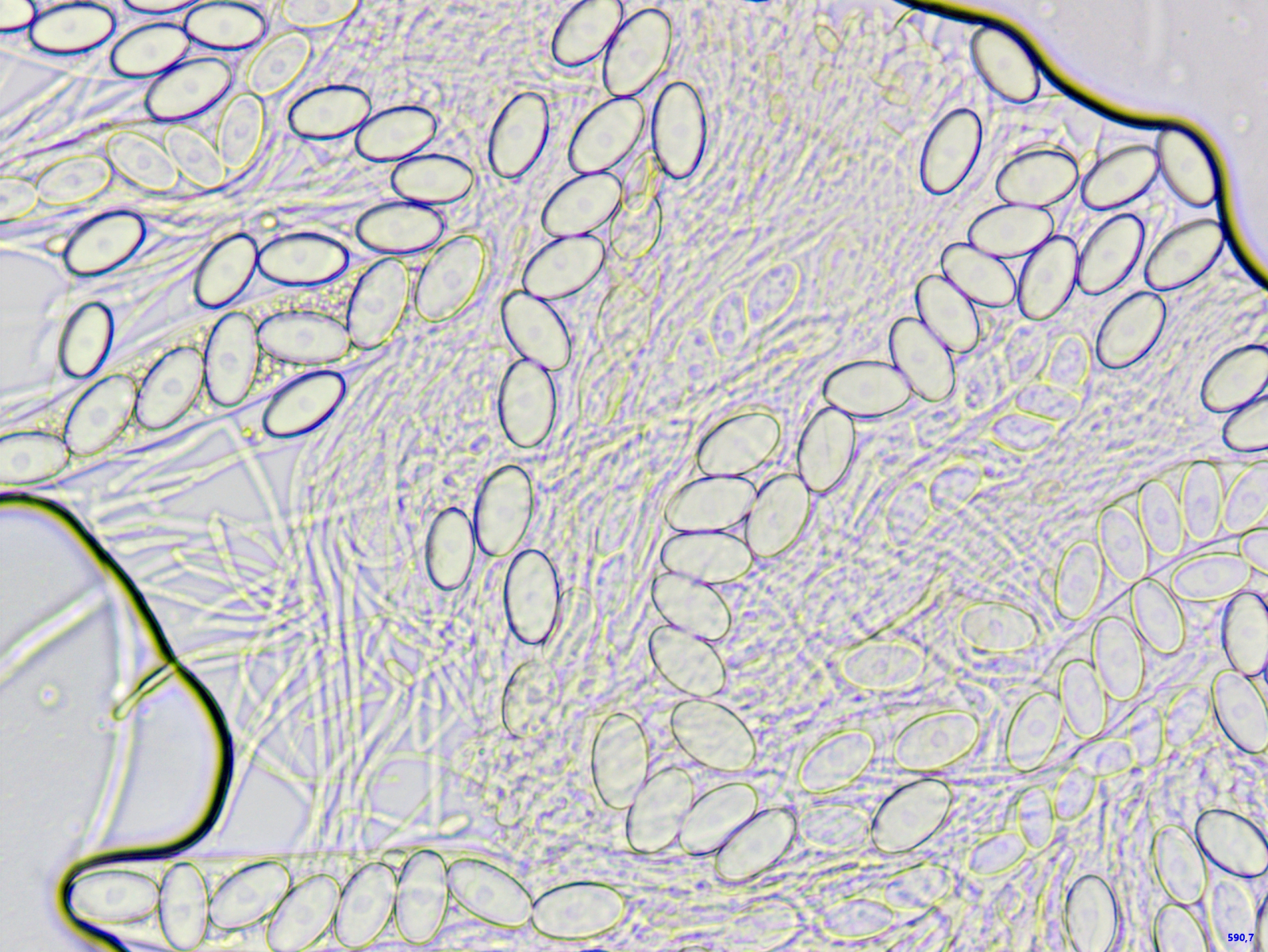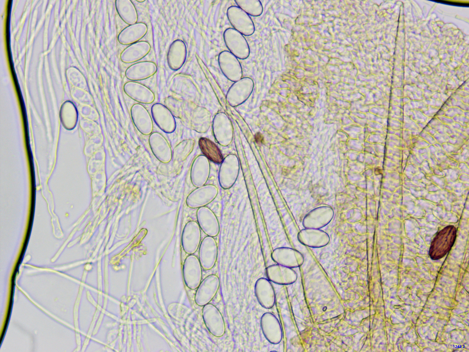 Die Setae werden maximal 25 Mikrometer an der Basis, sind bis zu 270 Mikrometer lang. Die Sporen sind stellenweise biseriat (s. 1 Bild Asci v.o. ) , was mich nach Bezerra & Kimborough zu cuniculi bringen würde... oder war das bloß ein Ausrutscher? Zwei Asci machen noch lange keinen cuniculi?