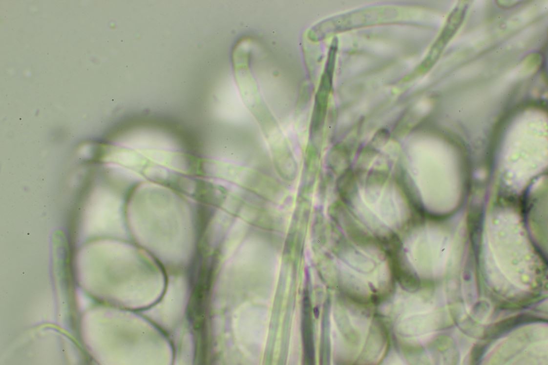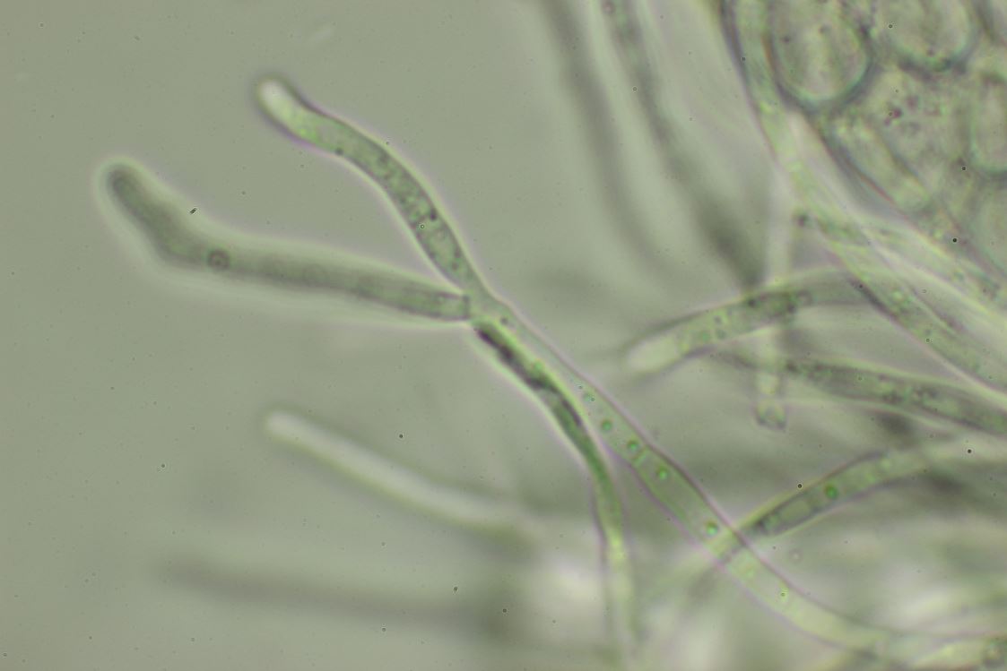 Paraphysen; septiert, ohne Farbpigmente, aber mit lichtbrechenden Tröpfchen, Spitze nicht erweitert.