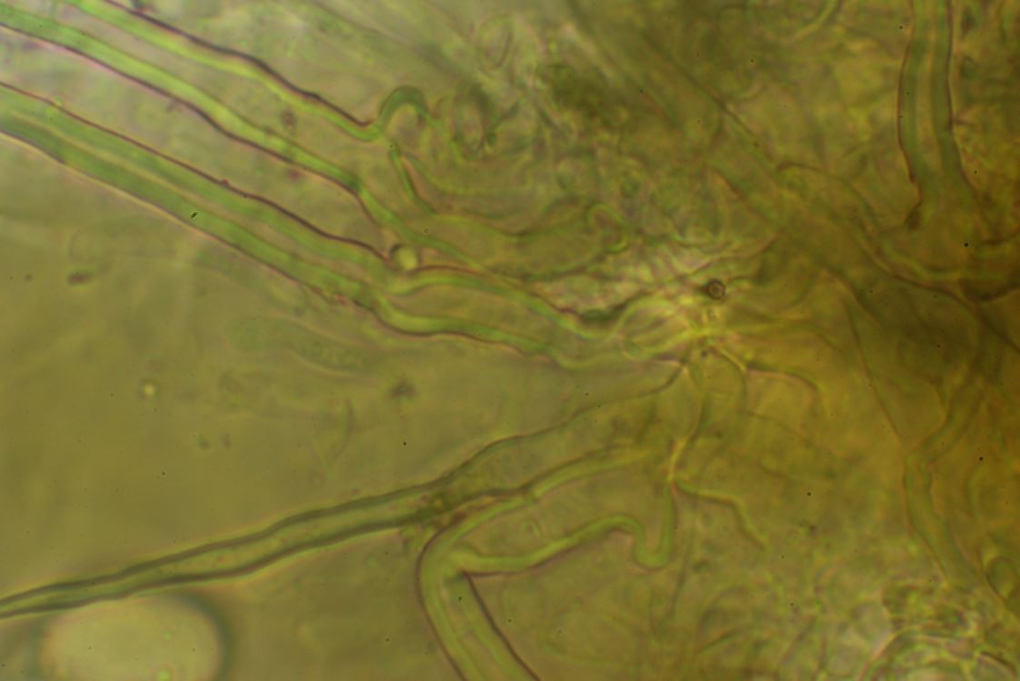 Haare; hyalin, dickwandig, nicht septiert, Basis oft zweifach tief wurzelnd, bis 190 mü. lang, an der Basis bis 7 mü. breit. Basiswurzeln teils knorrig, bis 40 mü. lang.