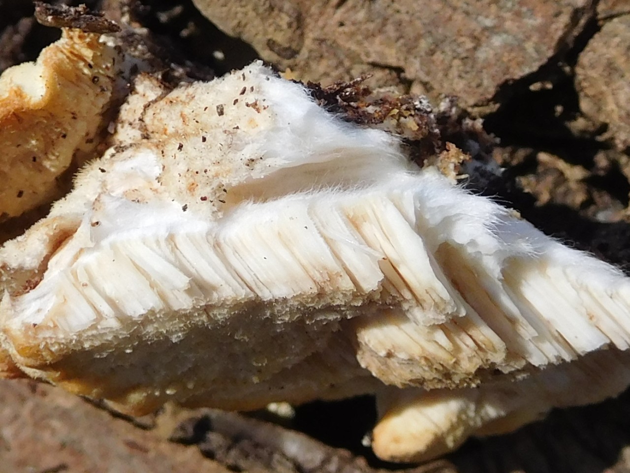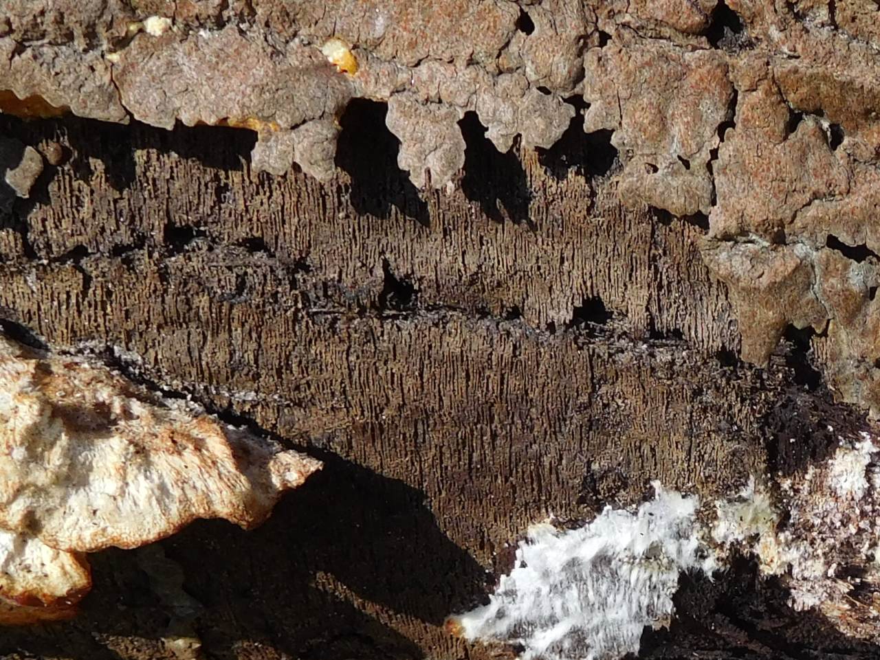 Aber was ist das auf dem ersten Bild. Ich habe es etwas vergrößert. Links die Trameten von Oben, rechts das Weiße, eine Abbruchstelle. Darüber und dazwischen eine seltsame Struktur. Was kann das sein, etwas pilzliches?