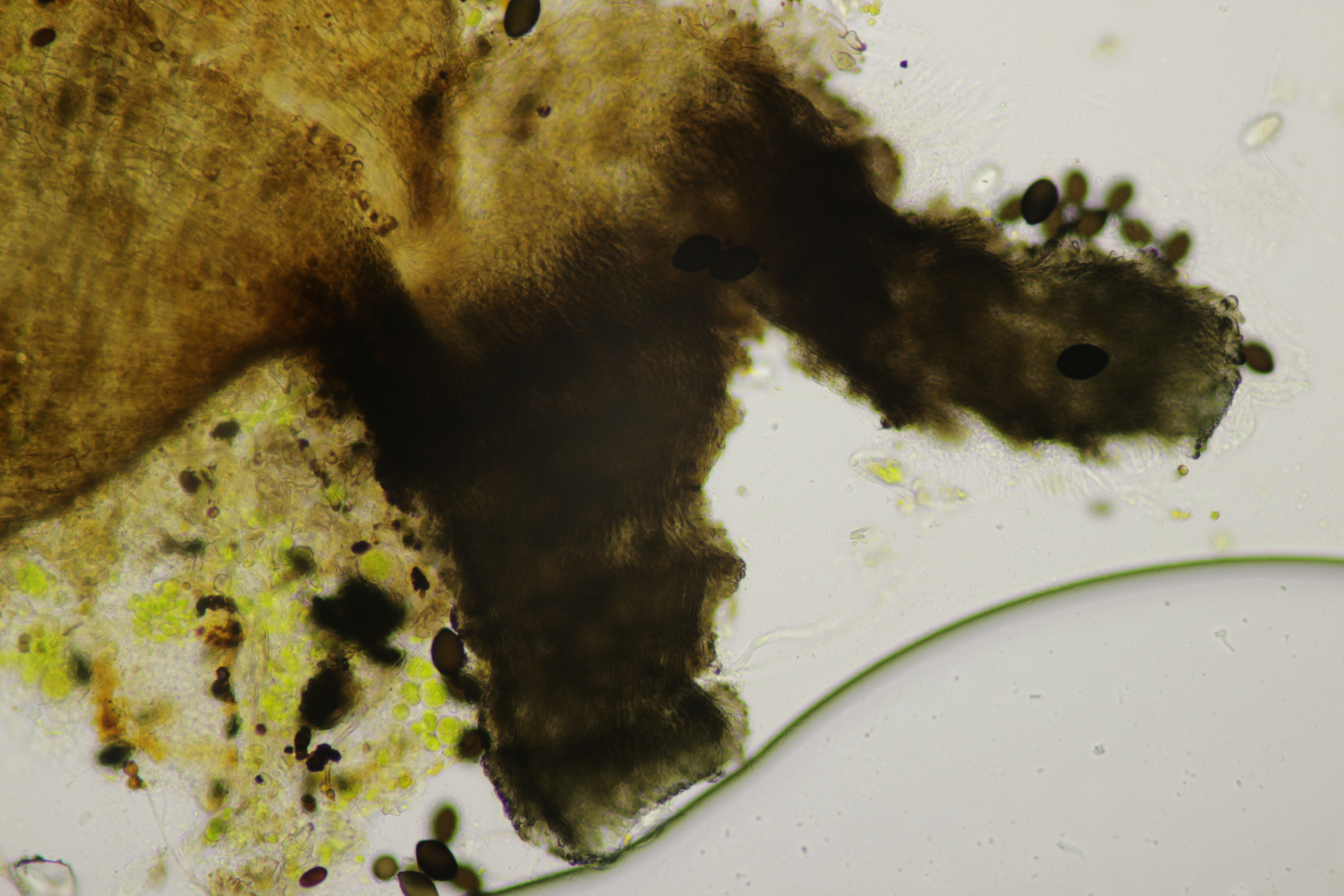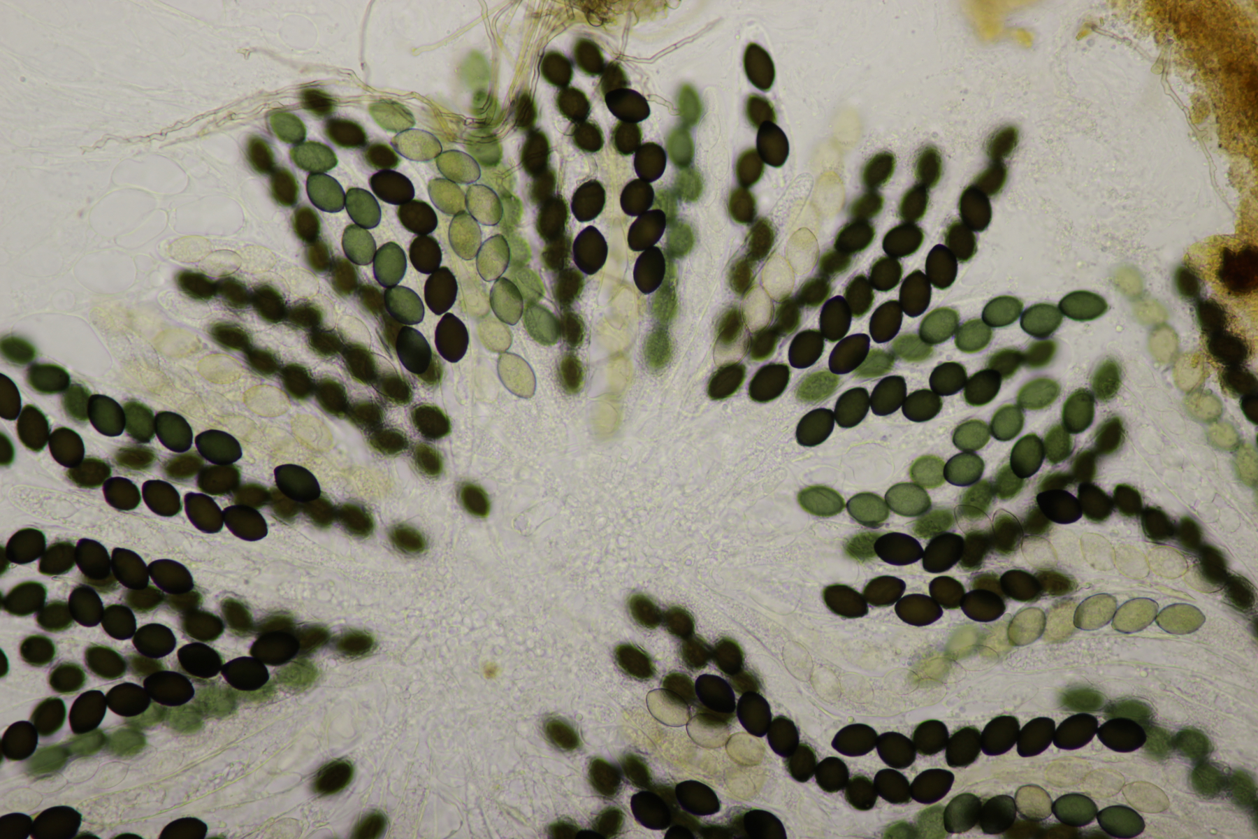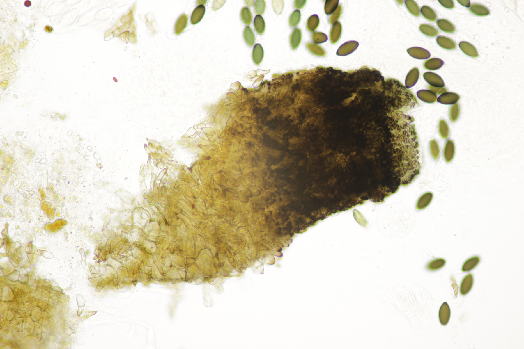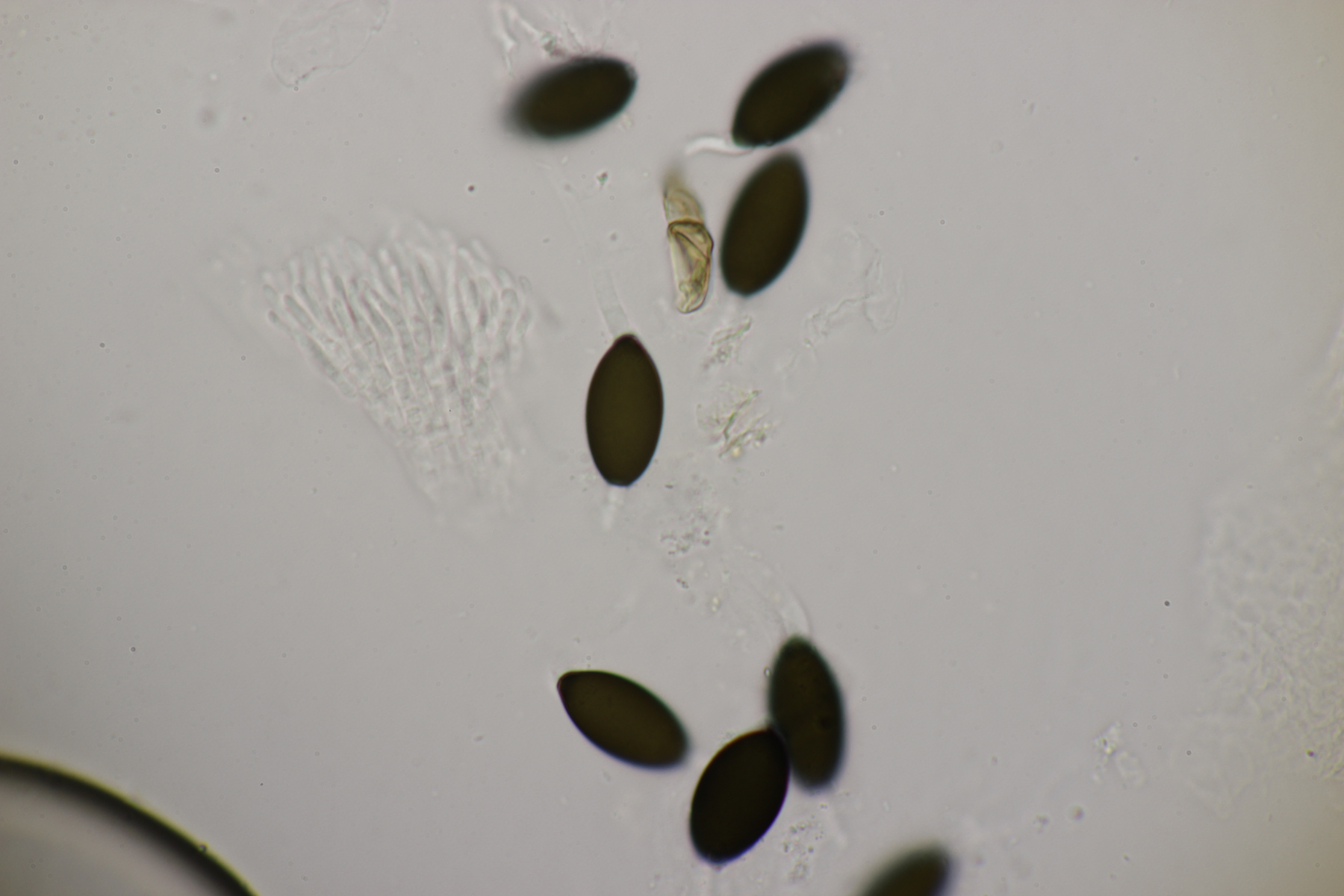 Fund Nummer 2 von heute, war der Versuch Nummer 1 wiederzufinden. Sporengröße (20-22) µm x (13-14) µm und auch sonst sieht das alles recht ähnlich aus wie bei Nr. 1. Was die Sporengröße angeht, wäre das beides etwas zu groß für S. vesticola. Aber sind die Haare hier zusammengeklebt? Wenn sie das nicht sind, lande ich dann schließlich bei S. miniglutinans.