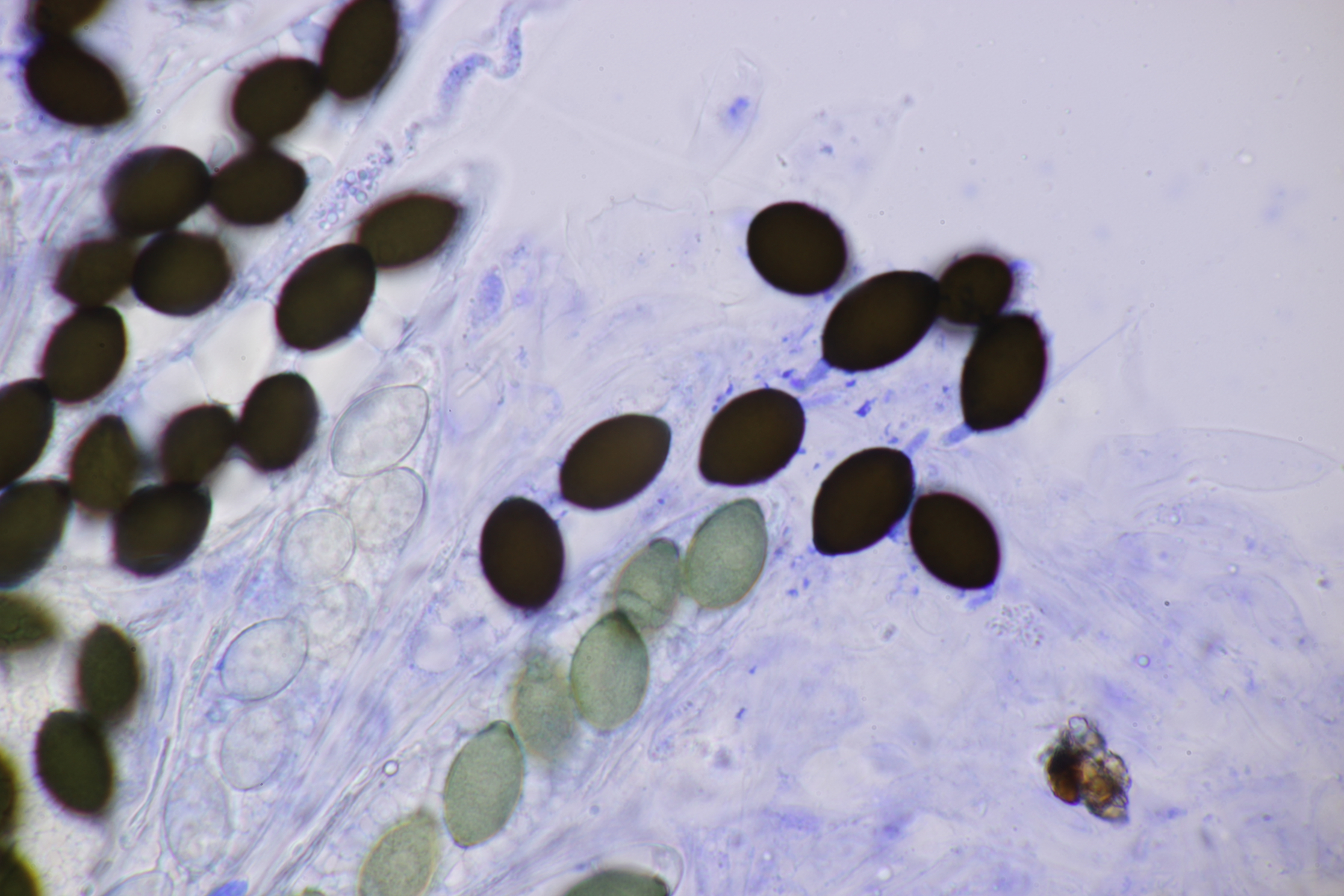 Fund Nummer 1 habe ich schon vor zwei Tage gemacht. Leider habe ich die Sporen da nicht mit Tinte angefärbt, entsprechend ist da zum Gezumpel an den Sporen wenig zu sagen. Sporengröße (20-22) µm x (13-14) µm.