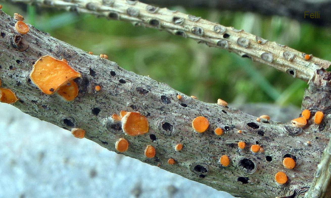 Sehr häufig in den Baumkronen oder an frisch abgefallenen Ästen ist Aleurodiscus amorphus, die Orangerote Mehlscheibe, anzutreffen.