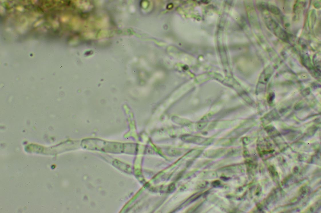 -Paraphysen; hyalin, fädig, septiert, gegabelt, wenig moniliforme, Spitze nicht erweitert, mit wenigen Tröpfchen im Inhalt.