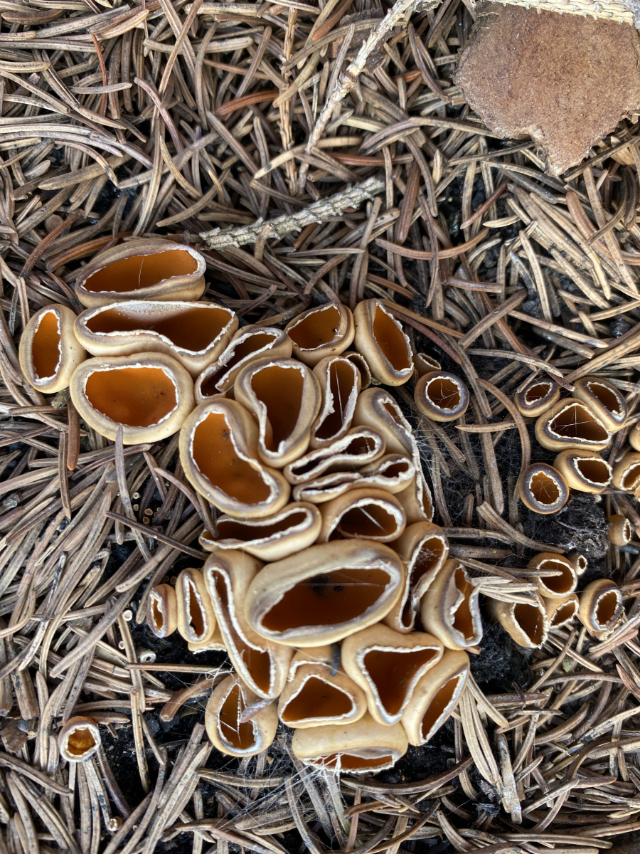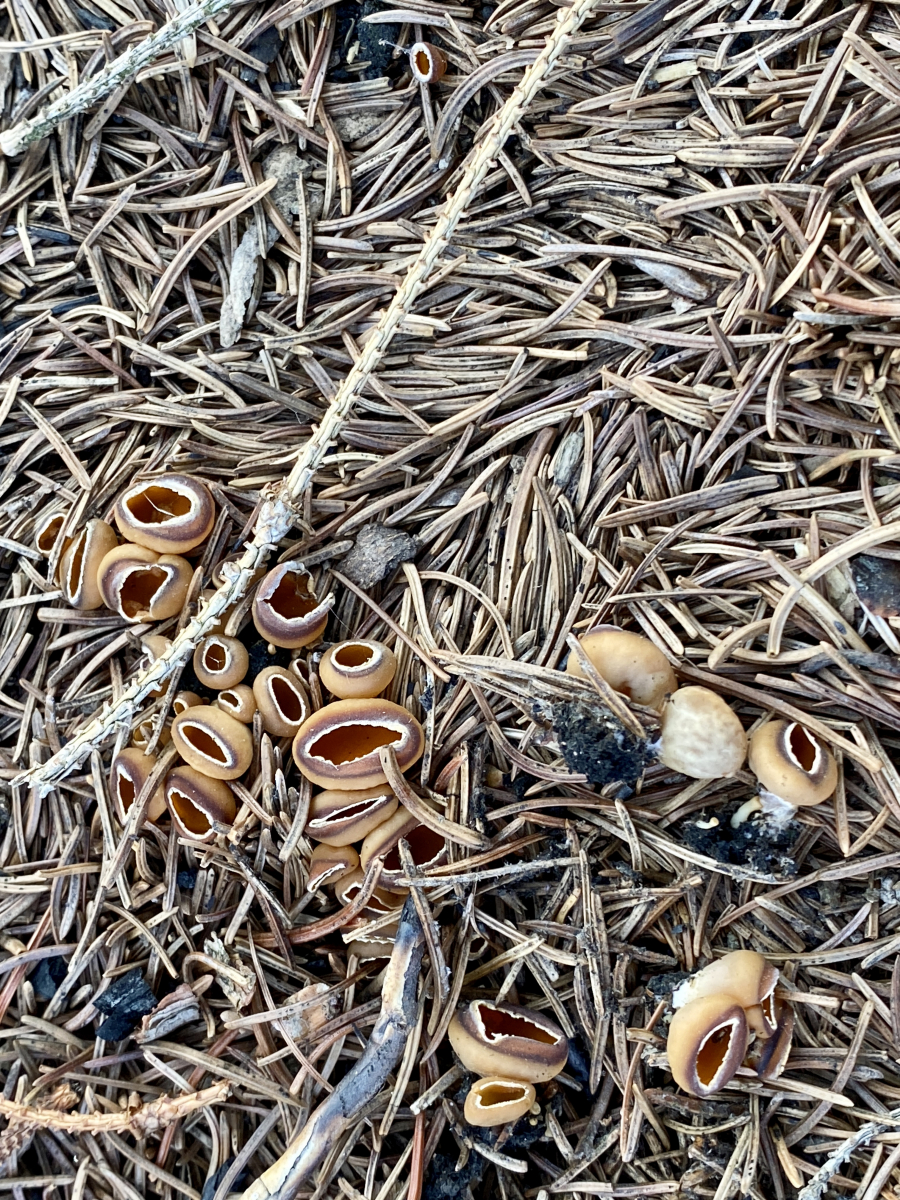 Diese becherförmigen Fungi finde ich derzeit zu Millionen auf Waldbrandboden (Brand April 2019). Tatsächlich unzählige Exemplare.
